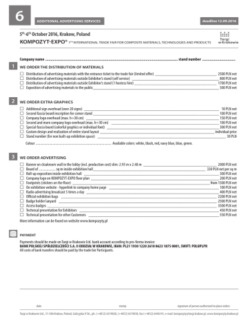 6 deadline 12.09.2016 ADDITIONAL ADVERTISING SERVICES 5th-6th October 2016, Krakow, Poland KOMPOZYT-EXPO® 7 INTERNATIONAL TRADE FAIR FOR COMPOSITE MATERIALS, TECHNOLOGIES AND PRODUCTS TH Company name ............................................................................................................................. stand number ................................ 1 WE ORDER THE DISTRIBUTION OF MATERIALS ££ ££ ££ ££ 2 Distribution of advertising materials with the entrance ticket to the trade fair (limited offer)____________________________ 2500 PLN net Distribution of advertising materials outside Exhibitor’s stand (self service)_______________________________________ 800 PLN net Distribution of advertising materials outside Exhibitor’s stand (1 hostess hire)_____________________________________ 1700 PLN net Exposition of advertising materials to the public________________________________________________________ 500 PLN net WE ORDER EXTRA GRAPHICS ££ ££ ££ ££ ££ ££ ££ Additional sign overhead (over 20 signs) ____________________________________________________________ 10 PLN net Second fascia board inscription for corner stand ________________________________________________________ 100 PLN net Company logo overhead (max. h=30 cm) ___________________________________________________________ 150 PLN net Second and more company logo overhead (max. h=30 cm) ________________________________________________ 100 PLN net Special fascia board (colorful graphics or individual font) __________________________________________________ 300 PLN net Custom design and realization of entire stand layout ___________________________________________________ individual price Stand number (for non built-up exhibition space) _________________________________________________________ 30 PLN Colour ...................................................................................... Available colors: white, black, red, navy blue, blue, green. 3 WE ORDER ADVERTISING ££ Banner on cloakroom wall in the lobby (incl. production cost) dim: 2.93 m x 2.48 m_________________________________ 2000 PLN net ££ Board of ................... sq m inside exhibition hall__________________________________________________ 330 PLN net per sq m ££ Roll-up exposition inside exhibition hall____________________________________________________________ 300 PLN net ££ Company logo on KOMPOZYT-EXPO floor plan _________________________________________________________ 200 PLN net ££ Footprints (stickers on the floor) _____________________________________________________________ from 1500 PLN net ££ On exhibition website - hyperlink to company home page _________________________________________________ 100 PLN net ££ Radio advertising broadcast 5 times a day ___________________________________________________________ 400 PLN net ££ Official exhibition bags _____________________________________________________________________ 2200 PLN net ££ Badge holder lanyard ______________________________________________________________________ 2500 PLN net ££ Access badges ___________________________________________________________________________ 3500 PLN net ££ Technical presentation for Exhibitors ______________________________________________________________ 450 PLN net ££ Technical presentation for other Customers __________________________________________________________ 550 PLN net More information can be found on website www.kompozyty.pl PAYMENT Payments should be made on Targi w Krakowie Ltd. bank account according to pro-forma invoice: BANK POLSKIEJ SPÓŁDZIELCZOŚCI S.A. II ODDZIAŁ W KRAKOWIE, IBAN: PL21 1930 1220 2610 0623 1875 0001, SWIFT: POLUPLPR All costs of bank transfers should be paid by the trade fair Participants. date stamp signature of person authorized to place orders Targi w Krakowie Ltd., 31-586 Krakow, Poland, Galicyjska 9 Str., ph. (+4812) 6519028, (+4812) 6519038, fax (+4812) 6446141, e-mail: [email protected], www.kompozyty.krakow.pl 6A deadline 12.09.2016 ADVERTISING IN EXPO KRAKÓW 5th-6th October 2016, Krakow, Poland KOMPOZYT-EXPO® 7 INTERNATIONAL TRADE FAIR FOR COMPOSITE MATERIALS, TECHNOLOGIES AND PRODUCTS TH Company name ............................................................................................................................. stand number ................................ 1 INDOOR ADVERTISING ££ Display at the EXPO Kraków area________________________________________________________________ 1000 PLN net ££ Disposable paper pad for catering trays ____________________________________________________________ 4000 PLN net ££ Suspending on EXPO Kraków girders (limited offer) ___________________________________________________ individual price ££ TV spot on 4 TV screens in lobby and restaurant of EXPO Kraków ______________________________________________ 800 PLN net The spot provided by customer (max duration 45 sek.) according to TwK outlines, screened min 5 times a day. Important! All of the advertising materials should be delivered to Targi w Krakowie Ltd. office (Galicyjska 9 Str., 31-586 Kraków) 10 days before the trade fair beginning at the least. 2 OUTDOOR ADVERTISING ££ Advertising balloon at EXPO Kraków area ___________________________________________________________ 3000 PLN net The baloon (max. base dimensions 3 m x 3 m) delivered and instanded by client. ££ Advertising flags 100 cm x 400 cm or 120 cm x 400 cm ___________________________________________________ 600 PLN net Flag delivered by customer according to TwK outlines, possible printing by TwK – individual price. ££ Advertising the car park fencing at EXPO Kraków______________________________________________________ 1000 PLN net Print (dimensions: 2.4 m x 1.7 m) should be delivered by customer, possible printing by TwK – individual price. ££ A large-format banner at the fasade of EXPO Kraków (limited offer) ___________________________________________ 5000 PL