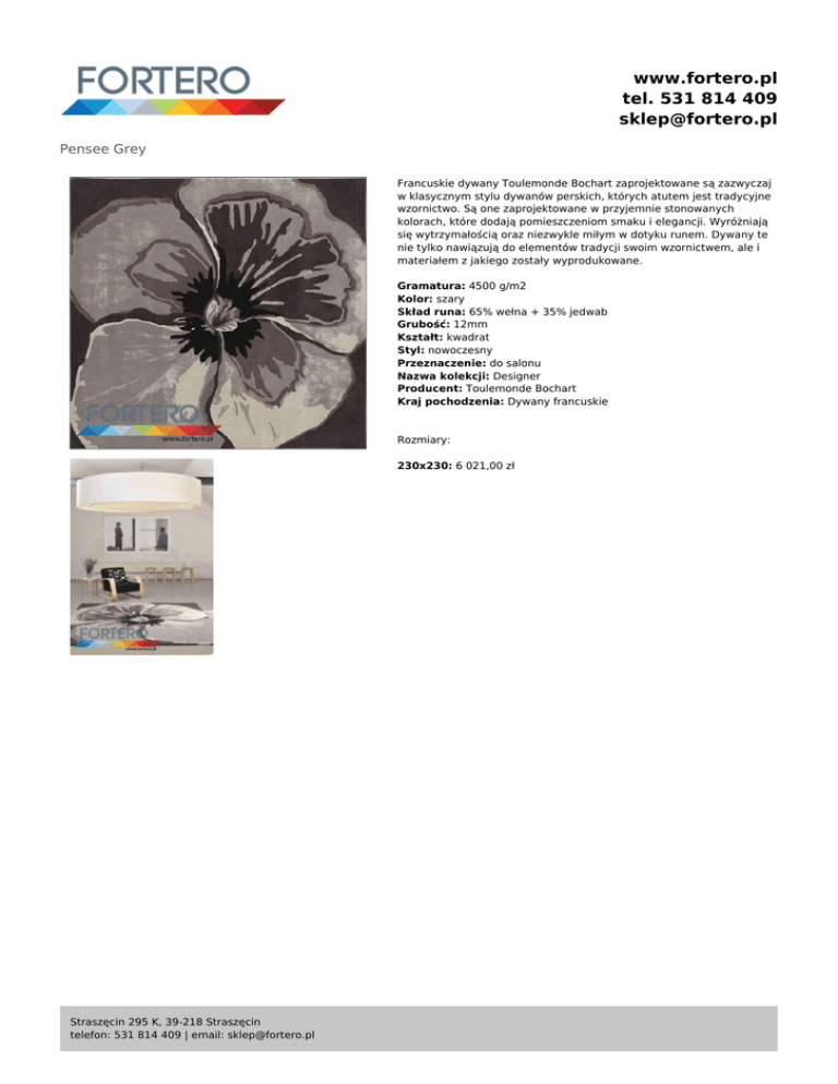 www.fortero.pl tel. 531 814 409 [email protected] Pensee Grey Francuskie dywany Toulemonde Bochart zaprojektowane są zazwyczaj w klasycznym stylu dywanów perskich, których atutem jest tradycyjne wzornictwo. Są one zaprojektowane w przyjemnie stonowanych kolorach, które dodają pomieszczeniom smaku i elegancji. Wyróżniają się wytrzymałością oraz niezwykle miłym w dotyku runem. Dywany te nie tylko nawiązują do elementów tradycji swoim wzornictwem, ale i materiałem z jakiego zostały wyprodukowane. Gramatura: 4500 g/m2 Kolor: szary Skład runa: 65% wełna + 35% jedwab Grubość: 12mm Kształt: kwadrat Styl: nowoczesny Przeznaczenie: do salonu Nazwa kolekcji: Designer Producent: Toulemonde Bochart Kraj pochodzenia: Dywany francuskie Rozmiary: 230x230: 6 021,00 zł Straszęcin 295 K, 39-218 Straszęcin telefon: 531 814 409 | email: [email protected]