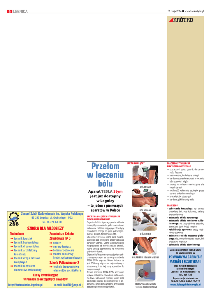 4 Legnica 21 maja 2014 www.konkrety24.pl ykrótko Przełom w leczeniu bólu Aparat TESLA Stym jest już dostępny w Legnicy – to jeden z pierwszych aparatów w Polsce Jak działa głęboka stymulacja elektromagnetyczna? Organizm ludzki z fizycznego punktu widzenia to zespół przewodników, półprzewodników i izolatorów, na które mają wpływ różne typy zewnętrznej energii, np. prąd, pole magnetyczne, światło, temperatura etc. Charakterystyczną cechą pola magnetycznego jest przenikanie przez wszystkie struktury ustroju. Cecha ta odróżnia pole magnetyczne od innych postaci energii, które ulegają pochłonięciu na niewielkiej głębokości tkanek. Głębokość efektywnej stymulacji polem elektromagnetycznym za pomocą urządzenia TESLA STYM sięga do 10 cm. Indukcja ta jest 150 razy większa od najmocniejszych stosowanych do tej pory aparatów do magnetoterapii. Terapia aparatem TESLA STYM korzystnie wpływa na krążenie obwodowe, natlenowanie krwi, wzmożenie wymiany jonów oraz stymulację reakcji biochemicznych w organizmie. Dzięki temu znacznie przyspiesza odbudowę i regenerację tkanek. Jak to wygląda? BÓL ŁOKCIA BÓL KOLANA BÓL Barku Dlaczego stymulacja elektromagnetyczna? − skuteczny i szybki powrót do sprawności fizycznej − bezinwazyjne, bezbolesne zabiegi − bardzo wysoka skuteczność w leczeniu bólu stawów i mięśni − zabiegi na miejsca niedostępne dla innych terapii − możliwość wykonania zabiegów przez ubrania z tkanin naturalnych − brak efektów ubocznych − bardzo szybki i trwały efekt Dla kogo? – schorzenie kręgosłupa: np. ostry/ przewlekły ból, rwa kulszowa, zmiany zwyrodnieniowe – zaburzenia układu nerwowego – zaburzenia układu mieśniowo-szkieletowego: np. zwyrodnienie stawów, zamrożony bark, łokieć tenisisty – rehabilitacja sportowa: urazy mięśniowo-stawowe – zaburzenia układu moczowo-płciowego: nietrzymanie moczu u kobiet, ból prostaty u mężczyzn – schorzenia układu oddechowego Zabiegi aparatem TESLA Stym są wykonywane w osłabienie i zanik mięśni PRYWATNYM GABINECIE MASAŻU I FIZJOTERAPII mgr Arnold Doleczych Michał Doleczych Legnica, ul. Chojnowska 112 I p., pok 126 nietrzymanie moczu – terapia bezkontaktowa Rejestracja telefoniczna 609-687-320, 604-923-379 www.doleczychfizjoterapia.pl