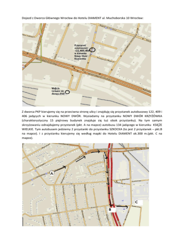Dojazd z Dworca Głównego Wrocław do Hotelu DIAMENT ul. Muchoborska 10 Wrocław: Z dworca PKP kierujemy się na przeciwna stronę ulicy i znajduję się przystanek autobusowy 122, 409 i 406 jadących w kierunku NOWY DWÓR. Wysiadamy na przystanku NOWY DWÓR KRZYŻÓWKA (charakterystyczny 15 piętrowy budynek znajduje się tuż obok przystanku). Na tym samym skrzyżowaniu odnajdujemy przystanek (pkt. A na mapce) autobusu 134 jadącego w kierunku KSIĘŻE WIELKIE. Tym autobusem jedziemy 2 przystanki do przystanku SZKOCKA (to jest 2 przystanek – pkt.B na mapce). I z przystanku kierujemy się według mapki do Hotelu DIAMENT ok.300 m.(pkt. C na mapce).