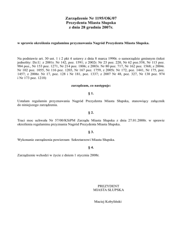 Zarządzenie Nr 1195/OK/07 Prezydenta Miasta Słupska z dnia 28