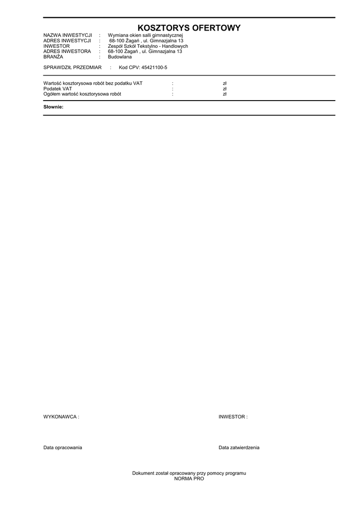 KOSZTORYS OFERTOWY NAZWA INWESTYCJI ADRES INWESTYCJI INWESTOR ADRES INWESTORA BRANŻA : : : : : SPRAWDZIŁ PRZEDMIAR Wymiana okien salli gimnastycznej 68-100 Żagań , ul. Gimnazjalna 13 Zespół Szkół Tekstylno - Handlowych 68-100 Żagań , ul. Gimnazjalna 13 Budowlana : Kod CPV: 45421100-5 Wartość kosztorysowa robót bez podatku VAT Podatek VAT Ogółem wartość kosztorysowa robót : : : zł zł zł Słownie: WYKONAWCA : INWESTOR : Data opracowania Data zatwierdzenia Dokument został opracowany przy pomocy programu NORMA PRO Lp. Podstawa wyceny Opis 1 2 3 Wymiana okien Zespół Szkół Tekstylno - Handlowych w Żaganiu 1 Sala gimnastyczna 1.1 1 KNR 4-01 Wykucie z muru ościeżnic drewnianych o pow.do 1 d.1. 0354-03 m2 1 2 KNR 4-01 Wykucie z muru ościeżnic drewnianych o pow.do 2 d.1. 0354-04 m2 1 3 KNR 0-19 Montaż okien aluminiowych o pow. do 1.0 m2 d.1. 1024-01 oszklonych na budowie - okna AL kolor zielony AL 1 - ciepłe , okno kołowe FI 97 cm 4 KNR 4-01 Wykucie z muru ościeżnic stalowych lub krat d.1. 0354-08 okiennych o pow.ponad 2 m2 1 5 KNR 0-19 Montaż okien aluminiowych o pow. ponad 3.0 m2 d.1. 1024-05 oszklonych na budowie - okna Al profil ciepły kolor 1 zielony szklenie poliwęglan pięciokomoowy gr, 20mm 6 Kalkulacja Dopłata za mechanizm elektryczny otwierania typ d.1. własna GEZE 1 7 KNR 0-19 Montaż okien aluminiowych o pow. ponad 3.0 m2 d.1. 1024-05 oszklonych na budowie okno AL kolor RAL 6025 1 szklenie szkło ciepłe termo 1,1 8 KNR 2-02 Okładziny z płyt gips.-karton.(suche tynki gips.) pod.1. 2006-05 jedyńcze na słupach,belkach i ościeżach na zapra1 wie 9 KNR 4-01 Dwukrotne malowanie farbami emulsyjnymi starych d.1. 1204-02 tynków wewnętrznych ścian 1 10 KNR 2-02 Tynki (gładzie) jednowarstw.wewn.gr.3 mm z gipsu d.1. 2009-05 szpachlow.wyk.ręcz.na ościeżach i pasach ścien1 nych na podłożu betonowym 11 NNRNKB 202 (z.VII) Gruntowanie podłoży preparatami "CEREd.1. 1134-02 SIT CT 17" i "ATLAS UNI GRUNT" - powierzchnie 1 pionowe 12 KNR 4-01 Wywiezienie gruzu spryzmowanego samochodami d.1. 0108-09 skrzyniowymi na odl.do 1 km - stare okna plus 1 koszt utylizacji 13 KNR 4-01 Wywiezienie gruzu spryzmowanego samochodami d.1. 0108-10 skrzyniowymi - za każdy nast. 1 km 1 Krotność = 4 14 KNR 2-02 Rusztowania ramowe warszawskie jednokolumnod.1. 1611-02 we wys.do 6 m 1 15 KNR 4-01 Wykucie z muru ościeżnic drewnianych o pow.pod.1. 0354-05 nad 2 m2 1 16 KNR 0-19 Montaż okien aluminiowych o pow. do 1.5 m2 d.1. 1024-02 oszklonych na budowie naświetle 1 17 KNR 0-19 Montaż drzwi aluminiowych dwuskrzydłowych d.1. 1024-08 oszklonych na budowie 1 18 KNR 0-19 Montaż drzwi aluminiowych jednoskrzydłowych d.1. 1024-06 oszklonych na budowie 1 19 KNR 4-01 Wykucie z muru podokienników betonowych z lasd.1. 0354-12 tryko 1 20 KNR 4-01 Uzupełnienie gładzi cementowej na rolkach z ced.1. 0312-02 gieł o szer. 1 1/2 ceg. poziomych analogia parapet 1 betonowy gr 4 cm 21 Kalkulacja Dopłata za samozamykacze do drzwi d.1. własna 1 22 Kalkulacja Dopłata za zamki antywłamaniowe d.1. własna 1 23 KNR 2-02 Posadzki cementowe wraz z cokolikami - dopłata d.1. 1106-07 za zbrojenie siatką stalową parapety stal fi 6 A-0 1 -2- Norma PRO Wersja 4.01, Marzec 2003 r. Klucz wykonawczy 4 Jedn. miary Ilość 5 6 szt. 6.99 szt. 8.33 szt 1 m2 37.24 m2 37.24 szt 6 m2 14.04 m2 42.31 m2 50.77 m2 50.77 m2 50.77 m3 2 m3 2 kol. 14 m2 9.28 m2 1.52 m2 4.36 m2 3.4 m 21.94 m 21.94 szt 3 szt 3 m2 7.67 Cena zł (8 / 6) 7 Wartość zł 8 Lp. Podstawa wyceny Opis Klucz wykonawczy 4 1 2 3 Wartość kosztorysowa robót bez narzutów kosztorysu Wartość narzutów kosztorysu objętych podatkiem VAT Wartość kosztorysowa robót bez podatku VAT Podatek VAT Ogółem wartość kosztorysowa robót Słownie: -3- Norma PRO Wersja 4.01, Marzec 2003 r. Jedn. miary Ilość 5 6 Cena zł (8 / 6) 7 Wartość zł 8