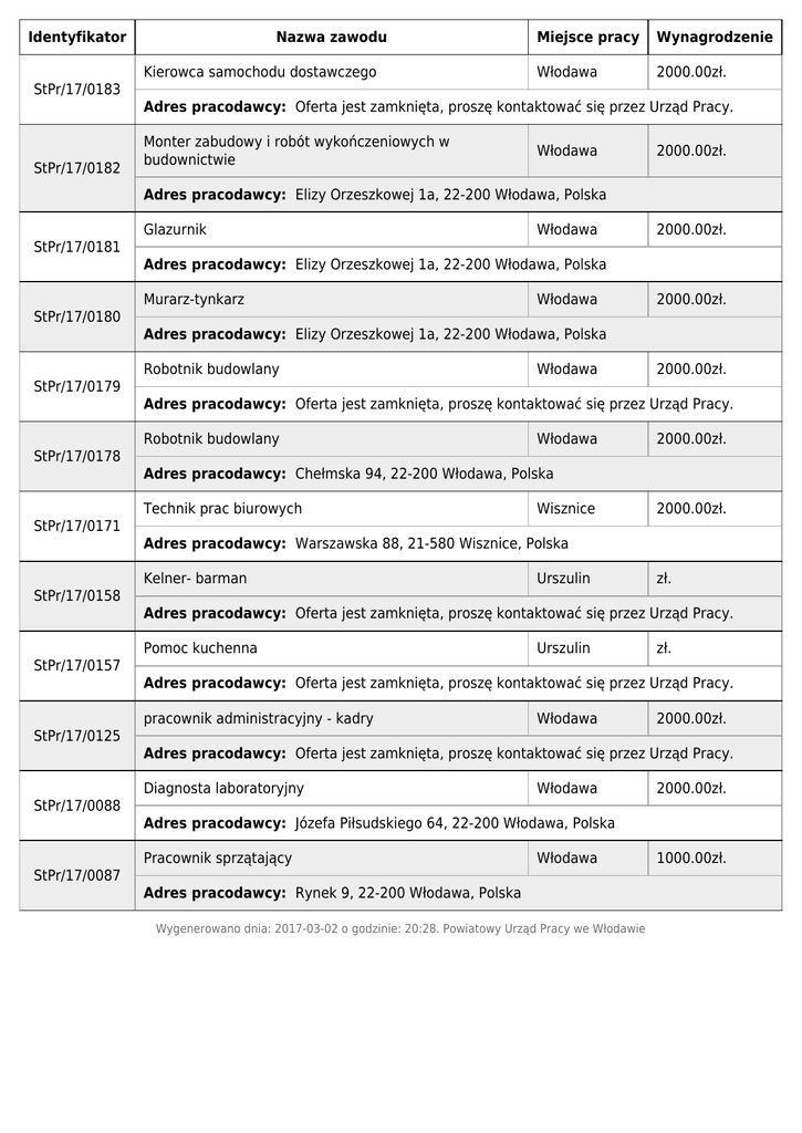 Identyfikator Nazwa zawodu Kierowca samochodu dostawczego Miejsce pracy Wynagrodzenie Włodawa 2000.00zł. StPr/17/0183 Adres pracodawcy: Oferta jest zamknięta, proszę kontaktować się przez Urząd Pracy. StPr/17/0182 Monter zabudowy i robót wykończeniowych w budownictwie Włodawa 2000.00zł. Adres pracodawcy: Elizy Orzeszkowej 1a, 22-200 Włodawa, Polska Glazurnik Włodawa 2000.00zł. StPr/17/0181 Adres pracodawcy: Elizy Orzeszkowej 1a, 22-200 Włodawa, Polska Murarz-tynkarz Włodawa 2000.00zł. StPr/17/0180 Adres pracodawcy: Elizy Orzeszkowej 1a, 22-200 Włodawa, Polska Robotnik budowlany Włodawa 2000.00zł. StPr/17/0179 Adres pracodawcy: Oferta jest zamknięta, proszę kontaktować się przez Urząd Pracy. Robotnik budowlany Włodawa 2000.00zł. StPr/17/0178 Adres pracodawcy: Chełmska 94, 22-200 Włodawa, Polska Technik prac biurowych Wisznice 2000.00zł. StPr/17/0171 Adres pracodawcy: Warszawska 88, 21-580 Wisznice, Polska Kelner- barman Urszulin zł. StPr/17/0158 Adres pracodawcy: Oferta jest zamknięta, proszę kontaktować się przez Urząd Pracy. Pomoc kuchenna Urszulin zł. StPr/17/0157 Adres pracodawcy: Oferta jest zamknięta, proszę kontaktować się przez Urząd Pracy. pracownik administracyjny - kadry Włodawa 2000.00zł. StPr/17/0125 Adres pracodawcy: Oferta jest zamknięta, proszę kontaktować się przez Urząd Pracy. Diagnosta laboratoryjny Włodawa 2000.00zł. StPr/17/0088 Adres pracodawcy: Józefa Piłsudskiego 64, 22-200 Włodawa, Polska Pracownik sprzątający Włodawa StPr/17/0087 Adres pracodawcy: Rynek 9, 22-200 Włodawa, Polska Wygenerowano dnia: 2017-03-02 o godzinie: 20:28. Powiatowy Urząd Pracy we Włodawie 1000.00zł.