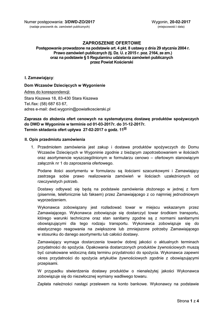 Numer postępowania: 3/DWD-ZO/2017 Wygonin, 20-02-2017 (nadaje pracownik ds. zamówień publicznych) (miejscowość i data) ZAPROSZENIE OFERTOWE Postępowanie prowadzone na podstawie art. 4 pkt. 8 ustawy z dnia 29 stycznia 2004 r. Prawo zamówień publicznych (tj. Dz. U. z 2015 r. poz. 2164, ze zm.) oraz na podstawie § 5 Regulaminu udzielania zamówień publicznych przez Powiat Kościerski I. Zamawiający: Dom Wczasów Dziecięcych w Wygonienie Adres do korespondencji: Stara Kiszewa 18, 83-430 Stara Kiszewa Tel./fax: (58) 687 63 67, adres e-mail: [email protected] Zaprasza do złożenia ofert cenowych na systematyczną dostawę produktów spożywczych do DWD w Wygoninie w terminie od 01-03-2017r. do 31-12-2017r. Termin składania ofert upływa 27-02-2017 o godz. 1100 II. Opis przedmiotu zamówienia 1. Przedmiotem zamówienia jest zakup i dostawa produktów spożywczych do Domu Wczasów Dziecięcych w Wygoninie zgodnie z bieżącym zapotrzebowaniem w ilościach oraz asortymencie wyszczególnionym w formularzu cenowo – ofertowym stanowiącym załącznik nr 1 do zaproszenia ofertowego. Podane ilości asortymentu w formularzu są ilościami szacunkowymi i Zamawiający zastrzega sobie prawo realizowania zamówień w ilościach uzależnionych od rzeczywistych potrzeb. Dostawy odbywać się będą na podstawie zamówienia złożonego w jednej z form (pisemnie, telefonicznie lub faksem) przez Zamawiającego z co najmniej jednodniowym wyprzedzeniem. Wykonawca zobowiązany jest rozładować towar w miejscu wskazanym przez Zamawiającego. Wykonawca zobowiązuje się dostarczyć towar środkiem transportu, którego warunki techniczne oraz stan sanitarny zgodne są z normami sanitarnymi obowiązującymi dla tego rodzaju transportu. Wykonawca zobowiązuje się do elastycznego reagowania na zwiększone lub zmniejszone potrzeby Zamawiającego w stosunku do danego asortymentu lub całości dostawy. Zamawiający wymaga dostarczenia towarów dobrej jakości o aktualnych terminach przydatności do spożycia. Opakowania dostarczonych produktów żywnościowych muszą być oznakowane widoczną datą terminu przydatności do spożycia. Wykonawca zapewni okres przydatności do spożycia artykułów żywnościowych zgodnie z obowiązującymi przepisami. W przypadku stwierdzenia dostawy produktów o nienależytej jakości Wykonawca zobowiązuje się do niezwłocznej wymiany wadliwego towaru. Zapłata należności nastąpi przelewem na konto bankowe. Wykonawcy na podstawie Strona 1 z 4 wystawionej faktury przez Wykonawcę po każdorazowej dostawie towaru w terminie 14 dni od daty otrzymania faktury przez odbiorcę, adresowanej zgodnie z poniższymi danymi: Nabywca Powiat Kościerski ul. 3 Maja 9c 83-400 Kościerzyna NIP: 591-15-69-055 Odbiorca Dom Wczasów Dziecięcych w Wygoninie Stara Kiszewa 18 83-430 Stara Kiszewa Szczegółowe warunki zamówienia zawarte zostały w projekcie umowy stanowiący załącznik nr 2. 2. Kryterium oceny ofert – cena 100% 3. Przedmiot zamówienia opisany został wg następujących kodów CPV: 15400000-2 15555000-3 15600000-4 15820000-2 15830000-5 15840000-8 15850000-1 15860000-4 15870000-7 15890000-3 15980000-1 Oleje i tłuszcze zwierzęce lub roślinne Lody i produkty podobne Produkty przemiału ziarna, skrobi i produktów skrobiowych Sucharki i herbatniki; wyroby piekarskie i ciastkarskie o przedłużonej trwałości Cukier i produkty pokrewne Kakao; czekolada i wyroby cukiernicze Produkty z ciasta makaronowego Kawa, herbata i podobne produkty Przyprawy i przyprawy korzenne Różne produkty spożywcze i produkty suszone Napoje bezalkoholowe 1. Wykonawca związany jest ofertą 30 dni. 2. Bieg terminu związania ofertą rozpoczyna się wraz z upływem terminu składania ofert. III. Dokumenty, jakie Wykonawca powinien załączyć do oferty: 1. Zamawiający wymaga, aby każda oferta zawierała minimum następujące dokumenty: 1) wypełniony i podpisany przez Wykonawcę formularz cenowo-ofertowy – wg załączonego wzoru formularza ofertowego, 2) aktualny odpis z właściwego rejestru lub centralnej ewidencji i informacji o działalności gospodarczej, jeżeli odrębne przepisy wymagają wpisu do rejestru lub ewidencji, wystawiony nie wcześniej niż 6 miesięcy przed upływem terminu składania ofert, w celu wykazania braku podstaw do wykluczenia w oparciu o art. 24 ust. 1 pkt.12-22 ustawy Prawo zamówień publicznych. 2. Postępowanie prowadzone jest w języku polskim. Strona 2 z 4 IV. Informacje o sposobie porozumiewania się Zamawiającego z Wykonawcami oraz przekazywania oświadczeń i dokumentów. Wszelkie oświadczenia, wnioski, zawiadomienia oraz informacje Zamawiający i Wykonawcy mogą przekazywać pisemnie, za pomocą faksu lub drogą elektroniczną. V. Osoby po stronie Zamawiającego uprawnione do porozumiewania się z Wykonawcami 1. Osobą uprawnioną do kontaktowania się z Wykonawcami i udzielania wyjaśnień dotyczących postępowania jest Pani Hanna Nowik – specjalista ds. administracyjno – gospodarczych. 2. Wykonawca może zwrócić się do Zamawiającego o wyjaśnienie istotnych warunków zawartych w niniejszym zaproszeniu w godzinach pracy Zamawiającego tj.: od poniedziałku do piątku w godzinach między 0730 a 1530. VI. Miejsce składania ofert Ofertę należy złożyć w sekretariacie Domu Wczasów Dziecięcych w Wygoninie w zamkniętej kopercie z dopiskiem: „Zaproszenie ofertowe na dostawę różnych produktów spożywczych do DWD w Wygoninie” NIE OTWIERAĆ PRZED 27-02-2017r. godz.: 1100 VII. Opis sposobu obliczania ceny 1. Na załączonym formularzu, należy przedstawić cenę ofertową netto, wartość podatku VAT oraz cenę ofertową brutto za wykonanie / udzielenie zamówienia. 2. Wartość cenową należy podać w złotych polskich cyfrą – z dokładnością do dwóch miejsc po przecinku oraz słownie. 3. Cena powinna zawierać wszelkie koszty związane z wykonaniem przedmiotu zamówienia. 4. Wszelkie rozliczenia pomiędzy Zamawiającym a Wyk