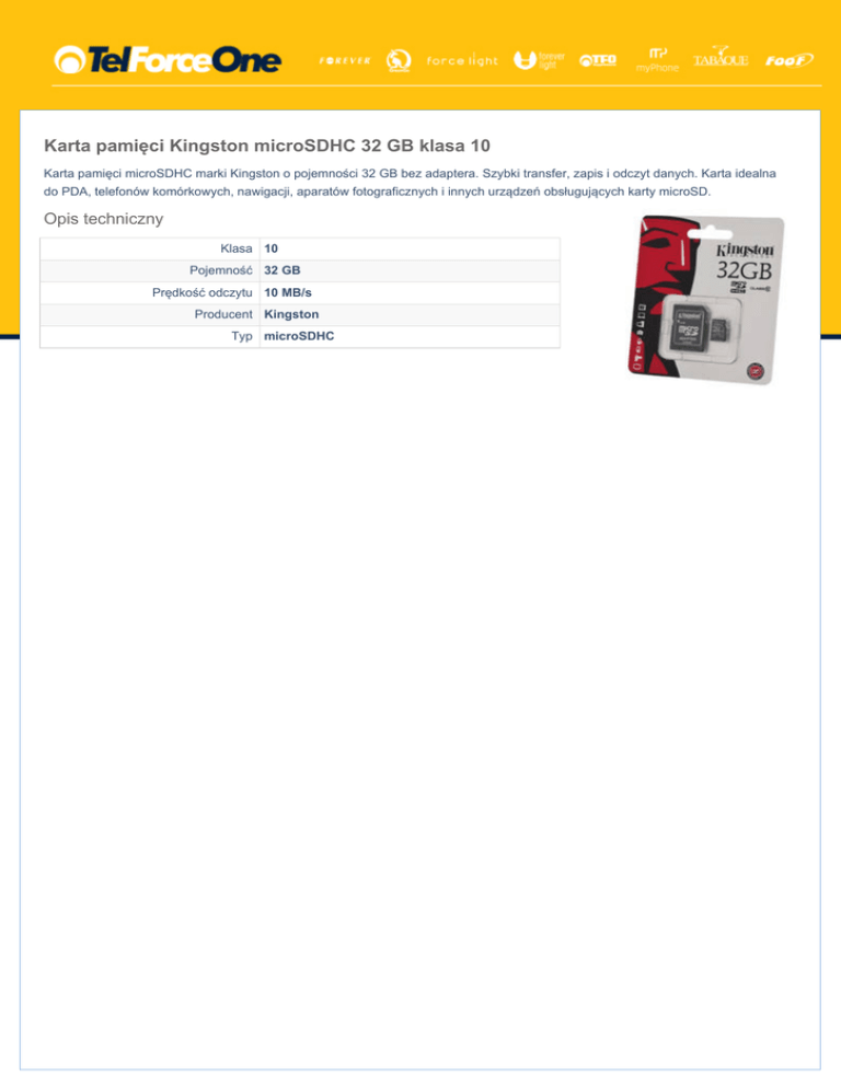Karta pamięci Kingston microSDHC 32 GB klasa 10 Karta pamięci microSDHC marki Kingston o pojemności 32 GB bez adaptera. Szybki transfer, zapis i odczyt danych. Karta idealna do PDA, telefonów komórkowych, nawigacji, aparatów fotograficznych i innych urządzeń obsługujących karty microSD. Opis techniczny Klasa 10 Pojemność 32 GB Prędkość odczytu 10 MB/s Producent Kingston Typ microSDHC