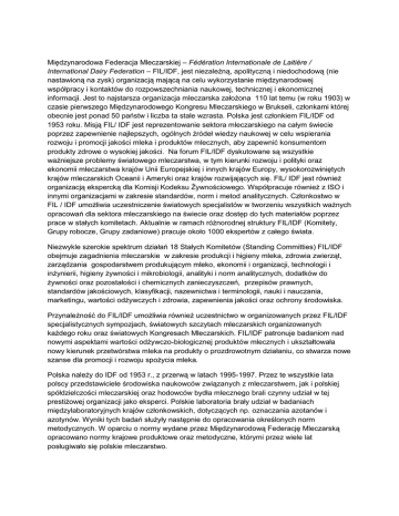 Międzynarodowa Federacja Mleczarskiej – Fédération Internationale de Laitière / International Dairy Federation – FIL/IDF, jest niezależną, apolityczną i niedochodową (nie nastawioną na zysk) organizacją mającą na celu wykorzystanie międzynarodowej współpracy i kontaktów do rozpowszechniania naukowej, technicznej i ekonomicznej informacji. Jest to najstarsza organizacja mleczarska założona 110 lat temu (w roku 1903) w czasie pierwszego Międzynarodowego Kongresu Mleczarskiego w Brukseli, członkami której obecnie jest ponad 50 państw i liczba ta stale wzrasta. Polska jest członkiem FIL/IDF od 1953 roku. Misją FIL/ IDF jest reprezentowanie sektora mleczarskiego na całym świecie poprzez zapewnienie najlepszych, ogólnych źródeł wiedzy naukowej w celu wspierania rozwoju i promocji jakości mleka i produktów mlecznych, aby zapewnić konsumentom produkty zdrowe o wysokiej jakości. Na forum FIL/IDF dyskutowane są wszystkie ważniejsze problemy światowego mleczarstwa, w tym kierunki rozwoju i polityki oraz ekonomii mleczarstwa krajów Unii Europejskiej i innych krajów Europy, wysokorozwiniętych krajów mleczarskich Oceanii i Ameryki oraz krajów rozwijających się. FIL/ IDF jest również organizacją ekspercką dla Komisji Kodeksu Żywnościowego. Współpracuje również z ISO i innymi organizacjami w zakresie standardów, norm i metod analitycznych. Członkostwo w FIL / IDF umożliwia uczestniczenie światowych specjalistów w tworzeniu wszystkich ważnych opracowań dla sektora mleczarskiego na świecie oraz dostęp do tych materiałów poprzez prace w stałych komitetach. Aktualnie w ramach różnorodnej struktury FIL/IDF (Komitety, Grupy robocze, Grupy zadaniowe) pracuje około 1000 ekspertów z całego świata. Niezwykle szerokie spektrum działań 18 Stałych Komitetów (Standing Committies) FIL/IDF obejmuje zagadnienia mleczarskie w zakresie produkcji i higieny mleka, zdrowia zwierząt, zarządzania gospodarstwem produkującym mleko, ekonomii i organizacji, technologii i inżynierii, higieny żywności i mikrobiologii, analityki i norm analitycznych, dodatków do żywności oraz pozostałości i chemicznych zanieczyszczeń, przepisów prawnych, standardów jakościowych, klasyfikacji, nazewnictwa i terminologii, nauki i nauczania, marketingu, wartości odżywczych i zdrowia, zapewnienia jakości oraz ochrony środowiska. Przynależność do FIL/IDF umożliwia również uczestnictwo w organizowanych przez FIL/IDF specjalistycznych sympozjach, światowych szczytach mleczarskich organizowanych każdego roku oraz światowych Kongresach Mleczarskich. FIL/IDF patronuje badaniom nad nowymi aspektami wartości odżywczo-biologicznej produktów mlecznych i ukształtowała nowy kierunek przetwórstwa mleka na produkty o prozdrowotnym działaniu, co stwarza nowe szanse dla promocji i rozwoju spożycia mleka. Polska należy do IDF od 1953 r., z przerwą w latach 1995-1997. Przez te wszystkie lata polscy przedstawiciele środowiska naukowców związanych z mleczarstwem, jak i polskiej spółdzielczości mleczarskiej oraz hodowców bydła mlecznego brali czynny udział w tej prestiżowej organizacji jako eksperci. Polskie laboratoria brały udział w badaniach międzylaboratoryjnych krajów członkowskich, dotyczących np. oznaczania azotanów i azotynów. Wyniki tych badań służyły następnie do opracowania określonych norm metodycznych. W oparciu o normy wydane przez Międzynarodową Federację Mleczarską opracowano normy krajowe produktowe oraz metodyczne, którymi przez wiele lat posługiwało się polskie mleczarstwo. FIL/IDF jest uznaną międzynarodową organizacją branżową, której ustalenia są powoływane w przepisach UE. Jest to zwłaszcza istotne w przypadku przepisów stosowanych w światowym handlu produktami mleczarskimi. Oprócz działalności planowej, FIL/IDF na bieżąco śledzi nowo pojawiające się zagadnienia bezpośrednio lub pośrednio związane z mleczarstwem i reaguje szybko na nowe wyzwania stające przed sektorem mleka, zgodnie z własną strategią działania tzw. SWIFT (pierwsze litery od słów określających Speed-szybkość, Worldwide Visibility-ogólnoświatowy dostęp, Impact-wpływ, Focus-ukierunkowanie działań, Transparency-przejrzystość). Przykładem są tu działania FIL/IDF w odpowiedzi na społeczne zainteresowanie zagadnieniami ochrony środowiska związanymi z emisją gazów cieplarnianych, które zaowocowały dokonaniem oceny eksperckiej stopnia oddziaływania mleczarstwa na środowisko (tzw. ślad węglowy), a następnie pracami nad propozycjami poprawy sytuacji w tym zakresie w ramach tzw. Globalnej Mleczarskiej Agendy Akcji (Global Dairy Agenda Action - w skrócie GDAA) zapoczątkowanej przez sektor mleka na Szczycie Mleczarskim IDF w Berlinie w 2009 r. i podpisanej przez 6 międzynarodowych organizacji. Poprzez to działanie oraz szeroką światową współpracę sektor mleczny wymienia informacje, dostosowuje strategie oraz podejmuje działania w celu osiągania bardziej wydajnej i zrównoważonej produkcji mleczarskiej wobec rosnącej światowej populacji ludności. FIL/IDF odgrywa także istotną rolę informacyjną i edukacyjną wydając corocznie liczne publikacje w postaci biuletynów, broszur informacyjnych oraz innych opracowań (w tym cieszący się dużym zainteresowaniem branży mleczarskiej coroczny raport „Światowy rynek mleka”).Realizacja polityki informacyjnej ma zapewnić członkom organizacji ciągłą i bieżącą wiedzę i informacje, które wychodzą naprzeciw ich oczekiwaniom w zmieniającej się dynamicznie rzeczywistości.