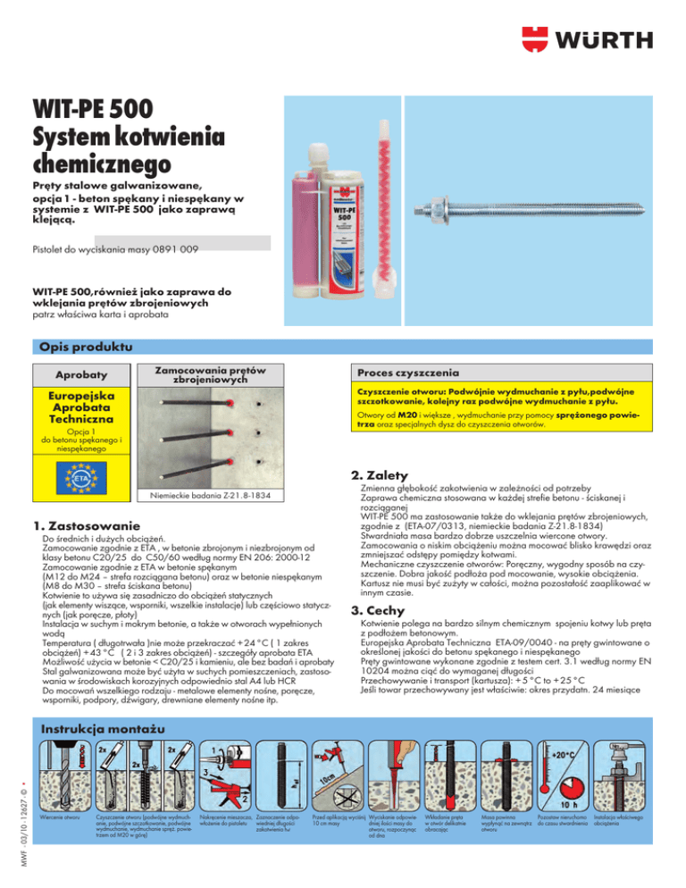 WIT-PE 500 System kotwienia chemicznego Pręty stalowe galwanizowane, opcja 1 - beton spękany i niespękany w systemie z WIT-PE 500 jako zaprawą klejącą. Pistolet do wyciskania masy 0891 009 WIT-PE 500,również jako zaprawa do wklejania prętów zbrojeniowych patrz właściwa karta i aprobata Opis produktu Aprobaty Zamocowania prętów zbrojeniowych Proces czyszczenia Czyszczenie otworu: Podwójnie wydmuchanie z pyłu,podwójne szczotkowanie, kolejny raz podwójne wydmuchanie z pyłu. Europejska Aprobata Techniczna Otwory od M20 i większe , wydmuchanie przy pomocy sprężonego powietrza oraz specjalnych dysz do czyszczenia otworów. Opcja 1 do betonu spękanego i niespękanego 2. Zalety l l Niemieckie badania Z-21.8-1834 1. Zastosowanie l l l l l l l l l Do średnich i dużych obciążeń. Zamocowanie zgodnie z ETA , w betonie zbrojonym i niezbrojonym od klasy betonu C20/25 do C50/60 według normy EN 206: 2000-12 Zamocowanie zgodnie z ETA w betonie spękanym (M12 do M24 – strefa rozciągana betonu) oraz w betonie niespękanym (M8 do M30 – strefa ściskana betonu) Kotwienie to używa się zasadniczo do obciążeń statycznych (jak elementy wiszące, wsporniki, wszelkie instalacje) lub częściowo statycznych (jak poręcze, płoty) Instalacja w suchym i mokrym betonie, a także w otworach wypełnionych wodą Temperatura ( długotrwała )nie może przekraczać +24°C ( 1 zakres obciążeń) +43°C ( 2 i 3 zakres obciążeń) - szczegóły aprobata ETA Możliwość użycia w betonie < C20/25 i kamieniu, ale bez badań i aprobaty Stal galwanizowana może być użyta w suchych pomieszczeniach, zastosowania w środowiskach korozyjnych odpowiednio stal A4 lub HCR Do mocowań wszelkiego rodzaju - metalowe elementy nośne, poręcze, wsporniki, podpory, dźwigary, drewniane elementy nośne itp. l l l l Zmienna głębokość zakotwienia w zależności od potrzeby Zaprawa chemiczna stosowana w każdej strefie betonu - ściskanej i rozciąganejl WIT-PE 500 ma zastosowanie także do wklejania prętów zbrojeniowych, zgodnie z (ETA-07/0313, niemieckie badania Z-21.8-1834) Stwardniała masa bardzo dobrze uszczelnia wiercone otwory. Zamocowania o niskim obciążeniu można mocować blisko krawędzi oraz zmniejszać odstępy pomiędzy kotwami. Mechaniczne czyszczenie otworów: Poręczny, wygodny sposób na czyszczenie. Dobra jakość podłoża pod mocowanie, wysokie obciążenia. Kartusz nie musi być zużyty w całości, można pozostałość zaaplikować w innym czasie. 3. Cechy l Kotwienie polega na bardzo silnym chemicznym spojeniu kotwy lub pręta z podłożem betonowym. l Europejska Aprobata Techniczna ETA-09/0040 - na pręty gwintowane o określonej jakości do betonu spękanego i niespękanego llPręty gwintowane wykonane zgodnie z testem cert. 3.1 według normy EN 10204 można ciąć do wymaganej długości l Przechowywanie i transport (kartusza): +5°C to +25°C l Jeśli towar przechowywany jest właściwie: okres przydatn. 24 miesiące MWF - 03/10 - 12627 - © • Instrukcja montażu Wiercenie otworu Czyszczenie otworu (podwójne wydmuchanie, podwójne szczotkowanie, podwójne wydmuchanie, wydmuchanie spręż. powietrzem od M20 w górę) Nakręcenie mieszacza, Zaznaczenie odpowłożenie do pistoletu wiedniej długości zakotwienia hef Przed aplikacją wyciśnij Wyciskanie odpowie10 cm masy dniej ilości masy do otworu, rozpoczynąc od dna Wkładanie pręta w otwór delikatnie obracając Masa powinna Pozostaw nieruchomo Instalacja właściwego wypłynąć na zewnątrz do czasu stwardnienia obciążenia otworu