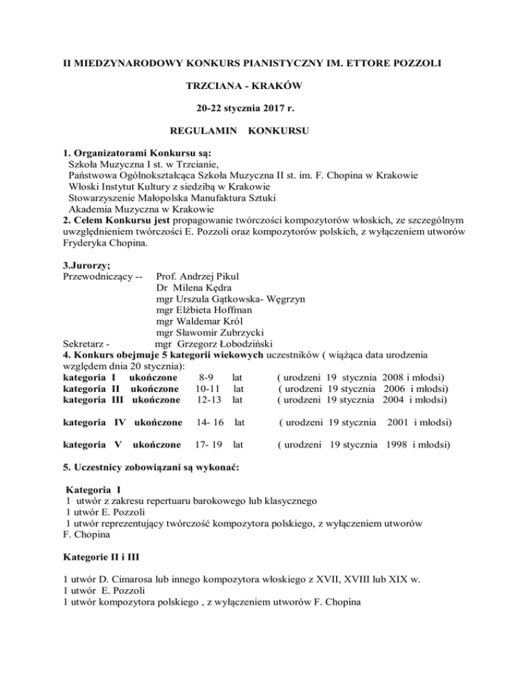 II MIEDZYNARODOWY KONKURS PIANISTYCZNY IM. ETTORE POZZOLI TRZCIANA - KRAKÓW 20-22 stycznia 2017 r. REGULAMIN KONKURSU 1. Organizatorami Konkursu są: Szkoła Muzyczna I st. w Trzcianie, Państwowa Ogólnokształcąca Szkoła Muzyczna II st. im. F. Chopina w Krakowie Włoski Instytut Kultury z siedzibą w Krakowie Stowarzyszenie Małopolska Manufaktura Sztuki Akademia Muzyczna w Krakowie 2. Celem Konkursu jest propagowanie twórczości kompozytorów włoskich, ze szczególnym uwzględnieniem twórczości E. Pozzoli oraz kompozytorów polskich, z wyłączeniem utworów Fryderyka Chopina. 3.Jurorzy; Przewodniczący -- Prof. Andrzej Pikul Dr Milena Kędra mgr Urszula Gątkowska- Węgrzyn mgr Elżbieta Hoffman mgr Waldemar Król mgr Sławomir Zubrzycki Sekretarz mgr Grzegorz Łobodziński 4. Konkurs obejmuje 5 kategorii wiekowych uczestników ( wiążąca data urodzenia względem dnia 20 stycznia): kategoria I ukończone 8-9 lat ( urodzeni 19 stycznia 2008 i młodsi) kategoria II ukończone 10-11 lat ( urodzeni 19 stycznia 2006 i młodsi) kategoria III ukończone 12-13 lat ( urodzeni 19 stycznia 2004 i młodsi) kategoria IV ukończone 14- 16 lat ( urodzeni 19 stycznia 2001 i młodsi) kategoria V ukończone 17- 19 lat ( urodzeni 19 stycznia 1998 i młodsi) 5. Uczestnicy zobowiązani są wykonać: Kategoria I 1 utwór z zakresu repertuaru barokowego lub klasycznego 1 utwór E. Pozzoli 1 utwór reprezentujący twórczość kompozytora polskiego, z wyłączeniem utworów F. Chopina Kategorie II i III 1 utwór D. Cimarosa lub innego kompozytora włoskiego z XVII, XVIII lub XIX w. 1 utwór E. Pozzoli 1 utwór kompozytora polskiego , z wyłączeniem utworów F. Chopina Kategorie IV- V 1 utwór D. Scarlatti 1 utwór E. Pozzoli 1. utwór kompozytora polskiego z wyłączeniem twórczości F. Chopina 1 dowolnie wybrany utwór ( o czasie trwania do 10 minut) 6. Wszystkie utwory należy wykonać z pamięci. 7. Dla wszystkich kategorii konkurs jest jednoetapowy. 8. Uczestnicy zobowiązani są wykonać utwory w oparciu o oryginalne wydania. nazwę wydawnictwa należy podać na Karcie Zgłoszenia przy każdym zgłaszanym utworze. 9. Wypełnioną Kartę Zgłoszenia wraz z potwierdzeniem wpłaty wpisowego należy przesłać do dnia 20 grudnia 2016 r. na adres mailowy [email protected] lub pocztą tradycyjną na adres: Szkoła Muzyczna I stopnia w Trzcianie, Trzciana 403, 32-733 Trzciana ( decyduje data stempla pocztowego) 10. Miejsce przesłuchań konkursowych: Państwowa Ogólnokształcąca Szkoła Muzyczna II st. im. F. Chopina, ul. Basztowa 6 11. Koncert Laureatów odbędzie się w dniu 22.01.2017 r. w Sali Koncertowej Akademii Muzycznej w Krakowie, ul. Św. Tomasza 43. 12. Jury pracuje w oparciu o wewnętrzny Regulamin. Decyzje Jury są ostateczne. 13. Laureaci są zobowiązani do wzięcia udziału w uroczystym koncercie na zakończenie Konkursu. 14. Ustala się wpisowe w wysokości: - 60 € dla uczestników z zagranicy - 150 złotych dla uczestników z Polski. Numer konta do wpłat wpisowego 90 85890006 0030 0780 1557 0005. 15. W przypadku rezygnacji z udziału w Konkursie opłata wpisowa nie podlega zwrotowi. 16. Koszty związane z podróżą, noclegami, wyżywieniem uczestnicy pokrywają we własnym zakresie. 17. Wszystkie przesłuchania konkursowe będą przeprowadzone publicznie i, włącznie z koncertem laureatów, mogą być rejestrowane i rozpowszechniane. 18. Informacji o Konkursie udzielają ; główny koordynator konkursu- Elżbieta Hoffman, adres mailowy [email protected], tel. 502 541 014 oraz Milena Kędra [email protected], Grzegorz Łobodziński - [email protected] MIĘDZYNARODOWY KONKURS PIANISTYCZNY IM. ETTORE POZZOLI TRZCIANA- KRAKÓW 20 - 22 stycznia 2017 KARTA ZGŁOSZENIA IMIĘ/IMIONA…………………………………………………………………………….. NAZWISKO ……………………………………………………………………………… DATA URODZENIA…………………………………………………………………….. NARODOWOŚĆ………………………………………………………………………….. SZKOŁA………………………………………………………………………………….. ……………………………………………………………………………………………… NAUCZYCIEL…………………………………………………………………………. PROGRAM: KOMPOZYTOR, TYTUŁ UTWORU, WYDAWNICTWO: 1. ……………………………………………………………………………………………… ….…………………………………………………………………………………………... ……………………………………………………………………………………………… 2. ……………………………………………………………………………………………… ….…………………………………………………………………………………………... ……………………………………………………………………………………………… 3. ……………………………………………………………………………………………… ….…………………………………………………………………………………………... ……………………………………………………………………………………………… 4. ……………………………………………………………………………………………… ….…………………………………………………………………………………………... ……………………………………………………………………………………………… 5. ……………………………………………………………………………………………… ….……………………………………………………