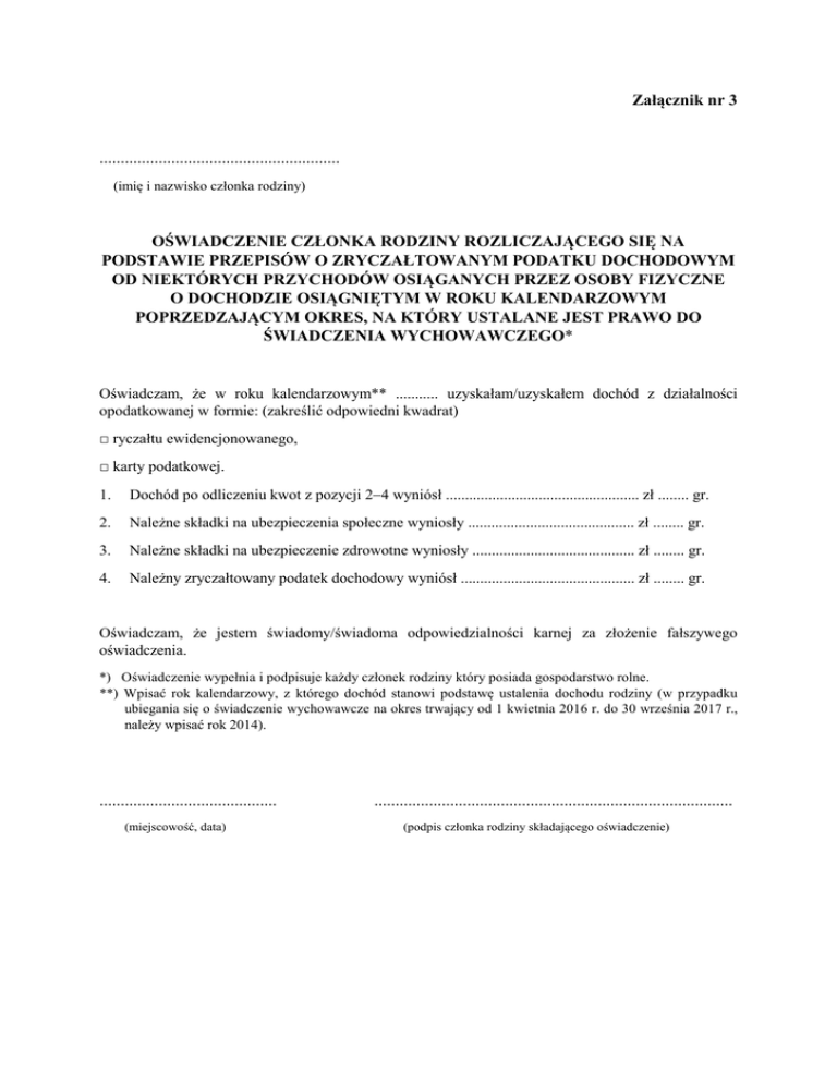 Załącznik nr 3 ......................................................... (imię i nazwisko członka rodziny) OŚWIADCZENIE CZŁONKA RODZINY ROZLICZAJĄCEGO SIĘ NA PODSTAWIE PRZEPISÓW O ZRYCZAŁTOWANYM PODATKU DOCHODOWYM OD NIEKTÓRYCH PRZYCHODÓW OSIĄGANYCH PRZEZ OSOBY FIZYCZNE O DOCHODZIE OSIĄGNIĘTYM W ROKU KALENDARZOWYM POPRZEDZAJĄCYM OKRES, NA KTÓRY USTALANE JEST PRAWO DO ŚWIADCZENIA WYCHOWAWCZEGO* Oświadczam, że w roku kalendarzowym** ........... uzyskałam/uzyskałem dochód z działalności opodatkowanej w formie: (zakreślić odpowiedni kwadrat) □ ryczałtu ewidencjonowanego, □ karty podatkowej. 1. Dochód po odliczeniu kwot z pozycji 2−4 wyniósł .................................................. zł ........ gr. 2. Należne składki na ubezpieczenia społeczne wyniosły ........................................... zł ........ gr. 3. Należne składki na ubezpieczenie zdrowotne wyniosły .......................................... zł ........ gr. 4. Należny zryczałtowany podatek dochodowy wyniósł ............................................. zł ........ gr. Oświadczam, że jestem świadomy/świadoma odpowiedzialności karnej za złożenie fałszywego oświadczenia. *) Oświadczenie wypełnia i podpisuje każdy członek rodziny który posiada gospodarstwo rolne. **) Wpisać rok kalendarzowy, z którego dochód stanowi podstawę ustalenia dochodu rodziny (w przypadku ubiegania się o świadczenie wychowawcze na okres trwający od 1 kwietnia 2016 r. do 30 września 2017 r., należy wpisać rok 2014). .......................................... (miejscowość, data) ..................................................................................... (podpis członka rodziny składającego oświadczenie)
