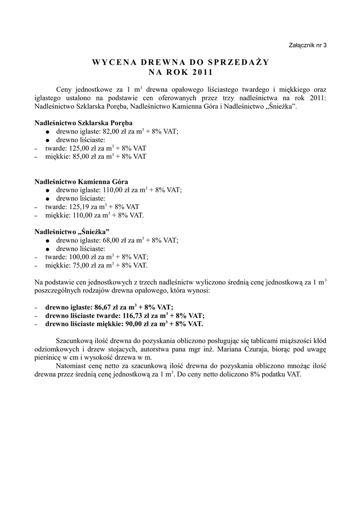 Załącznik nr 3 WYCENA DREWNA DO SPRZEDAŻY N A R O K 2 0 11 Ceny jednostkowe za 1 m3 drewna opałowego liściastego twardego i miękkiego oraz iglastego ustalono na podstawie cen oferowanych przez trzy nadleśnictwa na rok 2011: Nadleśnictwo Szklarska Poręba, Nadleśnictwo Kamienna Góra i Nadleśnictwo „Śnieżka”. Nadleśnictwo Szklarska Poręba 3 ● drewno iglaste: 82,00 zł za m + 8% VAT; ● drewno liściaste: – twarde: 125,00 zł za m3 + 8% VAT – miękkie: 85,00 zł za m3 + 8% VAT Nadleśnictwo Kamienna Góra 3 ● drewno iglaste: 110,00 zł za m + 8% VAT; ● drewno liściaste: – twarde: 125,19 za m3 + 8% VAT – miękkie: 110,00 za m3 + 8% VAT. Nadleśnictwo „Śnieżka” 3 ● drewno iglaste: 68,00 zł za m + 8% VAT; ● drewno liściaste: – twarde: 100,00 zł za m3 + 8% VAT; – miękkie: 75,00 zł za m3 + 8% VAT. Na podstawie cen jednostkowych z trzech nadleśnictw wyliczono średnią cenę jednostkową za 1 m 3 poszczególnych rodzajów drewna opałowego, która wynosi: – – – drewno iglaste: 86,67 zł za m3 + 8% VAT; drewno liściaste twarde: 116,73 zł za m3 + 8% VAT; drewno liściaste miękkie: 90,00 zł za m3 + 8% VAT. Szacunkową ilość drewna do pozyskania obliczono posługując się tablicami miąższości kłód odziomkowych i drzew stojacych, autorstwa pana mgr inż. Mariana Czuraja, biorąc pod uwagę pierśnicę w cm i wysokość drzewa w m. Natomiast cenę netto za szacunkową ilość drewna do pozyskania obliczono mnożąc ilość drewna przez średnią cenę jednostkową za 1 m3. Do ceny netto doliczono 8% podatku VAT.