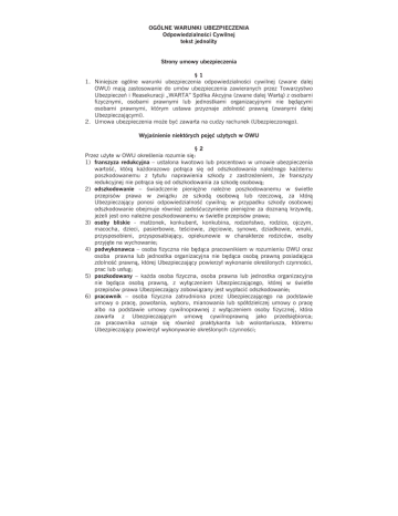 OGÓLNE WARUNKI UBEZPIECZENIA Odpowiedzialności Cywilnej tekst jednolity Strony umowy ubezpieczenia §1 1. Niniejsze ogólne warunki ubezpieczenia odpowiedzialności cywilnej (zwane dalej OWU) mają zastosowanie do umów ubezpieczenia zawieranych przez Towarzystwo Ubezpieczeń i Reasekuracji „WARTA” Spółka Akcyjna (zwane dalej Wartą) z osobami fizycznymi, osobami prawnymi lub jednostkami organizacyjnymi nie będącymi osobami prawnymi, którym ustawa przyznaje zdolność prawną (zwanymi dalej Ubezpieczającymi). 2. Umowa ubezpieczenia może być zawarta na cudzy rachunek (Ubezpieczonego). Wyjaśnienie niektórych pojęć użytych w OWU §2 Przez użyte w OWU określenia rozumie się: 1) franszyza redukcyjna – ustalona kwotowo lub procentowo w umowie ubezpieczenia wartość, którą każdorazowo potrąca się od odszkodowania należnego każdemu poszkodowanemu z tytułu naprawienia szkody z zastrzeżeniem, że franszyzy redukcyjnej nie potrąca się od odszkodowania za szkodę osobową; 2) odszkodowanie – świadczenie pieniężne należne poszkodowanemu w świetle przepisów prawa w związku ze szkodą osobową lub rzeczową, za którą Ubezpieczający ponosi odpowiedzialność cywilną; w przypadku szkody osobowej odszkodowanie obejmuje również zadośćuczynienie pieniężne za doznaną krzywdę, jeżeli jest ono należne poszkodowanemu w świetle przepisów prawa; 3) osoby bliskie - małżonek, konkubent, konkubina, rodzeństwo, rodzice, ojczym, macocha, dzieci, pasierbowie, teściowie, zięciowie, synowe, dziadkowie, wnuki, przysposobieni, przysposabiający, opiekunowie w charakterze rodziców, osoby przyjęte na wychowanie; 4) podwykonawca – osoba fizyczna nie będąca pracownikiem w rozumieniu OWU oraz osoba prawna lub jednostka organizacyjna nie będąca osobą prawną posiadająca zdolność prawną, której Ubezpieczający powierzył wykonanie określonych czynności, prac lub usług; 5) poszkodowany – każda osoba fizyczna, osoba prawna lub jednostka organizacyjna nie będąca osobą prawną, z wyłączeniem Ubezpieczającego, której w świetle przepisów prawa Ubezpieczający zobowiązany jest wypłacić odszkodowanie; 6) pracownik – osoba fizyczna zatrudniona przez Ubezpieczającego na podstawie umowy o pracę, powołania, wyboru, mianowania lub spółdzielczej umowy o pracę albo na podstawie umowy cywilnoprawnej z wyłączeniem osoby fizycznej, która zawarła z Ubezpieczającym umowę cywilnoprawną jako przedsiębiorca; za pracownika uznaje się również praktykanta lub wolontariusza, któremu Ubezpieczający powierzył wykonywanie określonych czynności; 7) produkt – rzecz ruchoma, choćby została połączona z inną rzeczą, a także zwierzęta i energia, sprzedane lub dostarczone przez Ubezpieczającego; 8) przedsiębiorca – osoba fizyczna, osoba prawna oraz jednostka organizacyjna nie będąca osobą prawną, której ustawa przyznaje zdolność prawną, prowadząca we własnym imieniu działalność gospodarczą lub zawodową; 9) szkoda osobowa - wyrażony w pieniądzu uszczerbek poniesiony przez poszkodowanego wskutek uszkodzenia ciała lub rozstroju zdrowia, w tym śmierci w następstwie takiego zdarzenia; 10) szkoda rzeczowa - wyrażony w pieniądzu uszczerbek poniesiony przez poszkodowanego wskutek uszkodzenia lub zniszczenia rzeczy ruchomych lub nieruchomości; 11) czysta szkoda majątkowa - wyrażony w pieniądzu uszczerbek poniesiony przez poszkodowanego wskutek zdarzeń innych niż wymienione w definicji szkody osobowej i szkody rzeczowej zawartej w OWU; 12) szkoda seryjna – traktowane łącznie jako jedna szkoda, wszystkie szkody spowodowane przez wypadki ubezpieczeniowe wynikłe z tej samej przyczyny, w tym spowodowane wprowadzeniem do obrotu serii produktów posiadających taką samą wadę; Warta ponosi odpowiedzialność za szkodę seryjną, jeżeli pierwszy z wypadków ubezpieczeniowych powodujących szkody traktowane jako szkoda seryjna, miał miejsce w okresie ubezpieczenia; 13) Ubezpieczony - osoba fizyczna, osoba prawna lub jednostka organizacyjna nie posiadająca osobowości prawnej, na której rachunek Ubezpieczający zawarł umowę ubezpieczenia, wskazana jako Ubezpieczony w dokumencie ubezpieczenia; ilekroć w OWU mowa jest o Ubezpieczającym rozumie się przez to również Ubezpieczonego, z wyłączeniem przepisów OWU regulujących: zawarcie umowy ubezpieczenia (§ 10), rozwiązanie umowy (§ 14 ust. 1, 2 i 3), zobowiązanie do zapłaty składki oraz zasady zwrotu składki (§ 11, § 14 ust. 4), zasady ustalania i zmiany sumy ubezpieczenia (§ 8); 14) wartości pieniężne – pieniądze będące w kraju lub za granicą prawnym środkiem płatniczym (waluta polska lub waluty obce), a także weksle, czeki, akredytywy, polecenia wypłat, przekazy i inne dokumenty bankowe i finansowe płatne w walucie polskiej lub walutach obcych, karty płatnicze, znaki akcyzy oraz złoto, srebro i wyroby z tych metali, kamienie szlachetne i perły a także platyna i pozostałe metale z grupy platynowców; 15) wprowadzenie produktu do obrotu – przekazanie produktu przez Ubezpieczającego innym podmiotom skutkujące trwałym lub tymczasowym ustaniem faktycznego władztwa Ubezpieczającego nad rzeczą; 16) wypadek ubezpieczeniowy – zdarzenie polegające na uszkodzeniu ciała, rozstroju zdrowia, uszkodzeniu lub zniszczeniu rzeczy ruchomych lub nieruchomości, powodujące szkodę; przyjmuje się, że: a) w razie wątpliwości za datę powstania wypadku ubezpieczeniowego uznaje się dzień, w którym stwierdzono zaistnienie uszkodzenia ciała, rozstroju zdrowia, uszkodzenia lub zniszczenia rzeczy ruchomych lub nieruchomości; b) w przypadku wypadku ubezpieczeniowego powodującego szkodę osobową za datę powstania wypadku przyjmuje się dzień, w którym po raz pierwszy zostało 2 stwierdzone badaniem lekarskim uszkodzenie ciała lub rozstrój zdrowia, jeżeli ustalenie daty powstania wypadku zgodnie z pkt. a powyżej rodzi wątpliwo