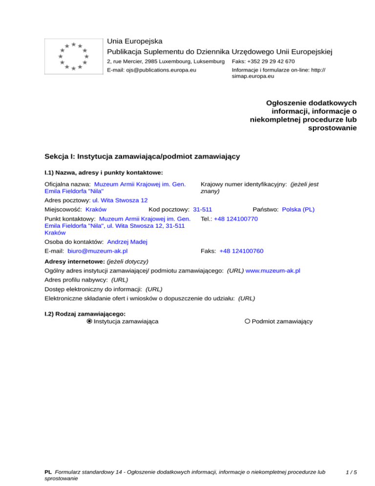 Unia Europejska Publikacja Suplementu do Dziennika Urzędowego Unii Europejskiej 2, rue Mercier, 2985 Luxembourg, Luksemburg Faks: +352 29 29 42 670 E-mail: [email protected] Informacje i formularze on-line: http:// simap.europa.eu Ogłoszenie dodatkowych informacji, informacje o niekompletnej procedurze lub sprostowanie Sekcja I: Instytucja zamawiająca/podmiot zamawiający I.1) Nazwa, adresy i punkty kontaktowe: Oficjalna nazwa: Muzeum Armii Krajowej im. Gen. Emila Fieldorfa "Nila" Krajowy numer identyfikacyjny: (jeżeli jest znany) _____ Adres pocztowy: ul. Wita Stwosza 12 Miejscowość: Kraków Kod pocztowy: 31-511 Punkt kontaktowy: Muzeum Armii Krajowej im. Gen. Emila Fieldorfa "Nila", ul. Wita Stwosza 12, 31-511 Kraków Państwo: Polska (PL) Tel.: +48 124100770 Osoba do kontaktów: Andrzej Madej E-mail: [email protected] Faks: +48 124100760 Adresy internetowe: (jeżeli dotyczy) Ogólny adres instytucji zamawiającej/ podmiotu zamawiającego: (URL) www.muzeum-ak.pl Adres profilu nabywcy: (URL) _____ Dostęp elektroniczny do informacji: (URL) _____ Elektroniczne składanie ofert i wniosków o dopuszczenie do udziału: (URL) _____ I.2) Rodzaj zamawiającego: Instytucja zamawiająca Podmiot zamawiający PL Formularz standardowy 14 - Ogłoszenie dodatkowych informacji, informacje o niekompletnej procedurze lub sprostowanie 1/5 Sekcja II: Przedmiot zamówienia II.1.1) Nazwa nadana zamówieniu: Zaprojektowanie, wykonanie, dostawa i montaż elementów ekspozycji czasowych wraz z multimediami dla wystaw przygotowywanych do wnętrza i na zewnątrz Muzeum Armii Krajowej II.1.2) Krótki opis zamówienia lub zakupu:(podano w pierwotnym ogłoszeniu) Zakres rzeczowy zamówienia obejmuje: 1.Zaprojektowanie, wykonanie i uruchomienie elementów ekspozycji z podziałem na dwa rodzaje: 1.1. ekspozycję wymienną broni 1..2. system wystawienniczy do ekspozycji wystaw czasowych wewnątrz Muzeum 1.3. Zestaw elementów do ekspozycji plenerowych II.1.3) Wspólny Słownik Zamówień (CPV) Główny przedmiot Dodatkowe przedmioty Słownik główny 39133000 32322000 39151000 31000000 79930000 32324600 32333000 Słownik uzupełniający (jeżeli dotyczy) PL Formularz standardowy 14 - Ogłoszenie dodatkowych informacji, informacje o niekompletnej procedurze lub sprostowanie 2/5 Sekcja IV: Procedura IV.1)Rodzaj procedury(podano w pierwotnym ogłoszeniu) Otwarta Ograniczona Ograniczona przyspieszona Negocjacyjna Negocjacyjna przyspieszona Dialog konkurencyjny Negocjacyjna z uprzednim ogłoszeniem Negocjacyjna bez uprzedniego ogłoszenia Negocjacyjna z publikacją ogłoszenia o zamówieniu Negocjacyjna bez publikacji ogłoszenia o zamówieniu Udzielenie zamówienia bez uprzedniej publikacji ogłoszenia o zamówieniu w Dzienniku Urzędowym Unii Europejskiej IV.2)Informacje administracyjne IV.2.1)Numer referencyjny: (podano w pierwotnym ogłoszeniu) MAK I - 271-4/12 IV.2.2)Dane referencyjne ogłoszenia w przypadku ogłoszeń przesłanych drogą elektroniczną: Pierwotne ogłoszenie przesłane przez eNotices TED eSender Login: ENOTICES_makkrakow Dane referencyjne ogłoszenia: 2012-085723 rok i numer dokumentu IV.2.3)Ogłoszenie, którego dotyczy niniejsza publikacja: Numer ogłoszenia w Dz.U.: 2012/S 119-197143 z dnia: 23/06/2012 (dd/mm/rrrr) IV.2.4)Data wysłania pierwotnego ogłoszenia: 20/06/2012 (dd/mm/rrrr) PL Formularz standardowy 14 - Ogłoszenie dodatkowych informacji, informacje o niekompletnej procedurze lub sprostowanie 3/5 Sekcja VI: Informacje uzupełniające VI.1) Ogłoszenie dotyczy: Procedury niepełnej Sprostowania Informacji dodatkowych VI.2) Informacje na temat niepełnej procedury udzielenia zamówienia: Postępowanie o udzielenie zamówienia zostało przerwane Postępowanie o udzielenie zamówienia uznano za nieskuteczne Zamówienia nie udzielono Zamówienie może być przedmiotem ponownej publikacji VI.3) Informacje do poprawienia lub dodania : VI.3.1) Zmiana oryginalnej informacji podanej przez instytucję zamawiającą Publikacja w witrynie TED niezgodna z oryginalną informacją, przekazaną przez instytucję zamawiającą Oba przypadki VI.3.2) W ogłoszeniu pierwotnym W odpowiedniej dokumentacji przetargowej (więcej informacji w odpowiedniej dokumentacji przetargowej) W obu przypadkach (więcej informacji w odpowiedniej dokumentacji przetargowej) VI.3.3) Tekst, który należy poprawić w pierwotnym ogłoszeniu Miejsce, w którym znajduje się Zamiast: zmieniany tekst: Rozpoczęcie 13.8.2012. II.3) Czas trwania zamówienia lub Zakończenie 17.9.2012 termin realizacji Powinno być: Rozpoczęcie 24.9.2012. Zakończenie 15.12.2012 Miejsce, w którym znajduje się Zamiast: zmieniany tekst: 31.7.2012 - 10:00 IV.3.4) Termin składania ofert lub wniosków o dopuszczenie do udziału w postępowaniu Powinno być: 3.9.2012 - 10:00 Miejsce, w którym znajduje się zmieniany tekst: IV.3.8) Warunki otwarcia ofert Powinno być: Data: 3.9.2012 - 10:30 Zamiast: Data: 31.7.2012 - 10:30 VI.3.4) Daty, które należy poprawić w pierwotnym ogłoszeniu Miejsce, w którym znajdują się Zamiast: zmieniane daty: 31/07/2012 Godzina: 10:00 IV.3.4) Termin składania ofert lub (dd/mm/rrrr) wniosków o dopuszczenie do udziału w postępowaniu Miejsce, w którym znajdują się zmieniane daty: IV.3.8) Warunki otwarcia ofert Zamiast: 31/07/2012 Godzina: 10:30 (dd/mm/rrrr) Powinno być: 03/09/2012 Godzina: 10:00 (dd/mm/rrrr) Powinno być: 03/09/2012 Godzina: 10:30 (dd/mm/rrrr) PL Formularz standardowy 14 - Ogłoszenie dodatkowych informacji, informacje o niekompletnej procedurze lub sprostowanie 4/5 VI.3.5) Adresy i punkty kontaktowe, które należy poprawić VI.3.6) Tekst, który należy dodać do pierwotnego ogłoszenia Miejsce, w którym należy dodać tekst: Tekst do dodania: VI.4) Inne dodatkowe informacje: _____ VI.5) Data wysłania niniejszego ogłoszenia: 26/07/2012 (dd/mm/rrrr) - ID:2012-104462 PL Formularz standardowy 14 - Ogłoszenie dodatkowych informacji, informacje o niekompletnej procedurze lub sprostowanie 5/