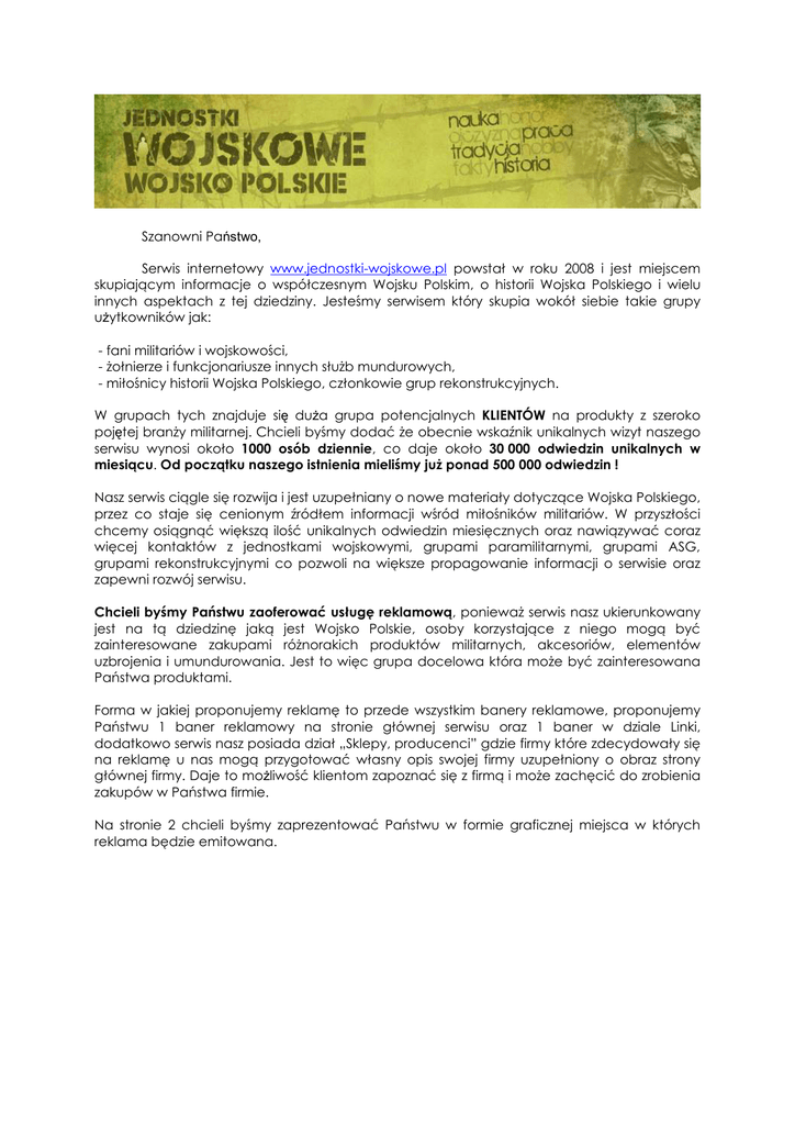 Szanowni Państwo, Serwis internetowy www.jednostki-wojskowe.pl powstał w roku 2008 i jest miejscem skupiającym informacje o współczesnym Wojsku Polskim, o historii Wojska Polskiego i wielu innych aspektach z tej dziedziny. Jesteśmy serwisem który skupia wokół siebie takie grupy uŜytkowników jak: - fani militariów i wojskowości, - Ŝołnierze i funkcjonariusze innych słuŜb mundurowych, - miłośnicy historii Wojska Polskiego, członkowie grup rekonstrukcyjnych. W grupach tych znajduje się duŜa grupa potencjalnych KLIENTÓW na produkty z szeroko pojętej branŜy militarnej. Chcieli byśmy dodać Ŝe obecnie wskaźnik unikalnych wizyt naszego serwisu wynosi około 1000 osób dziennie, co daje około 30 000 odwiedzin unikalnych w miesiącu. Od początku naszego istnienia mieliśmy juŜ ponad 500 000 odwiedzin ! Nasz serwis ciągle się rozwija i jest uzupełniany o nowe materiały dotyczące Wojska Polskiego, przez co staje się cenionym źródłem informacji wśród miłośników militariów. W przyszłości chcemy osiągnąć większą ilość unikalnych odwiedzin miesięcznych oraz nawiązywać coraz więcej kontaktów z jednostkami wojskowymi, grupami paramilitarnymi, grupami ASG, grupami rekonstrukcyjnymi co pozwoli na większe propagowanie informacji o serwisie oraz zapewni rozwój serwisu. Chcieli byśmy Państwu zaoferować usługę reklamową, poniewaŜ serwis nasz ukierunkowany jest na tą dziedzinę jaką jest Wojsko Polskie, osoby korzystające z niego mogą być zainteresowane zakupami róŜnorakich produktów militarnych, akcesoriów, elementów uzbrojenia i umundurowania. Jest to więc grupa docelowa która moŜe być zainteresowana Państwa produktami. Forma w jakiej proponujemy reklamę to przede wszystkim banery reklamowe, proponujemy Państwu 1 baner reklamowy na stronie głównej serwisu oraz 1 baner w dziale Linki, dodatkowo serwis nasz posiada dział „Sklepy, producenci” gdzie firmy które zdecydowały się na reklamę u nas mogą przygotować własny opis swojej firmy uzupełniony o obraz strony głównej firmy. Daje to moŜliwość klientom zapoznać się z firmą i moŜe zachęcić do zrobienia zakupów w Państwa firmie. Na stronie 2 chcieli byśmy zaprezentować Państwu w formie graficznej miejsca w których reklama będzie emitowana. Głównym miejscem z którym styczność ma osoba odwiedzająca nasz serwis jest Strona Główna, i tutaj jest miejsce na Państwa reklamę na lewym panelu w sekcji POLECAMY są banery firm lub instytucji które reklamujemy. Z naszych obserwacji wynika Ŝe wiele osób TUTAJ klika i przechodzi na strony naszych klientów. Drugim miejscem w którym znajduje się takŜe Państwa reklama jest dział LINKI, jest to dział, który stanowi swoistą bazę linków do stron wojskowych oraz organizacji militarnych, banery reklamodawców są umieszczanie NA PIERWSZYCH miejscach od góry na liście linków. Trzecim miejscem mającym duŜe oddziaływanie marketingowe jest dział SKLEPY, PRODUCENCI, w dziale tym pozwalamy naszym klientom przygotować własną prezentację firmy, opis działalności firmy i krótki opis oferty. Aby klient mógł szybko przejść na stronę firmy się reklamującej wstawiamy obraz strony głównej firmy po kliknięciu w którą klikający jest przenoszony na stronę danej firmy. Wymagania techniczne dla banerów - baner na Stronie Głównej musi być przygotowany przez reklamodawcę i mieć rozmiar 155 x 58 px w formacie JPG, GIF, PNG lub SWF. - baner w dziale Linki musi być przygotowany przez reklamodawcę i mieć rozmiar 468 x 60 px w formacie JPG, GIF, PNG lub SWF. CENNIK Koszt reklamy w serwisie www.jednostki-wojskowe.pl wynosi: Długość trwania emisji reklamy (od dnia wpłaty za fakturę VAT!) 6 miesięcy 12 miesięcy Cena BRUTTO 350 zł 600 zł PROSZĘ TAKśE O ZAPOZNANIE SIĘ Z REGULAMINEM ŚWIADCZENIA USŁUG REKLAMOWYCH KTÓRY JEST PONIśEJ! WYSTAWIAMY FAKTURY VAT !!!! W przypadku zainteresowania naszą ofertą prosił bym o kontakt telefoniczny lub mailowy: Telefon: Jacek Tymoczko – 607-126-526 E-mail: Jacek Tymoczko – [email protected] lub [email protected] Dane firmowe właściciela serwisu www.jednostki-wojskowe.pl : Jacek Tymoczko MERCHANT ul. Wierzchowicka 1 Czatkowice 56-300 Milicz woj. dolnośląskie NIP: 916-129-39-05 REGON: 020912949 Regulamin Świadczenia usług reklamowych w serwisie internetowym www.jednostki-wojskowe.pl I. W treści niniejszego regulaminu uwzględniono następujące pojęcia: Jacek Tymoczko MERCHANT - właściciel serwisu internetowego: www.jednostki-wojskowe.pl z siedzibą w Czatkowicach pod adresem ulica Wierzchowicka 1, kod pocztowy 56-300 Serwis www.jednostki-wojskowe.pl - oznacza ogólnodostępny internetowy serwis informacyjno – usługowy Zleceniodawca/Reklamodawca oznacza kaŜdą osobę fizyczną i prawną zlecającą emisję reklamy w serwisie www.jednostki-wojskowe.pl Reklama oznacza kaŜdy przekaz zmierzający do promocji towarów, usług, idei bądź do osiągnięcia innego celu zamierzonego przez zleceniodawcę. Formy reklamy, będące podstawą wykonania zlecenia reklamowego określone są w wymaganiach technicznych załączonych do oferty reklamowej. II. Zlecenie reklamowe: Zlecenie reklamowe dokonywane jest w formie pisemnej poprzez wypełnienie 2 (dwóch) kopii formularza zamówień (jeden z nich jest odsyłany później do Państwa wraz z oryginałem faktury VAT !!). Formularz określa rodzaj i formę reklamy, ilość i czas emisji oraz cenę za usługę zgodną z obowiązującym cennikiem. Zlecenie reklamowe musi zawierać podpis i pieczęć Zleceniodawcy. Zlecenie reklamowe musi zostać doręczone do siedziby właściciela serwisu - firmy Jacek Tymoczko MERCHANT najpóźniej na 5 dni roboczych przed planowaną emisją. Anulowanie zlecenia reklamowego wymaga formy pisemnej. Pozostałe zmiany dotyczące zlecenia reklamowego wymagają zmian w formie pisemnej. III. Warunki emisji reklam: Materiały reklamowe muszą być dostarczane w 