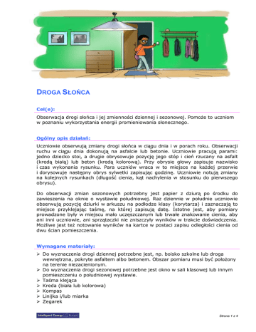 DROGA SŁOŃCA Cel(e): Obserwacja drogi słońca i jej zmienności dziennej i sezonowej. PomoŜe to uczniom w poznaniu wykorzystania energii promieniowania słonecznego. Ogólny opis działań: Uczniowie obserwują zmiany drogi słońca w ciągu dnia i w porach roku. Obserwacji ruchu w ciągu dnia dokonują na asfalcie lub betonie. Uczniowie pracują parami: jedno dziecko stoi, a drugie obrysowuje pozycję jego stóp i cień rzucany na asfalt (kredą białą) lub beton (kredą kolorową). Przy obrysie głowy zapisuje nazwisko i czas wykonania rysunku. Para uczniów wraca w to miejsce na kaŜdej przerwie i dorysowuje następny obrys sylwetki zapisując godzinę. Uczniowie notują zmiany na kolejnych rysunkach (długość cienia, kąt nachylenia w stosunku do pierwszego obrysu). Do obserwacji zmian sezonowych potrzebny jest papier z dziurą po środku do zawieszenia na oknie o wystawie południowej. Raz dziennie w południe uczniowie obserwują pozycję dziurki w arkuszu na podłodze klasy (korytarza) i zaznaczają to miejsce przyklejając taśmę, na której zapisują datę. Istotne jest, aby pomiary prowadzone były w miejscu mało uczęszczanym lub trwałe znakowanie cienia, aby ani inni uczniowie, ani sprzątaczki nie zniszczyły wyników w trakcie doświadczenia. MoŜliwe jest teŜ notowanie wyników na kartce w postaci zapisu odległości cienia od dwu ścian pomieszczenia. Wymagane materiały: Do wyznaczenia drogi dziennej potrzebne jest, np. boisko szkolne lub droga wewnętrzna, pokryte asfaltem albo betonem. Obszar pomiaru musi być połoŜony na terenie niezacienionym. Do wyznaczenia drogi sezonowej potrzebne jest okno w sali klasowej lub innym pomieszczeniu o południowej wystawie. Taśma klejąca Kreda (biała lub kolorowa) Kompas Linijka i/lub miarka Zegarek Strona 1 z 4 Wymagane umiejętności: Dokonanie pomiarów w metrach i centymetrach Odczytywanie czasu na zegarku Odczytywanie wskazań kompasu (wyznaczenie południa) Umiejętność pracy grupowej Umiejętność pomiarów kąta Umiejętność rysunku Dopasowanie zadania do programu nauczania: Matematyka, geografia Kwestie bezpieczeństwa: NaleŜy uczulić uczniów, aby korzystali słonecznym w czasie pomiarów na boisku. z nakrycia głowy i kremu Poszczególne kroki zadania: z filtrem Wymagany czas: Wprowadzenie – ½ lekcji 2. Uzgodnienie ze sprzątaczkami, Ŝeby nie zniszczyły wyników pomiarów na podłodze. Przygotowanie 3. Uczniów prowadzi się w słoneczne miejsce utwardzone betonem lub asfaltem, gdzie będą obrysowywać cienie w ciągu dnia. 4. Uczniowie pracują w parach: jeden stoi bez ruchu, drugi obrysowuje cień. 5. Jest waŜne, aby pary były od siebie oddalone, tak by cienie się nie krzyŜowały. 6. Uczeń obrysowuje kredą stopy kolegi/koleŜanki, zaznacza, dokąd sięga cień (czubek głowy drugiego dziecka) i wpisuje przy tym znaku nazwisko dziecka i godzinę pomiaru. 7. Pomiary są powtarzane co godzinę i waŜne jest, aby stopy dziecka „słuŜącego” cieniem były ustawione zawsze w obrysie dokonanym podczas pierwszego pomiaru. Za kaŜdym razem zaznacza się, gdzie kończy się cień (czubek głowy) i wpisuje nazwisko dziecka i godzinę pomiaru. Rysuje linię łączącą stopy i czubek głowy. WaŜne jest, aby pomiarami objąć jak najdłuŜszy czas, tj. zacząć rano i powtarzać przynajmniej do popołudnia. Dzienna droga słońca – cały dzień krótkie pomiary co godzinę 1. Krótki opis celów dwu pomiarów: drogi słońca w ciągu dnia i w sezonie. 8. Pomiar trzeba zakończyć opisem ruchu cienia, zapisując kierunek, w którym się poruszał, jego długość w kaŜdym pomiarze i kąt między kolejnymi pomiarami. Strona 2 z 4 9. Na następnej lekcji uczniowie omawiają wyniki pomiarów i ustalają róŜnice (zmiany długości i kąta ustawienia). 10. Na początku roku szkolnego kwadratowy karton z dziurką pośrodku zostaje powieszony na oknie. Wymiary papieru – ok. 20 cm, dziurki – ok. 1 cm2. Papier powinien być powieszony na oknie o południowej wystawie, w sali, gdzie jest miejsce na wyznaczenie cienia padającego w południe w kaŜdej porze roku (patrz Załącznik 1). 11. Uczniowie odczytują i zaznaczają taśmą klejącą połoŜenie cienia dziurki na podłodze. Pomiar wykonują o 12:00. Na taśmie zapisują datę pomiaru. Taśmę moŜna zabezpieczyć oklejając ją taśmą przezroczystą. MoŜna teŜ wyniki zapisać, mierząc odległość plamki od dwu ścian. 12. Uczniowie powtarzają pomiar co 7 (30) dni zawsze oznaczając połoŜenie plamki o 12:00. 13. Przed zakończeniem roku szkolnego wyniki pomiarów sezonowych są omawiane. Kiedy słońce było najwyŜej, kiedy najniŜej? Kiedy energia jego promieniowania była największa? Analiza i ocena – 1 lekcja Sezonowa droga słońca – obserwacje w ciągu całego roku szkolnego Analiza i ocena – 1 lekcja Sugestie innych zadań AL: „Zapal światło dla oszczędności” „Dzień bez elektryczności” Wersje zadania: Lustro słoneczne: Starsi uczniowie mogą zaprojektować i zbudować lustro słoneczne, które moŜna zainstalować na nasłonecznionej ścianie szkoły. Wycieczka „słoneczna”: Uczniowie mogą odbyć wycieczkę, aby obejrzeć zegar słoneczny i posłuchać wyjaśnienia, jak działa i jak odczytuje się godzinę. Mogą teŜ obejrzeć kolektory słoneczne i/lub ogniwa fotowoltaiczne zainstalowane w okolicy. Festyny: Uczniowie mogą wyszukać imprezy poświęcone słońcu i opowiedzieć o ich programie.1 Załączniki Załącznik 1 – Informacja o drodze słońca. 1 Instalacje słoneczne: Godną opisu instalacją są światła na drogach zasilane przez ogniwa fotowoltaiczne (np. na trasie Warszawa – Radom w okolicach Tarczyna). Jednak ze względów bezpieczeństwa nie zaleca się wycieczki, lecz raczej pokaz zdjęć (filmu) z komentarzem nauczyciela, który moŜe takŜe wspomnieć, Ŝe podobnie zasilane są boje na polskim wybrzeŜu (np. w porcie w Kołobrzegu). Lampy z ogniwami fotowoltaicznymi są dost