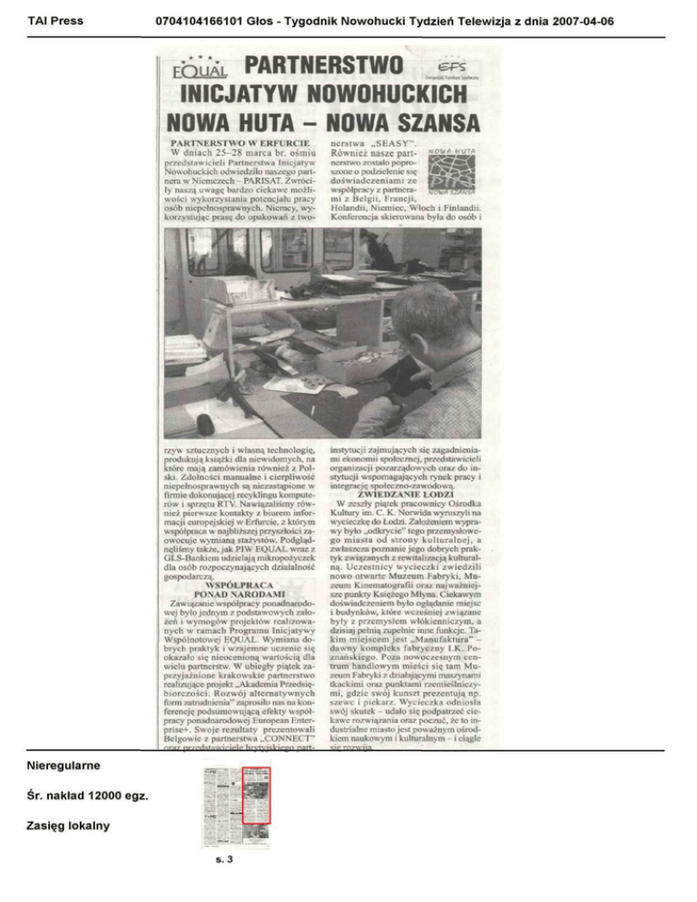 TAI Press 0704104166101 Głos - Tygodnik Nowohucki Tydzień Telewizja z dnia 2007-04-06 huXL PARTNERSTWO INICJATYW NOWOHUCKICH NOWA HUTA - NOWA SZANSA F •Li*^i*"™""i««™«"ii* Eytcpejjk' Fundusz Społeczny PARTNERSTWO W ERFURCIE W dniach 25-28 marca br. ośmiu przedstawicieli Partnerstwa Inicjatyw Nowohuckich odwiedziło naszego partnera w Niemczech - PAR1SAT. Zwróciły naszą uwagą bardzo ciekawe możliwości wykorzystania potencjału pracy osób niepełnosprawnych. Niemcy, wykorzystując prasę do opakowań z two- nerstwa „SEASY". Również nasze partnerstwo zostało poproszone o podzielenie się doświadczeniami ze współpracy z partnerami z Belgii, Francji, Holandii, Niemiec, Włoch i Finlandii. Konferencja skierowana była do osób i rzyw sztucznych i własną technologię, produkują książki dla niewidomych, na które mają zamówienia również z Polski. Zdolności manualne i cierpliwość niepełnosprawnych są niezastąpione w firmie dokonującej recyklingu komputerów i sprzętu RTV. Nawiązaliśmy również pierwsze kontakty z biurem informacji europejskiej w Erfurcie, z którym współpraca w najbliższej przyszłości zaowocuje wymianą stażystów. Podglądnęliśmy także, jak PIW EQUAL wraz z GLS-Bankiem udzielają mikropożyczek dla osób rozpoczynających działalność gospodarczą. WSPÓŁPRACA PONAD NARODAMI Zawiązanie współpracy ponadnarodowej było jednym z podstawowych założeń i wymogów projektów realizowanych w ramach Programu Inicjatywy Wspólnotowej EQUAL. Wymiana dobrych praktyk i wzajemne uczenie się okazało się nieocenioną wartością dla wielu partnerstw. W ubiegły piątek zaprzyjaźnione krakowskie partnerstwo realizujące projekt „Akademia Przedsiębiorczości. Rozwój alternatywnych form zatrudnienia" zaprosiło nas na konferencję podsumowującą efekty współpracy ponadnarodowej European Enterprise+. Swoje rezultaty prezentowali Belgowie z partnerstwa „CONNECT" instytucji zajmujących się zagadnieniami ekonomii społecznej, przedstawicieli organizacji pozarządowych oraz do instytucji wspomagających rynek pracy i integrację społeczno-zawodową. ZWIEDZANIE ŁODZI W zeszły piątek pracownicy Ośrodka Kultury im. C. K. Norwida wyruszyli na wycieczkę do Łodzi. Założeniem wyprawy było „odkrycie" tego przemysłowego miasta od strony k u l t u r a l n e j , a zwłaszcza poznanie jego dobrych praktyk związanych z rewitalizacją kulturalną. Uczestnicy wycieczki zwiedzili nowo otwarte Muzeum Fabryki, Muzeum Kinematografii oraz najważniejsze punkty Księżego Młyna. Ciekawym doświadczeniem było oglądanie miejsc i budynków, które wcześniej związane były z przemysłem włókienniczym, a dzisiaj pełnią zupełnie inne funkcje. Takim miejscem jest „Manufaktura" dawny kompleks fabryczny I.K. Poznańskiego. Poza nowoczesnym centrum handlowym mieści się tam Muzeum Fabryki z działającymi maszynami tkackimi oraz punktami rzemieślniczymi, gdzie swój kunszt prezentują np. szewc i piekarz. Wycieczka odniosła swój skutek - udało się podpatrzeć ciekawe rozwiązania oraz poczuć, że to industrialne miasto jest poważnym ośrodkiem naukowym i kulturalnym - i ciągle nra? nr7f"*Hstawirip|p hrytyi^kip.pn nart- Nieregularne Śr. nakład 12000egz. Zasięg lokalny s. 3 sip rnzwllfl TAI Press 0704104166102 Głos - Tygodnik Nowohucki Tydzień Telewizja z dnia 2007-04-06 Nieregularne Śr. nakład 12000egz. Zasięg lokalny s. 3