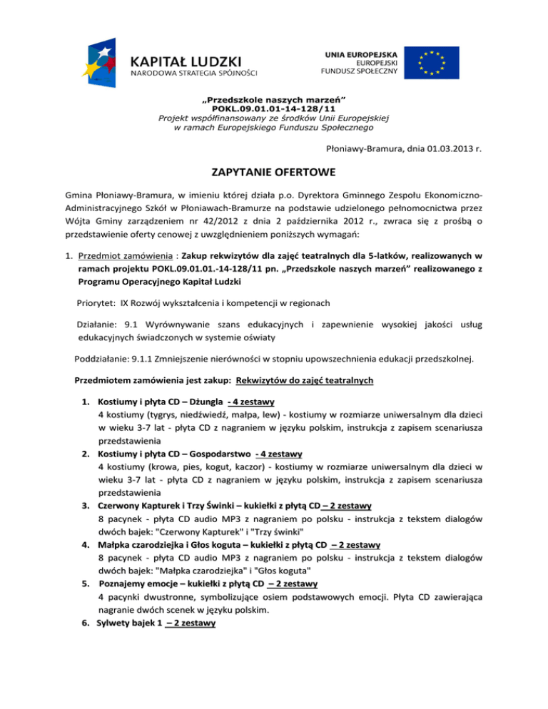 „Przedszkole naszych marzeń” POKL.09.01.01-14-128/11 Projekt współfinansowany ze środków Unii Europejskiej w ramach Europejskiego Funduszu Społecznego Płoniawy-Bramura, dnia 01.03.2013 r. ZAPYTANIE OFERTOWE Gmina Płoniawy-Bramura, w imieniu której działa p.o. Dyrektora Gminnego Zespołu EkonomicznoAdministracyjnego Szkół w Płoniawach-Bramurze na podstawie udzielonego pełnomocnictwa przez Wójta Gminy zarządzeniem nr 42/2012 z dnia 2 października 2012 r., zwraca się z prośbą o przedstawienie oferty cenowej z uwzględnieniem poniższych wymagań: 1. Przedmiot zamówienia : Zakup rekwizytów dla zajęć teatralnych dla 5-latków, realizowanych w ramach projektu POKL.09.01.01.-14-128/11 pn. „Przedszkole naszych marzeń” realizowanego z Programu Operacyjnego Kapitał Ludzki Priorytet: IX Rozwój wykształcenia i kompetencji w regionach Działanie: 9.1 Wyrównywanie szans edukacyjnych i zapewnienie wysokiej jakości usług edukacyjnych świadczonych w systemie oświaty Poddziałanie: 9.1.1 Zmniejszenie nierówności w stopniu upowszechnienia edukacji przedszkolnej. Przedmiotem zamówienia jest zakup: Rekwizytów do zajęć teatralnych 1. Kostiumy i płyta CD – Dżungla - 4 zestawy 4 kostiumy (tygrys, niedźwiedź, małpa, lew) - kostiumy w rozmiarze uniwersalnym dla dzieci w wieku 3-7 lat - płyta CD z nagraniem w języku polskim, instrukcja z zapisem scenariusza przedstawienia 2. Kostiumy i płyta CD – Gospodarstwo - 4 zestawy 4 kostiumy (krowa, pies, kogut, kaczor) - kostiumy w rozmiarze uniwersalnym dla dzieci w wieku 3-7 lat - płyta CD z nagraniem w języku polskim, instrukcja z zapisem scenariusza przedstawienia 3. Czerwony Kapturek i Trzy Świnki – kukiełki z płytą CD – 2 zestawy 8 pacynek - płyta CD audio MP3 z nagraniem po polsku - instrukcja z tekstem dialogów dwóch bajek: "Czerwony Kapturek" i "Trzy świnki" 4. Małpka czarodziejka i Głos koguta – kukiełki z płytą CD – 2 zestawy 8 pacynek - płyta CD audio MP3 z nagraniem po polsku - instrukcja z tekstem dialogów dwóch bajek: "Małpka czarodziejka" i "Głos koguta" 5. Poznajemy emocje – kukiełki z płytą CD – 2 zestawy 4 pacynki dwustronne, symbolizujące osiem podstawowych emocji. Płyta CD zawierająca nagranie dwóch scenek w języku polskim. 6. Sylwety bajek 1 – 2 zestawy „Przedszkole naszych marzeń” POKL.09.01.01-14-128/11 Projekt współfinansowany ze środków Unii Europejskiej w ramach Europejskiego Funduszu Społecznego 97 sylwet do 4 bajek: Rzepka, Kopciuszek, Jaś i Małgosia, Czerwony Kapturek, Wycięte elementy z kartonu przedstawiają postacie i rekwizyty z najbardziej popularnych bajek. wysokość od 8 do 33 cm. 7. Sylwety bajek 2 – 2 zestawy 96 sylwet do 4 bajek: Królewna Śnieżka, Calineczka, Kot w butach, Królowa Śniegu. Wycięte elementy z kartonu przedstawiają postacie i rekwizyty z najbardziej popularnych bajek. Wysokość od 13 do 33 cm. 8. Komplet 13 kostiumów – 2 zestawy 13 kostiumów w formie peleryn z nakryciami głowy (biedronka, słoń, pies, królik, tygrys, lew, leopard, wilk, jeż, król, królowa, czarnoksiężnik, wróżka). 9. Miękkie maski zwierząt – 4 zestawy 8 różnych masek (słoń, krowa, kaczka, królik, myszka, tygrys, kura, pies) - wym. watowanej przodu 8 x 18 cm - maks. rozciągnięcie gumki 40 cm. 10. Kredki do malowania twarzy IOVI – 10 kolorów – 10 zestawów 10 kredek do malowania twarzy 11. Duży teatrzyk z kurtyną – 2 zestawy Scena teatralna dla pacynek i ich animatorów. Rozmiary minimalne: wysokość 120 cm, szerokość 70 cm, boki 40 cm. 12. Chusta animacyjna 3,5 m – 2 zestawy Spadochron o śr. 3,5 m posiadający uchwyty. 13. Piłeczki do chust animacyjnych – 2 zest Lekkie piłeczki plastikowe napompowane powietrzem do zabaw z chustą animacyjną w ilości co najmniej 25 szt (zestaw różnokolorowy) 14. Tunel animacyjny– 2 zestawy Materiał: poliester. Średnica: co najmniej 60 cm, długość: co najmniej 300 cm 15. Bajki grajki – 6 zestawów O krasnoludkach i o sierotce Marysi – 2 szt. Calineczka – 2 szt. Brzydkie kaczątko – 2 szt. 16. Strój mima zielony – 1 zestaw 1 sztuka - wykonany z bardzo wytrzymałego poliestru - wym. 120 x 75 cm - zapięcie na rzep 17. Strój mima niebieski – 1 zestaw 1 sztuka - wykonany z bardzo wytrzymałego poliestru - wym. 120 x 75 cm - zapięcie na rzep 18. Zmienne maski emocji – 1 zestaw Nr katalogowy 070-9015 (cena: 119,00) 15 części maski "oczy" - 15 części maski "usta" - wykonane z laminowanego papieru (wym. 10 x 20 cm) 19. Duże obrazy – Emocje – 1 zestaw „Przedszkole naszych marzeń” POKL.09.01.01-14-128/11 Projekt współfinansowany ze środków Unii Europejskiej w ramach Europejskiego Funduszu Społecznego 12 czarno-białych plansz 40 x 52 cm - płyta CD z 18-minutowym nagraniem – instrukcja 20. Torba z instrumentami 2 – 2 zestawy 2 tamburyny (1 o średnicy 15 cm i 1 o średnicy 20 cm) 5 trójkątów (10-20 cm) 2 drewniane marakasy 1 marakas podwójny 1 duża tarka giro 2 tonbloki dwutonowe 1 tonblok jednotonowy 1 pudełko akustyczne 3 kastaniety (1 na rączce i 2 do chwytania) 2 pary klawesów 3 dzwoneczki na rączce 1 kijek z dzwonkami metalowy shaker 4 pałeczki . całość umieszczona w poręcznej zamykanej torbie 21. Płyta CD z fotografiami – słuchamy, rozpoznajemy i naśladujemy dźwięki – 1 zestaw 30 dźwięków 30 kart z fotografiami 11x8,5 cm instrukcja w języku polskim 22. Zwiewne chusty – 1 zestaw 10 różnokolorowych chust nylonowych, rozmiar 140 x 140 cm 23. Komplet bębenków ręcznych z pałeczkami – 1 zestaw 3 bębenki o średnicy 20, 25 i 30 cm 3 pałeczki torba Zamawiający nie dopuszcza składania ofert częściowych. 2. Miejsce i termin realizacji zamówienia: Zamówione materiały należy dostarczyć do biura projektu Gminny Zespół Ekonomiczno-Administracyjny Szkół Płoniawy-Bramura 83A, 06-210 PłoniawyBramura Termin realizacji zamówienia: do dnia 25 marca 2013 r. 3. Kryteria jakości