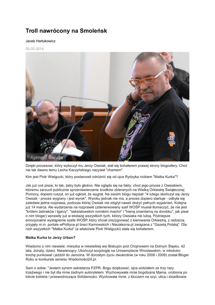 Troll nawrócony na Smoleńsk Jacek Harłukowicz 05.03.2014 Dzięki procesowi, który wytoczył mu Jerzy Owsiak, stał się bohaterem prawej strony blogosfery. Choć nie tak dawno temu Lecha Kaczyńskiego nazywał "chamem". Kim jest Piotr Wielgucki, który postanowił odróżnić się od ojca Rydzyka nickiem "Matka Kurka"? Jak już coś pisze, to tak, żeby było głośno. Nie ogląda się na fakty: choć jego proces z Owsiakiem, któremu zarzucił publicznie sprzeniewierzanie środków zbieranych na Wielką Orkiestrę Świątecznej Pomocy, dopiero ruszył, on już ogłosił, że wygrał. Na swoim blogu napisał: "4 lutego skończył się Jerzy Owsiak - proces wygrany i jest wyrok". Wyroku jednak nie ma, a proces dopiero startuje - odbyła się zaledwie jedna rozprawa, podczas której Owsiak nie zdążył nawet złożyć pełnych wyjaśnień. Kolejna już 14 marca. Ale wydarzenia na rozprawie (zdenerwowany szef WOŚP musiał tłumaczyć, że nie jest "królem żebraków i łgarzy", "seksistowskim romskim macho" i "hieną cmentarną na dorobku", jak pisał o nim bloger) wprawiły już w ekstazę wszystkich tych, którzy Owsiaka nie lubią. Późniejsze emocjonalne wystąpienie szefa WOŚP, który chciał zrezygnować z kierowania Orkiestrą, z radością przyjęły m.in. portale wPolityce.pl braci Karnowskich i Niezalezna.pl związana z "Gazetą Polską". Dla nich wszystkich "Matka Kurka" (a właściwie Piotr Wielgucki) stała się bohaterem. Matka Kurka to Jerzy Urban? Wiadomo o nim niewiele: mieszka w niewielkiej wsi Biskupin pod Chojnowem na Dolnym Śląsku. 42 lata, żonaty, dzieci. Niewierzący. Ukończył socjologię na Uniwersytecie Wrocławskim, w młodości trochę punkował i jeździł do Jarocina. W dorosłym życiu dwukrotnie (w roku 2008 i 2009) został Bloger Roku w konkursie serwisu Wiadomości24.pl. Sam o sobie: "Jestem synem sekretarza PZPR. Bogu dziękować, ojca widziałem ze trzy razy trzeźwego i nie był dla mnie żadnym autorytetem. Wychowywała mnie bogobojna Mama, urobiona po łokcie kobieta i przewodnicząca Solidarności. Wychowała mnie, z kluczem na szyi, ulica i dziadkowie repatrianci, dla których praca, Bóg i ostatni grosz oddany dzieciom do dziś jest sensem życia". W internecie zaczął funkcjonować pod koniec lat 90. W sieci do dziś znaleźć można jego wpisy z czasów, gdy podpisywał się jeszcze jako "Wielbłąd" i na różnych forach strofował swoich rozmówców. Podczas dyskusji o koszmarach jednemu ze swoich interlokutorów proponował "nowy rozumek, najlepiej używany, bo ten, którym dysponuje, jest jeszcze owinięty folią i wyłożony trocinami", a dyskutantce z grupy Psychologia radził: "To moja diagnoza: albo przekwitasz, cycki Ci obwisły i płaczesz do poduszki, w dzień żelazną damę rżnąc i pewnie na domiar złego baterie się skończyły w wibratorze, a londyńskie nie pasują". Gdy w 2006 r. pojawił się pierwszy polski blogerski serwis polityczny - Salon24.pl - Wielgucki przerzucił się na publicystykę. Najpierw publikował pod nickiem "Ketman". W połączeniu z wściekle antypisowską publicystyką powodowało to podejrzenia, że jest Lesławem Maleszką (innym razem Jerzym Urbanem lub Moniką Olejnik). Dopiero później przechrzcił się na "Matkę Kurkę". Jak sam tłumaczył, jego pseudonim to przeciwieństwo zbitki ojciec Rydzyk: "Myli się jednak ten, kto doszukuje się w Matce Kurce przeciwnika dla ojca Rydzyka. (...) Nie interesuje Matki Ojciec, Matkę interesuje odebranie Ojcu praw rodzicielskich, ponieważ dzieci wychowywane przez Ojca w atmosferze gęstych oparów absurdu, klimacie sekty, nienawiści do człowieczeństwa i dorobku kulturowego cywilizacji europejskiej nie może być modelem zachowań". W Salonie24.pl długo miejsca nie zagrzał. Obrażał wszystko i wszystkich, więc ostatecznie zablokowano mu możliwość publikowania. - Co jakiś czas zdarzały nam się przypadki odejść blogerów. Zwykle działo się to wtedy, gdy Igor Janke próbował egzekwować od użytkowników platformy elementarne zasady kultury - wspomina "Matkę Kurkę" Gniewomir Świechowski, wówczas administrujący Salonem 24. - On przez długi czas doskonale się kamuflował, ale jego insynuacje i lubość, z jaką potrafił skłócać ze sobą ludzi, doprowadziły do sytuacji, że w końcu musieliśmy powiedzieć mu "dość" i poprosić o opuszczenie naszej platformy. Kaczyńscy to dziecko i pijak Obrażony na Salon 24 "Matka Kurka" stworzył portal Kontrowersje.net, który redaguje i którego jest niekwestionowaną gwiazdą. To tam w kwietniu zamieścił swój tekst "Polską rządzą dwa ruskie cwele: Tusk i Komorowski", który po raz pierwszy zawiódł go na salę sądową: w czerwcu ub.r. został uznany za winnego lżenia głowy państwa, ale sąd warunkowo odstąpił od wymierzenia kary. - Nie można mylić swobody wyrażania poglądów z obrażaniem konkretnych osób. Nie ma wątpliwości, że artykuł był tylko pretekstem do znieważenia głowy państwa - uznał sędzia. To było jednak już po wewnętrznej transformacji, jaką przeszedł bloger. Tymczasem jego wcześniejsza publicystyka dzisiejszych wielbicieli mogłaby zrzucić z krzesła. 22 lutego 2006 roku na stronie Matka-kurka.net pisał: "Nikt o Kaczyńskich tak naprawdę nie słyszał, każdy Polak znał Kuronia, Wałęsę, Lisa, Gwiazdę, Modzelewskiego, Frasyniuka, Bujaka, ale nie Kaczyńskich, nie znał, bo się niczym szczególnym nie wyróżniali, siedzieli cichutko przyklejeni do Wałęsy, który ich później wylansował, a którego oni opluli i odsądzili od czci i wiary". 25 września 2008 r. już na Kontrowersje.net: "Nie lubię Kaczyńskich, ponieważ są chodzącym symbolem polskiego stereotypu, wszystko, co można najgorszego powiedzieć o Polakach, jest zawarte w organizmach i działaniach tych dwóch Panów. () Jednym z flagowych zawołań Kaczyńskich jest wiara ojców, ale za symbol wiary ojców wybrali Kaczyńscy katolicką mutację, katolicką 