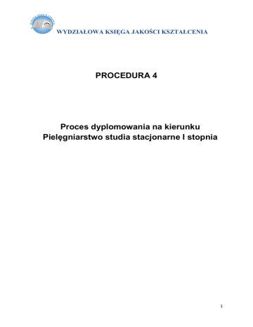 WYDZIAŁOWA KSIĘGA JAKOŚCI KSZTAŁCENIA PROCEDURA 4 Proces dyplomowania na kierunku Pielęgniarstwo studia stacjonarne I stopnia 1 WYDZIAŁOWA KSIĘGA JAKOŚCI KSZTAŁCENIA 1. ZAKRES PROCEDURY Procedura obejmuje Dziekana jednostki organizacyjnej, Prodziekana ds. studenckich, Kierownika jednostki organizacyjnej, nauczyciele akademiccy wchodzący w skład komisji losujących, komisji egzaminacyjnych egzaminu dyplomowego praktycznego i egzaminu dyplomowego teoretycznego. 2. TERMINOLOGIA Egzamin dyplomowy jest sprawdzianem stopnia opanowania wiedzy przez studenta oraz umiejętności praktycznych w podejmowaniu działań pielęgnacyjnych wobec pacjenta będącego w różnych stanach zdrowia i choroby. Po uzyskaniu pozytywnej oceny z egzaminu dyplomowego praktycznego i teoretycznego absolwent otrzymuje tytuł zawodowy licencjata pielęgniarstwa. 3. ODPOWIEDZIALNOŚĆ Dziekan Wydziału odpowiada za: ● ustalenie zakresu egzaminu dyplomowego teoretycznego i praktycznego oraz przedstawienie go Radzie Wydziału do zatwierdzenia ● ustalenie składu komisji losujących, komisji egzaminacyjnej egzaminu praktycznego oraz egzaminu teoretycznego i przedstawienie Radzie Wydziału do zatwierdzenia ● wyznaczenie terminów egzaminów dyplomowych oraz terminu egzaminu dyplomowego poprawkowego, które przedstawia Radzie Wydziału do zatwierdzenia ● podanie do wiadomości studentom na początku semestru dyplomowego zakresu egzaminu dyplomowego praktycznego i teoretycznego oraz terminów egzaminów dyplomowych, a także terminu egzaminu poprawkowego Prodziekan ds. studenckich, Kierownik Zakładu odpowiada za: ● podanie do wiadomości studentom na początku semestru dyplomowego bazy pytań wykorzystywanych w trakcie egzaminu teoretycznego, utworzonej przez nauczycieli akademickich ● sprawowanie nadzoru nad prawidłowym przebiegiem egzaminu dyplomowego teoretycznego i praktycznego oraz egzaminu poprawkowego ● zgłaszanie wszelkich problemów dotyczących przebiegu egzaminu dyplomowego Dziekanowi Wydziału Osoby wchodzące w skład komisji losujących odpowiadają za: ● zapoznanie studentów z regulaminem egzaminu dyplomowego praktycznego i teoretycznego ● prawidłowy przebieg losowania ● sporządzenie protokołu z losowania i przedstawienie go Dziekanowi Wydziału 2 WYDZIAŁOWA KSIĘGA JAKOŚCI KSZTAŁCENIA Osoby wchodzące w skład komisji egzaminacyjnych egzaminu dyplomowego praktycznego i egzaminu dyplomowego teoretycznego odpowiadają za: ● przygotowanie zadań egzaminu dyplomowego praktycznego, ● towarzyszenie studentowi przy wszystkich wykonywanych przez niego czynnościach na oddziale ● ocenę indywidualnej pracy studenta z pacjentem ● ocenę: wykonania czynności pielęgnacyjnych oraz pisemnego opracowania procesu pielęgnowania przygotowanego przez studenta ● gromadzenie informacji o zdającym w arkuszu oceny wykonania zadania egzaminacyjnego ● przedstawienie oceny z egzaminu praktycznego do wiadomości studenta bezpośrednio po zakończeniu egzaminu praktycznego 4. TERMIN REALIZACJI Po zaliczeniu wszystkich modułów, zajęć praktycznych i praktyk zawodowych przewidzianych w planie studiów, do końca semestru dyplomowego - zgodnie z harmonogramem roku akademickiego. 5. OPIS PROCEDURY 5.1. Student zobowiązany jest do zdania egzaminu dyplomowego licencjackiego zgodnie ze standardem nauczania. 5.2. Student zostaje dopuszczony do egzaminu dyplomowego licencjackiego jeśli zaliczył wszystkie przedmioty i praktyki zawodowe przewidziane w planie studiów oraz złożył w dziekanacie pracę dyplomową licencjacką ocenioną pozytywnie przez promotora. 5.3. Egzamin dyplomowy licencjacki składa się z egzaminu teoretycznego i praktycznego. 5.4. Zakres egzaminu teoretycznego i praktycznego zatwierdza Rada Wydziału na wniosek dziekana i podaje do informacji studentom na początku semestru dyplomowego. 5.5. Rada Wydziału na wniosek Dziekana zatwierdza skład Komisji Losującej, Komisji Egzaminacyjnych egzaminu praktycznego oraz Komisję Egzaminacyjną egzaminu teoretycznego. 5.6. Terminy egzaminów dyplomowych zatwierdza Rada Wydziału na wniosek dziekana w semestrze poprzedzającym semestr dyplomowy i podaje do wiadomości studentom. 5.7. Termin egzaminu dyplomowego poprawkowego wyznacza Dziekan zgodnie z regulaminem studiów ATH. 3 WYDZIAŁOWA KSIĘGA JAKOŚCI KSZTAŁCENIA 5.8. Ocenę egzaminu dyplomowego teoretycznego i praktycznego stanowi średnia z obu ocen, przy czym obie oceny muszą być pozytywne. Średnią ocenę z przebiegu studiów oblicza się wg wzoru zamieszczonego w regulaminie studiów ATH. 5.9. Egzamin dyplomowy teoretyczny ma formę testu jednokrotnego wyboru. Przeprowadzany jest przez Komisję Egzaminacyjną, której skład stanowią przewodniczący i przynajmniej czterech członków, będących nauczycielami akademickimi Wydziału Nauk o Zdrowiu. 5.10. Baza pytań wykorzystywanych w trakcie egzaminu teoretycznego jest utworzona przez nauczycieli akademickich WNoZ i podana do wiadomości studentom na początku semestru dyplomowego. 5.11. Pytania egzaminu teoretycznego obejmują treści z zakresu: podstaw pielęgniarstwa, podstawowej opieki zdrowotnej, pielęgniarstwa pediatrycznego, pielęgniarstwa chirurgicznego, pielęgniarstwa internistycznego, pielęgniarstwa położniczo-ginekologicznego, pielęgniarstwa geriatrycznego, pielęgniarstwa neurologicznego, pielęgniarstwa psychiatrycznego, pielęgniarstwa w intensywnej terapii. 5.12. Podstawą zdania egzaminu teoretycznego jest uzyskanie 60% pozytywnych odpowiedzi. 5.13. Egzamin dyplomowy praktyczny na kierunku Pielęgniarstwo polega na wykonaniu zadania praktycznego (próba pracy), a odbywa się z przedmiotów kierunkowych wyznaczonych przez Dziekana, a zatwierdzonych przez Radę Wydziału. 5.14. Egzamin z każdego przedmiotu kierunkowego prowadzi odrębna Komisja na terenie oddziału szpitalnego. 5.15. Losowanie przedmiotu kierunkowego (oddziału) oraz daty i godziny egzaminu praktycznego przeprowadza s