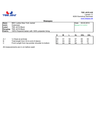 TEE JAYS A/S Lansen 11 9230 Svenstrup Denmark www.teejays.dk Sizespec Style: mark: Label: Hangtag: Fabric: A.1 B C 9651 Ladies New York Jacket Outerwear TEE JAYS Black TEE JAYS Black 100% Polyamid taslan with 100% polyester lining ½ Chest at armhole Total length from Cb to end of sleeve Front Length from top pointer shoulder to bottom All measurements are in cm before wash Date 05.03.2014 Revised 10.12.2014 S M L XL XXL 3XL 49 81 62 51 83 64 54 85 66 57 87 68 60 89 70 63 91 72 LADIES NEW YORK Style 9651 New York is our fashion bomber jacket with lots of details and high finish. Made of high quality materials with optimal breathability, wind and water resistant properties, which shows that New York means serious business. SPECIFICATIONS Black Tailored fashion fit // Inner pocket prepared for Mp3 // 2 large front pockets // Inside zipper for decoration // Quality zippers 100% polyamid taslan/100% polyester lining S-3XL 10/1 pcs. www.teejays.dk Powered by TCPDF (www.tcpdf.org)