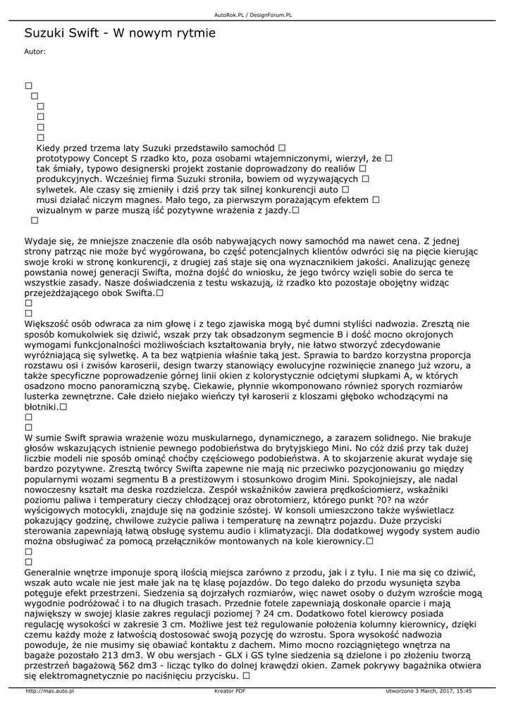 AutoRok.PL / DesignForum.PL Suzuki Swift - W nowym rytmie Autor: Kiedy przed trzema laty Suzuki przedstawiło samochód prototypowy Concept S rzadko kto, poza osobami wtajemniczonymi, wierzył, że tak śmiały, typowo designerski projekt zostanie doprowadzony do realiów produkcyjnych. Wcześniej firma Suzuki stroniła, bowiem od wyzywających sylwetek. Ale czasy się zmieniły i dziś przy tak silnej konkurencji auto musi działać niczym magnes. Mało tego, za pierwszym porażającym efektem wizualnym w parze muszą iść pozytywne wrażenia z jazdy. Wydaje się, że mniejsze znaczenie dla osób nabywających nowy samochód ma nawet cena. Z jednej strony patrząc nie może być wygórowana, bo część potencjalnych klientów odwróci się na pięcie kierując swoje kroki w stronę konkurencji, z drugiej zaś staje się ona wyznacznikiem jakości. Analizując genezę powstania nowej generacji Swifta, można dojść do wniosku, że jego twórcy wzięli sobie do serca te wszystkie zasady. Nasze doświadczenia z testu wskazują, iż rzadko kto pozostaje obojętny widząc przejeżdżającego obok Swifta. Większość osób odwraca za nim głowę i z tego zjawiska mogą być dumni styliści nadwozia. Zresztą nie sposób komukolwiek się dziwić, wszak przy tak obsadzonym segmencie B i dość mocno okrojonych wymogami funkcjonalności możliwościach kształtowania bryły, nie łatwo stworzyć zdecydowanie wyróżniającą się sylwetkę. A ta bez wątpienia właśnie taką jest. Sprawia to bardzo korzystna proporcja rozstawu osi i zwisów karoserii, design twarzy stanowiący ewolucyjne rozwinięcie znanego już wzoru, a także specyficzne poprowadzenie górnej linii okien z kolorystycznie odciętymi słupkami A, w których osadzono mocno panoramiczną szybę. Ciekawie, płynnie wkomponowano również sporych rozmiarów lusterka zewnętrzne. Całe dzieło niejako wieńczy tył karoserii z kloszami głęboko wchodzącymi na błotniki. W sumie Swift sprawia wrażenie wozu muskularnego, dynamicznego, a zarazem solidnego. Nie brakuje głosów wskazujących istnienie pewnego podobieństwa do brytyjskiego Mini. No cóż dziś przy tak dużej liczbie modeli nie sposób ominąć choćby częściowego podobieństwa. A to skojarzenie akurat wydaje się bardzo pozytywne. Zresztą twórcy Swifta zapewne nie mają nic przeciwko pozycjonowaniu go między popularnymi wozami segmentu B a prestiżowym i stosunkowo drogim Mini. Spokojniejszy, ale nadal nowoczesny kształt ma deska rozdzielcza. Zespół wskaźników zawiera prędkościomierz, wskaźniki poziomu paliwa i temperatury cieczy chłodzącej oraz obrotomierz, którego punkt ?0? na wzór wyścigowych motocykli, znajduje się na godzinie szóstej. W konsoli umieszczono także wyświetlacz pokazujący godzinę, chwilowe zużycie paliwa i temperaturę na zewnątrz pojazdu. Duże przyciski sterowania zapewniają łatwą obsługę systemu audio i klimatyzacji. Dla dodatkowej wygody system audio można obsługiwać za pomocą przełączników montowanych na kole kierownicy. Generalnie wnętrze imponuje sporą ilością miejsca zarówno z przodu, jak i z tyłu. I nie ma się co dziwić, wszak auto wcale nie jest małe jak na tę klasę pojazdów. Do tego daleko do przodu wysunięta szyba potęguje efekt przestrzeni. Siedzenia są dojrzałych rozmiarów, więc nawet osoby o dużym wzroście mogą wygodnie podróżować i to na długich trasach. Przednie fotele zapewniają doskonałe oparcie i mają największy w swojej klasie zakres regulacji poziomej ? 24 cm. Dodatkowo fotel kierowcy posiada regulację wysokości w zakresie 3 cm. Możliwe jest też regulowanie położenia kolumny kierownicy, dzięki czemu każdy może z łatwością dostosować swoją pozycję do wzrostu. Spora wysokość nadwozia powoduje, że nie musimy się obawiać kontaktu z dachem. Mimo mocno rozciągniętego wnętrza na bagaże pozostało 213 dm3. W obu wersjach - GLX i GS tylne siedzenia są dzielone i po złożeniu tworzą przestrzeń bagażową 562 dm3 - licząc tylko do dolnej krawędzi okien. Zamek pokrywy bagażnika otwiera się elektromagnetycznie po naciśnięciu przycisku. http://mas.auto.pl Kreator PDF Utworzono 3 March, 2017, 15:45 AutoRok.PL / DesignForum.PL Jazda Swiftem zaczyna się od miłego akcentu świadczącego, że Suzuki na dobre weszło w XXI wiek. Otwierając zamki drzwi i uruchamiając silnik nie musimy wyjmować kluczyka z kieszeni. Wystarczy go mieć ze sobą. Nie jest nam potrzebny, bo stacyjka ma własne pokrętło. 92-konny silnik 1,3 kręcący się do 6,8 tys obr/min. pracuje cicho i dynamicznie. Przyspieszenie 11 s do 100 km/h i prędkość maksymalna 175 km/h wydają się bardzo przyzwoitymi osiągami, podobnie zresztą jak i średnie zużycie paliwa 6,2 dm3/100 km. Siłę wspomagania układu kierowniczego oraz hamulcowego dobrano po europejsku, a więc w sposób zapewniający dobre wyczucie tego, co dzieje się z kołami. Uzyskano też dużą precyzję działania mechanizmu zmiany biegów. Dużym plusem jest umiejętne dobranie zawieszenia, które w tym wydaniu wyjątkowo skutecznie zapobiega pochylaniu się nadwozia na zakrętach, a jednocześnie pochłania nierówności nawierzchni bez efektów nieprzyjemnych dla pasażerów. Jednym słowem, stanowi dobry kompromis między charakterystyką sportową a komfortową. O ile wiosną 2005 wprowadzono 5-drzwiową wersję nadwozia, latem pojawiła się odmiana 3-drzwiowa, dostępna z silnikami 1,3 i 1,5. Ta ostatnia o mocy 102 KM wyposażona została w mechanizm VVT zapewniający zmienne fazy rozrządu. To udoskonalenie dało odpowiednio większą dynamikę jazdy, o czym świadczy przyspieszenie do setki w 10 s i prędkość maksymalna 185 km/h. Zużycie paliwa nie podskoczyło znacząco; średnio wynosi ono 6,5 dm3/100 km. Najdłużej przyszło czekać na wersję z jednostką wysokoprężną 1.3 pochodzącą z naszej produkcji krajowej. Tym, którzy dużo podróżują z pewnością okres oczekiwania opła
