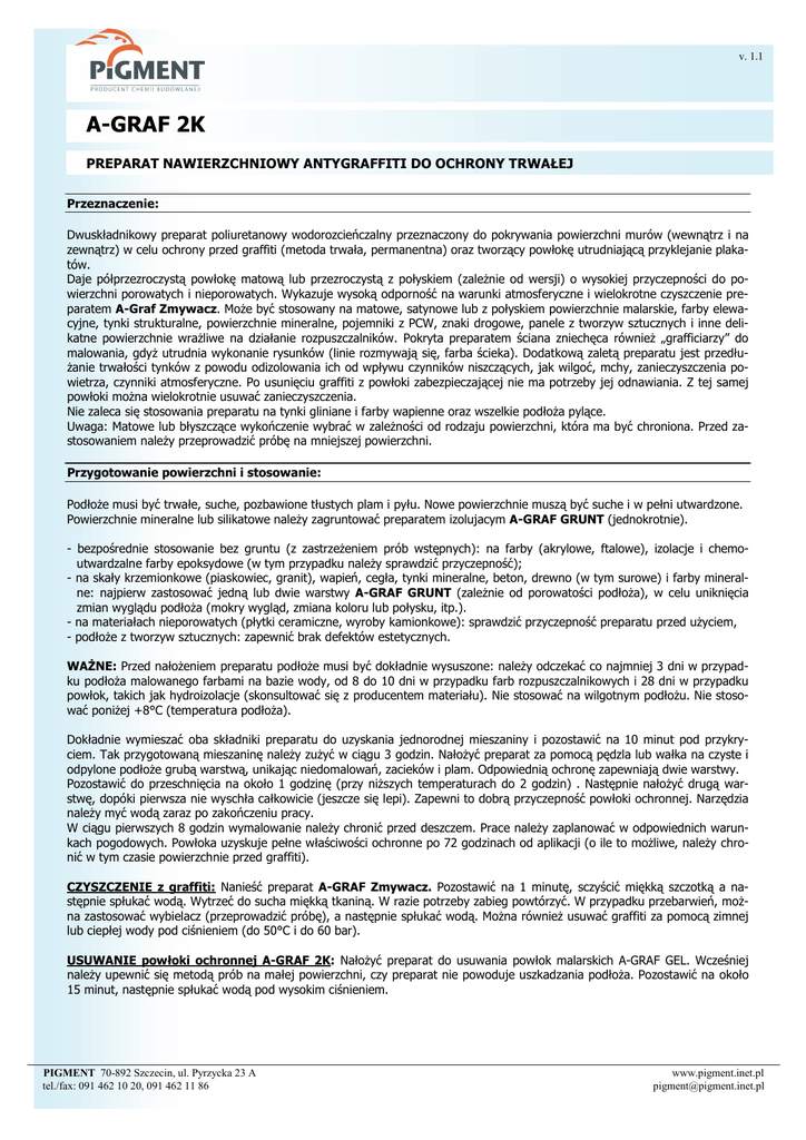 v. 1.1 A-GRAF 2K PREPARAT NAWIERZCHNIOWY ANTYGRAFFITI DO OCHRONY TRWAŁEJ Przeznaczenie: Dwuskładnikowy preparat poliuretanowy wodorozcieńczalny przeznaczony do pokrywania powierzchni murów (wewnątrz i na zewnątrz) w celu ochrony przed graffiti (metoda trwała, permanentna) oraz tworzący powłokę utrudniającą przyklejanie plakatów. Daje półprzezroczystą powłokę matową lub przezroczystą z połyskiem (zaleŜnie od wersji) o wysokiej przyczepności do powierzchni porowatych i nieporowatych. Wykazuje wysoką odporność na warunki atmosferyczne i wielokrotne czyszczenie preparatem A-Graf Zmywacz. MoŜe być stosowany na matowe, satynowe lub z połyskiem powierzchnie malarskie, farby elewacyjne, tynki strukturalne, powierzchnie mineralne, pojemniki z PCW, znaki drogowe, panele z tworzyw sztucznych i inne delikatne powierzchnie wraŜliwe na działanie rozpuszczalników. Pokryta preparatem ściana zniechęca równieŜ „grafficiarzy” do malowania, gdyŜ utrudnia wykonanie rysunków (linie rozmywają się, farba ścieka). Dodatkową zaletą preparatu jest przedłuŜanie trwałości tynków z powodu odizolowania ich od wpływu czynników niszczących, jak wilgoć, mchy, zanieczyszczenia powietrza, czynniki atmosferyczne. Po usunięciu graffiti z powłoki zabezpieczającej nie ma potrzeby jej odnawiania. Z tej samej powłoki moŜna wielokrotnie usuwać zanieczyszczenia. Nie zaleca się stosowania preparatu na tynki gliniane i farby wapienne oraz wszelkie podłoŜa pylące. Uwaga: Matowe lub błyszczące wykończenie wybrać w zaleŜności od rodzaju powierzchni, która ma być chroniona. Przed zastosowaniem naleŜy przeprowadzić próbę na mniejszej powierzchni. Przygotowanie powierzchni i stosowanie: PodłoŜe musi być trwałe, suche, pozbawione tłustych plam i pyłu. Nowe powierzchnie muszą być suche i w pełni utwardzone. Powierzchnie mineralne lub silikatowe naleŜy zagruntować preparatem izolujacym A-GRAF GRUNT (jednokrotnie). - bezpośrednie stosowanie bez gruntu (z zastrzeŜeniem prób wstępnych): na farby (akrylowe, ftalowe), izolacje i chemoutwardzalne farby epoksydowe (w tym przypadku naleŜy sprawdzić przyczepność); - na skały krzemionkowe (piaskowiec, granit), wapień, cegła, tynki mineralne, beton, drewno (w tym surowe) i farby mineralne: najpierw zastosować jedną lub dwie warstwy A-GRAF GRUNT (zaleŜnie od porowatości podłoŜa), w celu uniknięcia zmian wyglądu podłoŜa (mokry wygląd, zmiana koloru lub połysku, itp.). - na materiałach nieporowatych (płytki ceramiczne, wyroby kamionkowe): sprawdzić przyczepność preparatu przed uŜyciem, - podłoŜe z tworzyw sztucznych: zapewnić brak defektów estetycznych. WAśNE: Przed nałoŜeniem preparatu podłoŜe musi być dokładnie wysuszone: naleŜy odczekać co najmniej 3 dni w przypadku podłoŜa malowanego farbami na bazie wody, od 8 do 10 dni w przypadku farb rozpuszczalnikowych i 28 dni w przypadku powłok, takich jak hydroizolacje (skonsultować się z producentem materiału). Nie stosować na wilgotnym podłoŜu. Nie stosować poniŜej +8°C (temperatura podłoŜa). Dokładnie wymieszać oba składniki preparatu do uzyskania jednorodnej mieszaniny i pozostawić na 10 minut pod przykryciem. Tak przygotowaną mieszaninę naleŜy zuŜyć w ciągu 3 godzin. NałoŜyć preparat za pomocą pędzla lub wałka na czyste i odpylone podłoŜe grubą warstwą, unikając niedomalowań, zacieków i plam. Odpowiednią ochronę zapewniają dwie warstwy. Pozostawić do przeschnięcia na około 1 godzinę (przy niŜszych temperaturach do 2 godzin) . Następnie nałoŜyć drugą warstwę, dopóki pierwsza nie wyschła całkowicie (jeszcze się lepi). Zapewni to dobrą przyczepność powłoki ochronnej. Narzędzia naleŜy myć wodą zaraz po zakończeniu pracy. W ciągu pierwszych 8 godzin wymalowanie naleŜy chronić przed deszczem. Prace naleŜy zaplanować w odpowiednich warunkach pogodowych. Powłoka uzyskuje pełne właściwości ochronne po 72 godzinach od aplikacji (o ile to moŜliwe, naleŜy chronić w tym czasie powierzchnie przed graffiti). CZYSZCZENIE z graffiti: Nanieść preparat A-GRAF Zmywacz. Pozostawić na 1 minutę, sczyścić miękką szczotką a następnie spłukać wodą. Wytrzeć do sucha miękką tkaniną. W razie potrzeby zabieg powtórzyć. W przypadku przebarwień, moŜna zastosować wybielacz (przeprowadzić próbę), a następnie spłukać wodą. MoŜna równieŜ usuwać graffiti za pomocą zimnej lub ciepłej wody pod ciśnieniem (do 50°C i do 60 bar). USUWANIE powłoki ochronnej A-GRAF 2K: NałoŜyć preparat do usuwania powłok malarskich A-GRAF GEL. Wcześniej naleŜy upewnić się metodą prób na małej powierzchni, czy preparat nie powoduje uszkadzania podłoŜa. Pozostawić na około 15 minut, następnie spłukać wodą pod wysokim ciśnieniem. PIGMENT 70-892 Szczecin, ul. Pyrzycka 23 A tel./fax: 091 462 10 20, 091 462 11 86 www.pigment.inet.pl [email protected] A-GRAF 2K str. 2 / 2 PREPARAT NAWIERZCHNIOWY ANTYGRAFFITI DO OCHRONY TRWAŁEJ Zalecenia BHP: Stosować zwykłe środki ostroŜności jak przy pracy z innymi wyrobami lakierniczymi. Chronić przed dostępem dzieci. Chronić oczy i powierzchnię skóry przed bezpośrednim kontaktem z wyrobem. Stosować okulary i rękawice ochronne. W przypadku zanieczyszczenia zmyć skórę wodą i mydłem, zabrudzoną odzieŜ zmienić. Oczy natychmiast przepłukać duŜą ilością bieŜącej wody, przez co najmniej 20 minut. W przypadku podraŜnienia udać się do lekarza. Stosować wyłącznie w dobrze wentylowanych pomieszczeniach. Resztek nie wylewać do kanalizacji, dostarczyć do autoryzowanej firmy utylizacji odpadów. Zapoznać się z instrukcją zawartą na etykiecie. UWAGI: Przechowywać w oryginalnym, szczelnie zamkniętym opakowaniu. Chronić utwardzacz przed wilgocią! Chronić praparat przed mrozem. Ze względu na róŜnorodność materiałów stosowanych w budownictwie zawsze zaleca się przeprowadzenie próby na mni