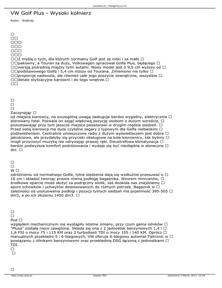 AutoRok.PL / DesignForum.PL VW Golf Plus - Wysoki kołnierz Autor: Andrzej Z myślą o tych, dla których normalny Golf jest za niski i za mało pakowny, a Touran za duży, Volkswagen opracował Golfa Plus, będącego wersją pośrednią między tymi autami. Nowy model jest o 9,5 cm wyższy od podstawowego Golfa i 5,4 cm niższy od Tourana. Zmieniono nie tylko proporcje nadwozia, ale również całe jego poszycie zewnętrzne, wszystkie detale stylizacyjne karoserii i do tego wnętrze. Zaczynając od miejsca kierowcy, na szczególną uwagę zasługuje bardzo wygodny, elektrycznie sterowany fotel. Pozwala on zająć właściwą pozycję osobom o dużym wzroście, pozostawiając przy tym jeszcze miejsce pasażerowi w drugim rzędzie siedzeń. Przed sobą kierowca ma duże czytelne zegary z typowym dla Golfa niebieskim podświetleniem. Centralnie umieszczone radio z dużym wyświetlaczem jest dobre jakościowo, ale przydałyby się przyciski obsługowe na kole kierownicy, tak byśmy mogli przyciszyć muzykę nie odrywając prawej ręki. Dwustrefowa klimatyzacja bardzo podwyższa komfort podróżowania i wydaje się być niezbędna w słoneczne dni. W odróżnieniu od normalnego Golfa, tylne siedzenia dają się wzdłużnie przesuwać o 16 cm i składać tworząc prawie równą podłogę bagażnika. Wzorem minivanów, środkowe oparcie może służyć za podręczny stolik, zaś dookoła nas znajdziemy sporo schowków i uchwytów dostosowanych do różnych potrzeb. Bagażnik w zależności od usytuowania podłogi i pozycji tylnych siedzeń ma pojemność 395-505 dm3, a po ich złożeniu 1450 dm3. Pod względem mechanicznym nie wystąpiły istotne zmiany, przy czym gama silników "Plusa" została nieco zawężona. Składa się ona z 2 jednostek benzynowych 1,4 i 1,6 FSI o mocy 75 i 115 KM oraz 2 turbodiesli TDI o mocy 105 i 140 KM. Oprócz manualnych przekładni 5 i 6-biegowych, VW oferuje 6-biegowy automat Tiptronic w powiązaniu z silnikami benzynowymi oraz przekładnię DSG łączoną z jednostkami TDI. http://mas.auto.pl Kreator PDF Utworzono 3 March, 2017, 15:45 AutoRok.PL / DesignForum.PL Nasz testowy Golf Plus w wersji Sportline już na pierwszy rzut oka mocno wyróżniał się kołami od innych wersji. 17-calowe obręcze wykonano z dwóch elementów skręconych ze sobą. W związku z tym nadają one sportowy charakter całej sylwetce auta. Pod maską mieliśmy 2-litrowego turbodiesla o mocy 140 KM. Wraz ze sześciostopniową skrzynią biegów sprawiał on, że prowadząc nie czuliśmy się jak byśmy podróżowali typowym rodzinnym minivanem, lecz jak sportowym samochodem. Nawet przy sporym obciążeniu z łatwością wchodzi on na obroty. Dzięki temu bez bagażu auto osiąga setkę z niebywałą łatwością w czasie poniżej 10 sekund. Cicha praca silnika i jego wysoka elastyczność pozwala komfortowo wyprzedzać. Mimo niskoprofilowego ogumienia, zawieszenie Golfa+ dobrze radzi sobie z polskimi szlakami urozmaiconymi pofalowanym asfaltem. Układ jezdny wykazuje przy tym cichą pracę i umiarkowaną podsterowność. W sumie ta wersja Golfa zasługuje na duże wyróżnienie pod wieloma względami, a przyjemność z jazdy zwiększa przyzwoicie niskie zużycie paliwa. Średnie spalanie producent określił na 5,7 dm3/100km. W naszym teście było ono nieco większe (6,3 dm3/100 km) - co wynikało z dynamicznego stylu jazdy i wykorzystywania dobrych osiągów. Zapraszamy do galerii zdjęć Golf Plus Silnik: 2.0 TDI rodzaj: R4TD/4 pojemność [cm3]: 1968 moc max [KM]/[obr/min]: 140/4000 http://mas.auto.pl Kreator PDF Utworzono 3 March, 2017, 15:45 AutoRok.PL / DesignForum.PL moment max [Nm]/[obr/min]: 320/1750 Osiągi: 0-100 [s]: 9,7 Vmax [km/h]: 202 paliwo [L/100 km]: 4,7/5,7/7,3 Masy i wymiary: r.osi/dług. [cm]: 258/421 szer./wys. [cm]: 176/158 http://mas.auto.pl Kreator PDF Utworzono 3 March, 2017, 15:45 AutoRok.PL / DesignForum.PL bagażnik [dm3]: 395-1450 masa wł. [kg]: 1426 ładowność [kg]: ~600 opony: 225/45 R17 Cena z VAT od [zł]: 84 890,- http://mas.auto.pl Kreator PDF Utworzono 3 March, 2017, 15:45