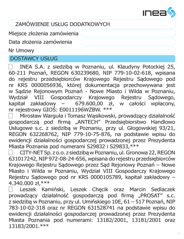 ZAMÓWIENIE USŁUG DODATKOWYCH Miejsce złożenia zamówienia Data złożenia zamówienia Nr Umowy DOSTAWCY USŁUG INEA S.A. z siedzibą w Poznaniu, ul. Klaudyny Potockiej 25, 60-211 Poznań, REGON 630239680, NIP 779-10-02-618, wpisana do rejestru przedsiębiorców Krajowego Rejestru Sądowego pod nr KRS 0000056936, której dokumentacja przechowywana jest w Sądzie Rejonowym Poznań - Nowe Miasto i Wilda w Poznaniu, Wydział VIII Gospodarczy Krajowego Rejestru Sądowego, kapitał zakładowy – 679.600,00 zł, w całości wpłacony, nr rejestrowy GIOŚ: E0011196WZBW. *** Mirosław Warguła i Tomasz Wąsikowski, prowadzący działalność gospodarczą pod firmą „ANTECH” Przedsiębiorstwo Handlowo Usługowe s.c. z siedzibą w Poznaniu, przy ul. Głogowskiej 93/21, REGON 632268762, NIP 779-10-75-876, na podstawie wpisu do ewidencji działalności gospodarczej prowadzonej przez Prezydenta Miasta Poznania pod numerami S29832 i S29833,*** CITY-NET Sp. z o.o. z siedzibą w Poznaniu, ul. Gronowa 22, REGON 631017242, NIP 972-08-24-656, wpisana do rejestru przedsiębiorców Krajowego Rejestru Sądowego przez Sąd Rejonowy Poznań – Nowe Miasto i Wilda w Poznaniu, Wydział VIII Gospodarczy Krajowego Rejestru Sądowego pod nr KRS 0000105789, kapitał zakładowy – 4.340.000 zł,*** Leszek Kamiński, Leszek Chęcik oraz Marcin Sedlaczek prowadzący działalność gospodarczą pod firmą „PROSAT” s.c. z siedzibą w Poznaniu, przy ul. Umińskiego 10E, 61 – 517 Poznań, NIP 783-10-02-318 oraz nr REGON 631528741 na podstawie wpisu do ewidencji działalności gospodarczej prowadzonej przez Prezydenta Miasta Poznania pod numerami: 13182/2001, 13181/2001 oraz 13183/2001.*** 1 Adres korespondencyjny INEA S.A.: Wysogotowo, ul. Wierzbowa 84, 62-081 Przeźmierowo Infolinia: 61 222 22 22, 63 222 22 22, 67 222 22 22, 68 422 22 22 reprezentowani przez Imię i nazwisko Przedstawiciela Dostawców usług ADRES ŚWIADCZENIA USŁUGI Kod pocztowy Miejscowość Ulica, numer domu, lokalu DANE OSOBOWE ABONENTA Imię Nazwisko Firma/Nazwa prowadzonej działalności* Nr PESEL Rodzaj dowodu tożsamości Seria i numer dowodu tożsamości Numer kontaktowy telefonu ** Numer kontaktowy telefonu komórkowego** Adres e-mail Numer NIP** Regon** DANE OSOBOWE REPREZENTANTA / PEŁNOMOCNIKA LUB PRZEDSTAWICIELA ABONENTA (wypełnić, jeżeli obowiązuje) Imię Nazwisko Nr PESEL DODATKOWY TERMINAL dotyczy/nie dotyczy* Zamawiam podłączenie dodatkowego Terminala abonenckiego w liczbie szt. Opłatę za podłączenie każdego dodatkowego Terminala abonenckiego zobowiązuję się wnieść wg obowiązującego Cennika. 2 Mac Mac Rezygnuję z dniem w liczbie szt. Mac Mac Mac Mac Mac z dodatkowego Terminala abonenckiego Mac Mac Mac Proszę o aktualizacją posiadanych przeze mnie Terminali abonenckich. Mac stary Mac stary Mac stary Mac stary Mac stary nowy nowy nowy nowy nowy *niepotrzebne skreślić **dane dobrowolne (nie dotyczy firm) ***właściwe zaznaczyć krzyżykiem ZAMÓWIENIE USŁUG DODATKOWYCH DLA USŁUG GŁOSOWYCH dotyczy/nie dotyczy* 1 – blokada połączeń międzynarodowych*** 2 – blokada połączeń międzynarodowych i 0 70x*** 3 – blokada połączeń komórkowych i 0 70x*** 4 – blokada połączeń międzynarodowych, komórkowych i 0 70x*** 5 – blokada połączeń międzystrefowych, komórkowych i 0 70x 5*** 6 – blokada połączeń międzynarodowych, międzystrefowych, komórkowych i 0 70x*** 7 – blokada poł. międzynarod., międzystref., komórkowych, strefowych, lokalnych i 0 70x*** 8 – blokada połączeń 0 70x*** 3 9 – blokada prezentacji własnego numeru*** 10 – prezentacja numeru*** 11 – natychmiastowe przekierowanie połączeń*** 12 - przekierowanie połączeń, gdy linia jest zajęta*** 13 - przekierowanie połączeń pod nieobecność*** 14 – poczta głosowa*** 15 – gorąca linia*** 16 – połączenie trójstronne*** 17 – wybieranie skrócone do 10 numerów*** 18 – nie przeszkadzać*** 19 – połączenie oczekujące*** 20 – budzenie jednokrotne*** 21 – budzenie wielokrotne/regularne*** 22 – blokada przekierowanych połączeń*** 23 – blokowanie połączeń przez Providera*** 24 – przyznanie złotego numeru telefonicznego*** 25 – przyznanie srebrnego numeru telefonicznego*** 26 – przyznanie brązowego numeru telefonicznego*** 27 – blokada połączeń wychodzących przez Abonenta*** 28 – Comiesięczna szczegółowa specyfikacja połączeń za jeden miesiąc, dla jednego Odbiornika Abonenta w postaci wydruku przesłanego pocztą wraz z rachunkiem*** 29 – Jednorazowa szczegółowa specyfikacja połączeń za jeden miesiąc, dla jednego Odbiornika Abonenta do odbioru w Biurze Obsługi Abonenta w postaci wydruku*** 30 – Jednorazowa szczegółowa specyfikacja połączeń za jeden miesiąc, dla jednego Odbiornika Abonenta przesłana na nośniku elektronicznym bądź w formie wydruku pocztą na wniosek Abonenta*** 4 ZAŁOŻENIE DODATKOWEGO GNIAZDA dotyczy/nie dotyczy* Zamawiam podłączenie dodatkowego Gniazda abonenckiego w liczbie szt. Opłatę za podłączenie każdego dodatkowego Gniazda zobowiązuję się wnieść wg obowiazującego Cennika. ZMIANA INSTALACJI W LOKALU dotyczy/nie dotyczy* Zamawiam zmianę rozprowadzenia instalacji sieci w Lokalu. Opłatę za zmianę instalacji zobowiązuje się wnieść wg obowiązującego Cennika. ZMIANA PRZYZNANEGO NUMERU DLA USŁUGI GŁOSOWEJ/ MOBILNEJ* dotyczy/nie dotyczy* Obecny numer Nowy numer ZMIANA KARTY SIM DLA NUMERU USŁUGI MOBILNEJ dotyczy/nie dotyczy* Zmiana karty sim dla numeru: Numer dotychczasowej karty SIM: Numer przydzielonej karty SIM: Uwagi: Podpis Przedstawiciela Dostawcy Usług Czytelny podpis Abonenta (pieczątka firmowa*) *niepotrzebne skreślić **dane dobrowolne (nie dotyczy firm). Przez podanie danych wyrażam zgodę na ich przetwarzanie przez Dostawcę usług w związku ze świadczoną Usługą. ***właściwe zaznaczyć krzyżykiem Infolinia: 61 222 22 22, www.inea.pl