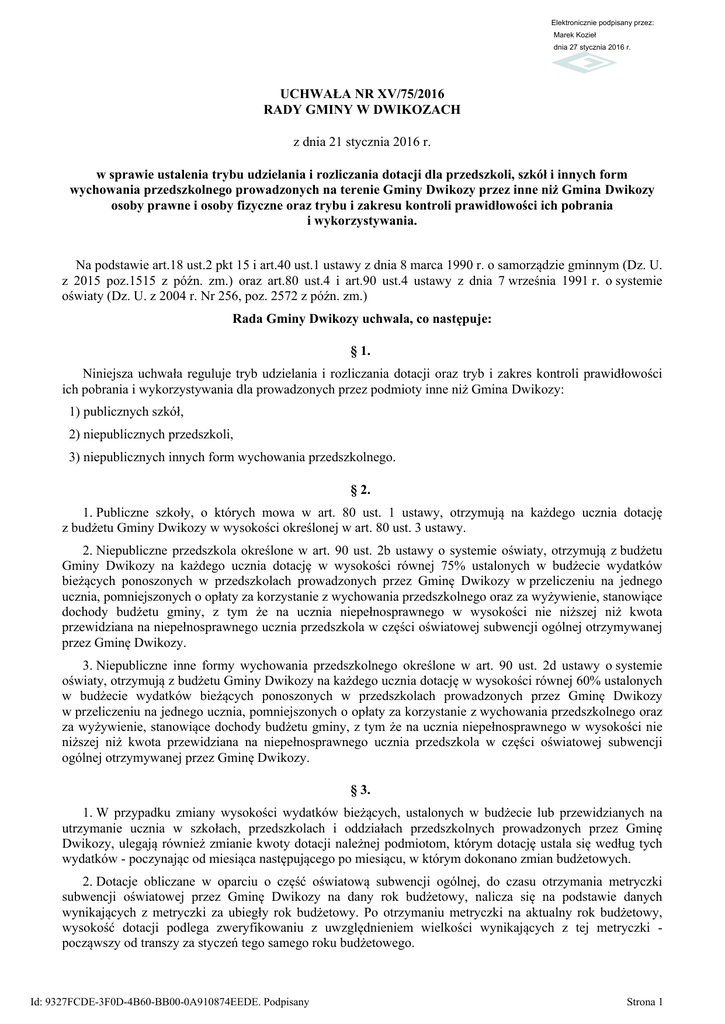 Elektronicznie podpisany przez: Marek Kozieł dnia 27 stycznia 2016 r. UCHWAŁA NR XV/75/2016 RADY GMINY W DWIKOZACH z dnia 21 stycznia 2016 r. w sprawie ustalenia trybu udzielania i rozliczania dotacji dla przedszkoli, szkół i innych form wychowania przedszkolnego prowadzonych na terenie Gminy Dwikozy przez inne niż Gmina Dwikozy osoby prawne i osoby fizyczne oraz trybu i zakresu kontroli prawidłowości ich pobrania i wykorzystywania. Na podstawie art.18 ust.2 pkt 15 i art.40 ust.1 ustawy z dnia 8 marca 1990 r. o samorządzie gminnym (Dz. U. z 2015 poz.1515 z późn. zm.) oraz art.80 ust.4 i art.90 ust.4 ustawy z dnia 7 września 1991 r. o systemie oświaty (Dz. U. z 2004 r. Nr 256, poz. 2572 z późn. zm.) Rada Gminy Dwikozy uchwala, co następuje: § 1. Niniejsza uchwała reguluje tryb udzielania i rozliczania dotacji oraz tryb i zakres kontroli prawidłowości ich pobrania i wykorzystywania dla prowadzonych przez podmioty inne niż Gmina Dwikozy: 1) publicznych szkół, 2) niepublicznych przedszkoli, 3) niepublicznych innych form wychowania przedszkolnego. § 2. 1. Publiczne szkoły, o których mowa w art. 80 ust. 1 ustawy, otrzymują na każdego ucznia dotację z budżetu Gminy Dwikozy w wysokości określonej w art. 80 ust. 3 ustawy. 2. Niepubliczne przedszkola określone w art. 90 ust. 2b ustawy o systemie oświaty, otrzymują z budżetu Gminy Dwikozy na każdego ucznia dotację w wysokości równej 75% ustalonych w budżecie wydatków bieżących ponoszonych w przedszkolach prowadzonych przez Gminę Dwikozy w przeliczeniu na jednego ucznia, pomniejszonych o opłaty za korzystanie z wychowania przedszkolnego oraz za wyżywienie, stanowiące dochody budżetu gminy, z tym że na ucznia niepełnosprawnego w wysokości nie niższej niż kwota przewidziana na niepełnosprawnego ucznia przedszkola w części oświatowej subwencji ogólnej otrzymywanej przez Gminę Dwikozy. 3. Niepubliczne inne formy wychowania przedszkolnego określone w art. 90 ust. 2d ustawy o systemie oświaty, otrzymują z budżetu Gminy Dwikozy na każdego ucznia dotację w wysokości równej 60% ustalonych w budżecie wydatków bieżących ponoszonych w przedszkolach prowadzonych przez Gminę Dwikozy w przeliczeniu na jednego ucznia, pomniejszonych o opłaty za korzystanie z wychowania przedszkolnego oraz za wyżywienie, stanowiące dochody budżetu gminy, z tym że na ucznia niepełnosprawnego w wysokości nie niższej niż kwota przewidziana na niepełnosprawnego ucznia przedszkola w części oświatowej subwencji ogólnej otrzymywanej przez Gminę Dwikozy. § 3. 1. W przypadku zmiany wysokości wydatków bieżących, ustalonych w budżecie lub przewidzianych na utrzymanie ucznia w szkołach, przedszkolach i oddziałach przedszkolnych prowadzonych przez Gminę Dwikozy, ulegają również zmianie kwoty dotacji należnej podmiotom, którym dotację ustala się według tych wydatków - poczynając od miesiąca następującego po miesiącu, w którym dokonano zmian budżetowych. 2. Dotacje obliczane w oparciu o część oświatową subwencji ogólnej, do czasu otrzymania metryczki subwencji oświatowej przez Gminę Dwikozy na dany rok budżetowy, nalicza się na podstawie danych wynikających z metryczki za ubiegły rok budżetowy. Po otrzymaniu metryczki na aktualny rok budżetowy, wysokość dotacji podlega zweryfikowaniu z uwzględnieniem wielkości wynikających z tej metryczki począwszy od transzy za styczeń tego samego roku budżetowego. Id: 9327FCDE-3F0D-4B60-BB00-0A910874EEDE. Podpisany Strona 1 § 4. 1. Osoba prowadząca placówkę oświatową, składa corocznie wniosek o udzielenie dotacji rocznej z planowaną liczbą uczniów złożony w terminie do dnia 30 września roku poprzedzającego rok udzielenia dotacji, służący zaplanowaniu dotacji w budżecie. Wzór wniosku określa załącznik nr 1 do niniejszej uchwały. 2. Osoba, o której mowa w ust. 1, zgłasza wszelkie zmiany danych zawartych we wniosku, w terminie 14 dni od dnia ich wystąpienia. 3. Dotacja nie podlega przekazaniu w sytuacji, gdy stracił aktualność wpis do ewidencji prowadzonej przez Gminę Dwikozy, na podstawie art. 82 ust. 1 ustawy lub wpis do rejestru wydanych zezwoleń na założenie publicznej szkoły, prowadzonego przez Gminę Dwikozy. § 5. Osoba prowadząca dotowane podmioty składa w terminie do 10 dnia każdego miesiąca w Urzędzie Gminy Dwikozy informację o faktycznej liczbie uczniów szkoły, przedszkola, oddziału przedszkolnego według stanu na pierwszy dzień danego miesiąca. Wzór informacji określa załącznik nr 2 do niniejszej uchwały. § 6. 1. Osoba prowadząca szkołę, przedszkole, oddział przedszkolny o których mowa w § 1, jest obowiązana przekazywać do Urzędu Gminy w Dwikozach pisemne rozliczenie przyznanej dotacji za okresy: 1) kwartalne - w terminie do 10 dnia, po zakończeniu każdego kwartału. 2) w przypadku gdy szkoła lub przedszkole kończy działalność, w terminie 30 dni po otrzymaniu ostatniej części dotacji. 2. Wzór rozliczenia dotacji stanowi załącznik nr 3 do niniejszej uchwały. 3. Organ dotujący ma prawo żądania wyjaśnień i dodatkowych informacji w zakresie złożonych rozliczeń oraz korekt tych rozliczeń. 4. Organ dotujący może przeprowadzać kontrole, o których mowa w art. 80 ust. 3e oraz art. 90 ust. 3e ustawy. Kontrole przeprowadzają przedstawiciele Gminy Dwikozy upoważnieni przez Wójta Gminy, na podstawie imiennego upoważnienia. 5. Z przeprowadzonej kontroli sporządza się protokół kontroli w dwóch jednobrzmiących egzemplarzach, który podpisują kontrolujący i przedstawiciele kontrolowanej jednostki. § 7. Wykonanie uchwały powierza się Wójtowi Gminy Dwikozy. § 8. Traci moc uchwała Nr XXVI/120/12 Rady Gminy Dwikozy z dnia 22 sierpnia 2012 roku w sprawie ustalenia trybu udzielania i rozliczania dotacji dla publicznych i niepublicznych jednostek oświatowych prowadzonych na terenie Gminy Dwikozy przez inne niż Gmina Dwikozy osoby prawne i os