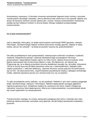 Rodzina katolicka - Transhumanizm wtorek, 20 października 2009 09:26 Amerykańscy naukowcy z Columbia Univeristy wyhodowali fragment kości żuchwy z komórek macierzystych dorosłego człowieka. Jest to pierwsza kość utworzona w ten sposób. Będzie ona służyć do leczenia zarówno chorób stawów jak i urazów. Sukces amerykańskich naukowców wydaje się być kolejnym krokiem w stronę świata, którego nadejście przepowiadają transhumaniści. Co to jest transhumanizm? Jest to ideologia, która głosi, że dzięki wykorzystaniu technologii GRIN (genetyki, robotyki, informatyki, nanotechnologii) będzie możliwe stworzenie nowego gatunku. Będzie to istota ludzka, ale już nie człowiek – tę istotę przyszłości nazywa się „postczłowiekiem”. Oto kilka przykładowych cech postczłowieka: nadzwyczajne zdolności umysłowe i szybkość myślenia, fotograficzna pamięć i zdolność błyskawicznego przyswajania informacji (przeczytanie i zapamiętanie książki zajmie mu kilka minut), idealna fizyczna budowa, którą będzie zachowywać bez konieczności dbania o ciało. Nie będzie tyć, ani starzeć się. Prognozuje się, że w dalsze przyszłości otrzyma dodatkowe narządy (np. skrzydła), dożywanie 150 lat w formie fizycznej 30-latka (docelowo mówi się o nieśmiertelności), telepatia (tylko między postludźmi ), zdolność telekinezy, zdolność leczenia urazów poprzez koncentrowanie się na nich, nie odczuwanie bólu, natychmiastowe pozyskiwanie wiedzy z jakiegoś centralnego źródła, zdolność obywania się bez snu (konieczność snu raz na tydzień). To tylko przykładowe cechy nadludzi, czy też postludzi. Niektóre z tych cech zostaną osiągnięte dzięki nanotechnologii, robotyce i informatyce. Niektóre będą jednak wymagać głębokich ingerencji genetycznych. Dodatkowo dojdzie do zacierania się różnic miedzy inteligencją naturalną i sztuczną, które będą łączone. Można już chyba powiedzieć, że postczłowiek stanie się nowym gatunkiem na naszej planecie. Transhumaniści uważają, że zmiany ewolucyjne postępują zbyt wolno. Człowiek sam więc pokieruje własną ewolucją i wyhoduje nowy gatunek, tak jak kiedyś wyhodował truskawkę z poziomki. 1/5 Rodzina katolicka - Transhumanizm wtorek, 20 października 2009 09:26 Kiedy możemy spodziewać się pierwszych nadludzi? Transhumaniści twierdzą, że już ok. 2030 roku. Wizjonerzy transhumanizmu Fryderyk Nietzsche ogłosił, że człowiek jest liną rozpiętą między zwierzęciem, a nadczłowiekiem. Mikołaj Fiodorow przewidywał, że rozwój technologii doprowadzi do likwidacji chorób, nieśmiertelności, a także pozwoli wskrzesić umarłych. W następnych latach doszło do wyraźnego falstartu w upowszechnianiu wizji nadczłowieka. Mimo braku dostatecznie rozwiniętej technologii podjęto próby stworzenia nadczłowieka germańskiego metodą tradycyjnej hodowli i tresury. Eksperyment skończył się katastrofą, podobnie jak próba stworzenia „nowego człowieka radzieckiego”. Dziś nowoczesna technologia GRIN rozwija się bardzo szybko. Mówi się, że wedle krzywej wykładniczej, a żadne kryzysy na rynkach kapitałowych tego rozwoju nie spowalniają. Entuzjaści transhumanizmu przedstawiają nam obraz świata, który niczym nie różni się od raju. Nieśmiertelność, zdrowie i nadnaturalne możliwości fizyczne oraz umysłowe dla wszystkich. Czy ludzkość mogła marzyć o lepszym losie? Spróbuję jednak sformułować zastrzeżenia wobec tej wizji raju na Ziemi. Zastrzeżenie pierwsze – zagrożenia związane z koniecznością współistnienia ludzi i nadludzi (postludzi) Praca nad technologią GRIN jest bardzo kosztowna. Pracują nad nią elitarne ośrodki naukowe oraz amerykańska agencja rządowa DARPA. Oznacza to, że zdobycze post- (czy też trans-) humanizmu będą wyłącznie na użytek bogatych, który zechcą zwiększyć szanse swoich dzieci oraz wojska. 2/5 Rodzina katolicka - Transhumanizm wtorek, 20 października 2009 09:26 Dotąd żyliśmy w świecie, w którym panowały nierówności związane ze statusem majątkowym rodziców. Osoby lepiej urodzone kończyły lepsze studia, z których już wynosiły znajomości przydatne w dalszej karierze, a znajomości te sumowały się z poparciem rodziny i zapleczem kapitałowym. Osoby źle urodzone były skazane na wegetację (w USA połączoną przeważnie z monstrualną otyłością). Jednak uzdolnieni ludzie urodzeni poza rządzącą kastą mogli ten system obejść. Ominąć korporacyjne ścieżki kariery zakładając własną firmę, odnieść sukces artystyczny, naukowy, polityczny. Zgodnie z wizjami transhumanistów ok. 2030 roku nie będzie już klas społecznych, między którymi możliwy jest przepływ. Będą dwa różne gatunki. Między nadludźmi dysponującymi miażdżącą przewagą kapitałową i genetyczną, a ludźmi wytworzy się gatunkowa przepaść. Możliwość wymiany elit skończy się raz na zawsze. Entuzjaści transhumanizmu twierdzą, że raj jest przygotowany dla wszystkich. Doświadczenie życiowe podpowiada jednak, że nie znajdą się źródła finansowania tego raju. Już obecnie dobór metod leczenia zależy od stanu majątkowego pacjenta. Dlaczego udostępnianie astronomicznie drogiej technologii GRIN miałoby się odbyć za darmo? Skąd wzięłyby się na to środki? Jak więc nadludzie obejdą się z ludźmi? Już słychać narzekania na przeludnienie planety, na zużywanie zasobów naturalnych przez mnożących się ludzi. Mówi się o konieczności kontroli urodzeń, o eutanazji. Dzieje się to w ramach jednego gatunku, objętego solidarnością gatunkową. Postludzie mogą już tej solidarności nie czuć. Nacisk na ograniczanie populacji „przestarzałych ludzi” może wzrosnąć. Transhumanizm jest sprzeczny z nauczaniem uniwersalistycznych religii Religie, takie jak chrześcijaństwo czy buddyzm i hinduizm, nawołują do poszukiwania prawdziwej natury człowieka. Natura ta