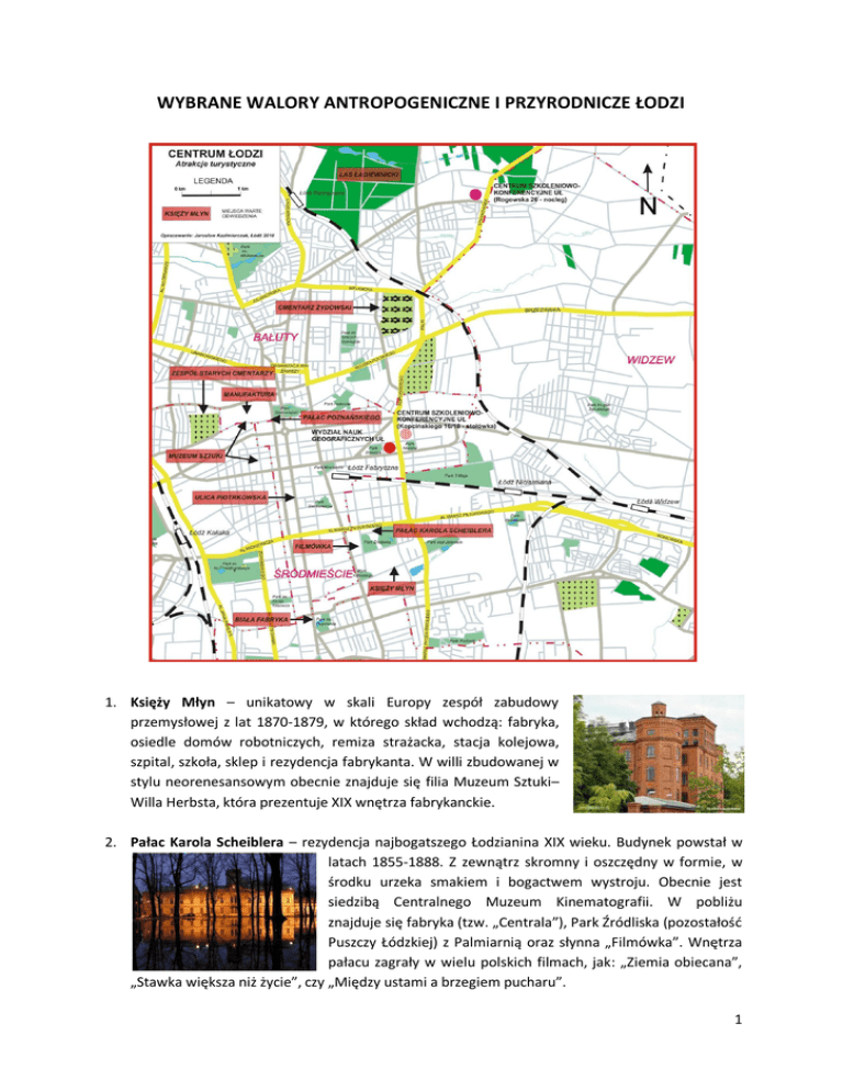 WYBRANE WALORY ANTROPOGENICZNE I PRZYRODNICZE ŁODZI 1. Księży Młyn – unikatowy w skali Europy zespół zabudowy przemysłowej z lat 1870-1879, w którego skład wchodzą: fabryka, osiedle domów robotniczych, remiza strażacka, stacja kolejowa, szpital, szkoła, sklep i rezydencja fabrykanta. W willi zbudowanej w stylu neorenesansowym obecnie znajduje się filia Muzeum Sztuki– Willa Herbsta, która prezentuje XIX wnętrza fabrykanckie. 2. Pałac Karola Scheiblera – rezydencja najbogatszego Łodzianina XIX wieku. Budynek powstał w latach 1855-1888. Z zewnątrz skromny i oszczędny w formie, w środku urzeka smakiem i bogactwem wystroju. Obecnie jest siedzibą Centralnego Muzeum Kinematografii. W pobliżu znajduje się fabryka (tzw. „Centrala”), Park Źródliska (pozostałośd Puszczy Łódzkiej) z Palmiarnią oraz słynna „Filmówka”. Wnętrza pałacu zagrały w wielu polskich filmach, jak: „Ziemia obiecana”, „Stawka większa niż życie”, czy „Między ustami a brzegiem pucharu”. 1 3. Pałac Poznaoskiego – największy i najpiękniejszy pałac fabrykancki zwany „łódzkim Luwrem”. Eklektyczna budowla powstała na zamówienie żydowskiej rodziny Poznaoskich – drugiej najbogatszej familii miasta w XIX wieku. Obecnie w pałacu, który sąsiaduje z „Manufakturą”, mieści się Muzeum Miasta Łodzi. 4. Centrum Manufaktura – dawny kompleks przemysłowy Izraela Poznaoskiego, którego początek sięga lat 70-tych XIX wieku. Fabryka zatrudniała ponad 6 tysięcy osób i produkowała tkaniny bawełniane. Obecnie mieści się tu jedno z największych centrów handlowo-rozrywkowych w Polsce, które w znakomity sposób łączy zabytkową zabudowę fabryczną z nowoczesnymi funkcjami. Oprócz sklepów, znajdują się tu m. in. puby, restauracje, dyskoteka, muzea, kino i wiele innych atrakcji. 5. Muzeum Sztuki – założone w 1930 roku, jedno z najstarszych muzeów sztuki nowoczesnej na świecie. Przedstawia historię polskiej i zagranicznej sztuki awangardowej. Główna siedziba muzeum znajduje się w pałacu Maurycego Poznaoskiego. Nowo otwarta filia - „ms²”, ma siedzibę w dawnej tkalni w dzisiejszej Manufakturze. 6. „Biała Fabryka” Ludwika Geyera – pierwsza zmechanizowana fabryka w Łodzi, w której w 1839 roku zamontowano silnik parowy o mocy ok. 60 KM. Wybudowana w stylu późnego klasycyzmu, tynkowana na biało (stąd nazwa). Obecnie mieści siedzibę Centralnego Muzeum Włókiennictwa. W wnętrzu oprócz zabytkowych maszyn tkackich i przędzalniczych można podziwiad unikalną wystawę tkaniny artystycznej. „Biała Fabryka” sąsiaduje ze Skansenem Łódzkiej Architektury Drewnianej. 7. Zespół Starych Cmentarzy – zabytkowa nekropolia powstała w latach 50tych XIX stulecia, obecnie przy ulicach Ogrodowej i Srebrzyoskiej, niedaleko Manufaktury. Nekropolia ma charakter ekumeniczny i nawiązuje do wielokulturowej tradycji miasta, gdyż na cmentarzu są pochowani wierni trzech wyznao: katolicy, ewangelicy i prawosławni. Znajduje się tu wspaniała, neogotycka kaplica rodziny Scheiblerów. 8. Cmentarz Żydowski – należy do największych nekropolii żydowskich w Europie, zajmuje ponad 40 ha powierzchni, położony przy ulicy Brackiej. Na cmentarzu, który powstał pod koniec XIX wieku znajdują się grobowce rodzinne największych, żydowskich rodów fabrykanckich w Łodzi, w tym mauzoleum rodziny Poznaoskich. Znajduje się tu także tzw. „Pole Gettowe”, gdzie pochowane są ofiary łódzkiego getta z 2 czasów II wojny światowej. W pobliżu cmentarza, przy alei Pamięci Ofiar Litzmannstadt Getto, znajduje się pomnik Radegast, upamiętniający martyrologię Żydów z Polski i Europy. 9. Ulica Piotrkowska – pierwotnie handlowy trakt między Łęczycą a Piotrkowem. W XIX wieku stanowił oś rozwoju przestrzennego miasta i stał się najbardziej reprezentacyjną ulicą Łodzi. Ulica Piotrkowska liczy ponad 4 kilometry długości między Placem Wolności na północy a Placem Niepodległości na południu. Obecnie na jej terenie, znajdują się m. in.: Łódzka Aleja Gwiazd, pomniki słynnych łodzian, nietypowy „leżący” Pomnik Łodzian Przełomu Tysiąclecia, wspaniałe, bogato zdobione kamienice wielkomiejskie i oczywiście mnóstwo tętniących życiem barów, pubów, restauracji i dyskotek. 10. „Filmówka” – Paostwowa Wyższa Szkoła Filmowa, Telewizyjna i Teatralna im. Leona Schillera. Powstała w 1948 roku. Uczelnia mieści się m. in. w dawnej willi Oskara Kona. Obecnie studenci mają możliwośd kształcenia się na 4 wydziałach: Aktorskim, Reżyserskim, Operatorskim i Realizacji TV oraz Produkcji Filmowej i Telewizyjnej. Absolwentami „Filmówki: są m.in.: Andrzej Wajda, Roman Polaoski, Andrzej Munk, Jerzy Skolimowski, Krzysztof Zanussi, Krzysztof Kieślowski. 11. Las Łagiewnicki – mimo iż Łódź uważana jest za miasto fabryczne, znajduje się tu całkiem sporo zieleni. Oprócz ponad 30 parków, w granicach miasta znajduje się największy w Polsce las miejski – Las Łagiewnicki. Zajmuje obszar około 1200 ha i jest częścią Parku Krajobrazowego Wzniesieo Łódzkich. Na jego terenie znajdują się m. in. szlaki turystyczne, kąpielisko, ośrodki wczasowe, klub jeździecki i barokowy zespół klasztorny franciszkanów. 12. Wydarzenia kulturalne. Do najważniejszych, cyklicznych imprez kulturalnych, które odbywają się w Łodzi, należy zaliczyd m.in.: Festiwal Muzyki Filmowej, Festiwal Mediów „Człowiek w zagrożeniu”, Grand Prix Stowarzyszenia Jazzowego „Melomani”, Łódzkie Spotkania Baletowe, Międzynarodowy Festiwal Szkół Filmowych, Ogólnopolski Festiwal Sztuk Przyjemnych i Nieprzyjemnych, Festiwal Gór, Sportów Ekstremalnych i Podróży – Explorers Festival, Ogólnopolski Studencki Festiwal Piosenki Turystycznej - Yapa, Międzynarodowe Triennale Tkaniny, Międzynarodowy Festiwal Komiksu. ZAPRASZAMY DO ŁODZI!!! 3