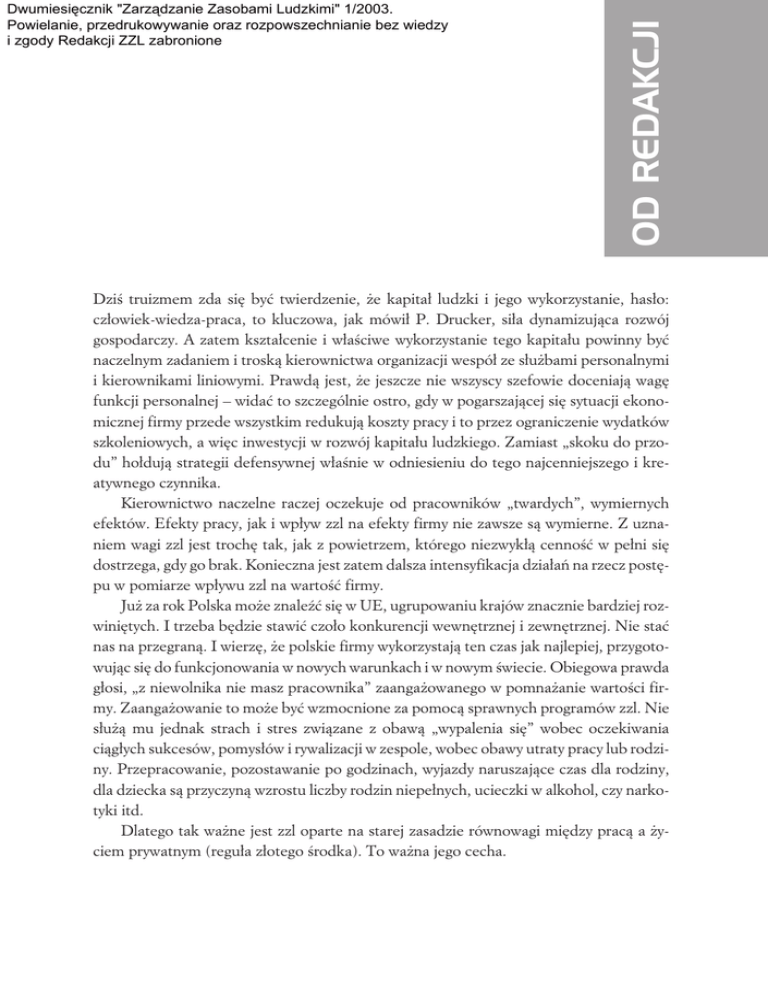 OD REDAKCJI Dwumiesięcznik "Zarządzanie Zasobami Ludzkimi" 1/2003. Powielanie, przedrukowywanie oraz rozpowszechnianie bez wiedzy i zgody Redakcji ZZL zabronione Dzi truizmem zda siê byæ twierdzenie, ¿e kapita³ ludzki i jego wykorzystanie, has³o: cz³owiek-wiedza-praca, to kluczowa, jak mówi³ P. Drucker, si³a dynamizuj¹ca rozwój gospodarczy. A zatem kszta³cenie i w³aciwe wykorzystanie tego kapita³u powinny byæ naczelnym zadaniem i trosk¹ kierownictwa organizacji wespó³ ze s³u¿bami personalnymi i kierownikami liniowymi. Prawd¹ jest, ¿e jeszcze nie wszyscy szefowie doceniaj¹ wagê funkcji personalnej widaæ to szczególnie ostro, gdy w pogarszaj¹cej siê sytuacji ekonomicznej firmy przede wszystkim redukuj¹ koszty pracy i to przez ograniczenie wydatków szkoleniowych, a wiêc inwestycji w rozwój kapita³u ludzkiego. Zamiast skoku do przodu ho³duj¹ strategii defensywnej w³anie w odniesieniu do tego najcenniejszego i kreatywnego czynnika. Od Redakcji Kierownictwo naczelne raczej oczekuje od pracowników twardych, wymiernych efektów. Efekty pracy, jak i wp³yw zzl na efekty firmy nie zawsze s¹ wymierne. Z uznaniem wagi zzl jest trochê tak, jak z powietrzem, którego niezwyk³¹ cennoæ w pe³ni siê dostrzega, gdy go brak. Konieczna jest zatem dalsza intensyfikacja dzia³añ na rzecz postêpu w pomiarze wp³ywu zzl na wartoæ firmy. Ju¿ za rok Polska mo¿e znaleæ siê w UE, ugrupowaniu krajów znacznie bardziej rozwiniêtych. I trzeba bêdzie stawiæ czo³o konkurencji wewnêtrznej i zewnêtrznej. Nie staæ nas na przegran¹. I wierzê, ¿e polskie firmy wykorzystaj¹ ten czas jak najlepiej, przygotowuj¹c siê do funkcjonowania w nowych warunkach i w nowym wiecie. Obiegowa prawda g³osi, z niewolnika nie masz pracownika zaanga¿owanego w pomna¿anie wartoci firmy. Zaanga¿owanie to mo¿e byæ wzmocnione za pomoc¹ sprawnych programów zzl. Nie s³u¿¹ mu jednak strach i stres zwi¹zane z obaw¹ wypalenia siê wobec oczekiwania ci¹g³ych sukcesów, pomys³ów i rywalizacji w zespole, wobec obawy utraty pracy lub rodziny. Przepracowanie, pozostawanie po godzinach, wyjazdy naruszaj¹ce czas dla rodziny, dla dziecka s¹ przyczyn¹ wzrostu liczby rodzin niepe³nych, ucieczki w alkohol, czy narkotyki itd. Dlatego tak wa¿ne jest zzl oparte na starej zasadzie równowagi miêdzy prac¹ a ¿yciem prywatnym (regu³a z³otego rodka). To wa¿na jego cecha. 8 Od Redakcji Nowe, trudne wyzwania ka¿¹ spojrzeæ inaczej na ca³okszta³t relacji miêdzy kierownictwem, pracownikami i zwi¹zkami zawodowymi, czyli na zbiorowe stosunki pracy. W przygotowaniu s¹ nowe regulacje prawne tych stosunków. W bie¿¹cym roku nasz dwumiesiêcznik bêdzie podejmowa³ zasygnalizowane kwestie i inne wa¿ne w perspektywie integracji zarz¹dzanie miêdzynarodowe. Czêæ numerów bêdzie mia³a tradycyjnie charakter niejako monograficzny, grupuj¹c artyku³y i komunikaty wokó³ jednego, wielkiego problemu. Ju¿ obecny numer podejmuje problem wielkiej wagi zarz¹dzanie w gospodarce opartej na wiedzy. Jednoczenie redakcja wprowadza kilka nowych rozwi¹zañ, które mamy nadziejê zyskaj¹ Pañstwa aprobatê. Na stronie internetowej naszego dwumiesiêcznika [www.ipiss.com.pl/zzl] chcemy uruchomiæ dzia³ Pytañ i odpowiedzi. Czytelnicy bêd¹ mogli kierowaæ do nas pytania zwi¹zane z obszarem zzl, a tak¿e do autorów opracowañ publikowanych na naszych ³amach. Uwa¿amy, ¿e taka interakcja Czytelników i autorów oraz redakcji bêdzie bardzo u¿yteczna i pomo¿e nam na lepsze wyprofilowanie pisma. Jednoczenie redakcja og³asza konkurs na najciekawsze studia przypadków i opisy w³asnych dowiadczeñ zwi¹zanych z wdra¿aniem projektów w obszarze zzl. Warunki konkursu zostan¹ opublikowane w nastêpnym numerze. Do tegorocznych nowoci nale¿y te¿ wprowadzenie do naszego periodyku s³ownika terminologicznego. Rzecz w tym, ¿e istnieje spory zamêt terminologiczny w pimiennictwie w zakresie zzl (i nie tylko)zwi¹zany z ³atwoci¹ publikowania wiedzy fragmentarycznej, nie pog³êbionej i nie uporz¹dkowanej. Z drugiej strony istnieje sta³y nap³yw terminologii anglojêzycznej dowolnie t³umaczonej, czasem wrêcz dos³ownie. Dobre rozumienie terminologii w warunkach postêpuj¹cej globalizacji i integracji z UE oraz rozwojem zarz¹dzania miêdzynarodowego jest niezbêdne i wa¿ne. ¯ywiê nadziejê, ¿e wprowadzone zmiany spotkaj¹ siê z dobrym przyjêciem przez Czytelników i bêd¹ pomocne w codziennych staraniach zwi¹zanych z rozwojem zzl w teorii i praktyce. Stanis³awa Borkowska
