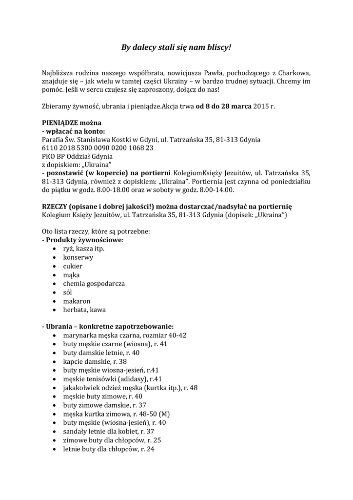 By dalecy stali się nam bliscy! Najbliższa rodzina naszego współbrata, nowicjusza Pawła, pochodzącego z Charkowa, znajduje się – jak wielu w tamtej części Ukrainy – w bardzo trudnej sytuacji. Chcemy im pomóc. Jeśli w sercu czujesz się zaproszony, dołącz do nas! Zbieramy żywność, ubrania i pieniądze.Akcja trwa od 8 do 28 marca 2015 r. PIENIĄDZE można wpłacać na konto: Parafia Św. Stanisława Kostki w Gdyni, ul. Tatrzańska 35, 81‐313 Gdynia 6110 2018 5300 0090 0200 1068 23 PKO BP Oddział Gdynia z dopiskiem: „Ukraina” pozostawić (w kopercie) na portierni KolegiumKsięży Jezuitów, ul. Tatrzańska 35, 81‐313 Gdynia, również z dopiskiem: „Ukraina”. Portiernia jest czynna od poniedziałku do piątku w godz. 8.00‐18.00 oraz w soboty w godz. 8.00‐14.00. RZECZY (opisane i dobrej jakości!) można dostarczać/nadsyłać na portiernię Kolegium Księży Jezuitów, ul. Tatrzańska 35, 81‐313 Gdynia (dopisek: „Ukraina”) Oto lista rzeczy, które są potrzebne: Produkty żywnościowe: • ryż, kasza itp. • konserwy • cukier • mąka • chemia gospodarcza • sól • makaron • herbata, kawa Ubrania – konkretne zapotrzebowanie: • marynarka męska czarna, rozmiar 40‐42 • buty męskie czarne (wiosna), r. 41 • buty damskie letnie, r. 40 • kapcie damskie, r. 38 • buty męskie wiosna‐jesień, r.41 • męskie tenisówki (adidasy), r.41 • jakakolwiek odzież męska (kurtka itp.), r. 48 • męskie buty zimowe, r. 40 • buty zimowe damskie, r. 37 • męska kurtka zimowa, r. 48‐50 (M) • buty męskie (wiosna‐jesień), r. 40 • sandały letnie dla kobiet, r. 37 • zimowe buty dla chłopców, r. 25 • letnie buty dla chłopców, r. 24 • • • • • • • • • • • • • • • • • • • buty dla dziewczyny (letnie) r. 34‐35; buty dla dziewczyny (wiosna‐jesień), r. 34‐35; jakakolwiek odzież ‐ dziewczyna 9 lat, wzrost 140 cm buty damskie (wiosna‐jesień), r. 37 kurtka dla chłopca (wiosna‐jesień), wzrost 110 cm jakakolwiek odzież dla dziewczyny 16 lat, wzrost 166 cm jakakolwiek odzież dla dziewczyny 17 lat, wzrost 173 cm jakakolwiek odzież dla chłopca 3 lata, wzrost 130 cm jakiekolwiek obuwie dla chłopca 3 lata, wzrost 130 cm jakakolwiek odzież dla chłopca 2 lata, wzrost 100 cm jakiekolwiek obuwie dla chłopca 2 lata, wzrost 100 cm zimowy sweter damski, r. 48 dżinsy męskie, r. 48‐49 trampki (adidasy) męskie, r. 43‐44 męskie buty (wiosna‐jesień), r. 44 damskie buty (wiosna‐jesień), r. 41 damskie obuwie (wiosna‐lato), r. 38, jeśli możliwe szerokie i miękkie (dla starszej pani) dla chłopca: jakakolwiek odzież, wzrost 120 cm, jakiekolwiek obuwie, r. 26 dla dziewczyny: jakakolwiek odzież, wzrost 135‐140 cm, jakiekolwiek obuwie, r. 34 Za wszelką pomoc i wsparcie serdecznie dziękujemy!