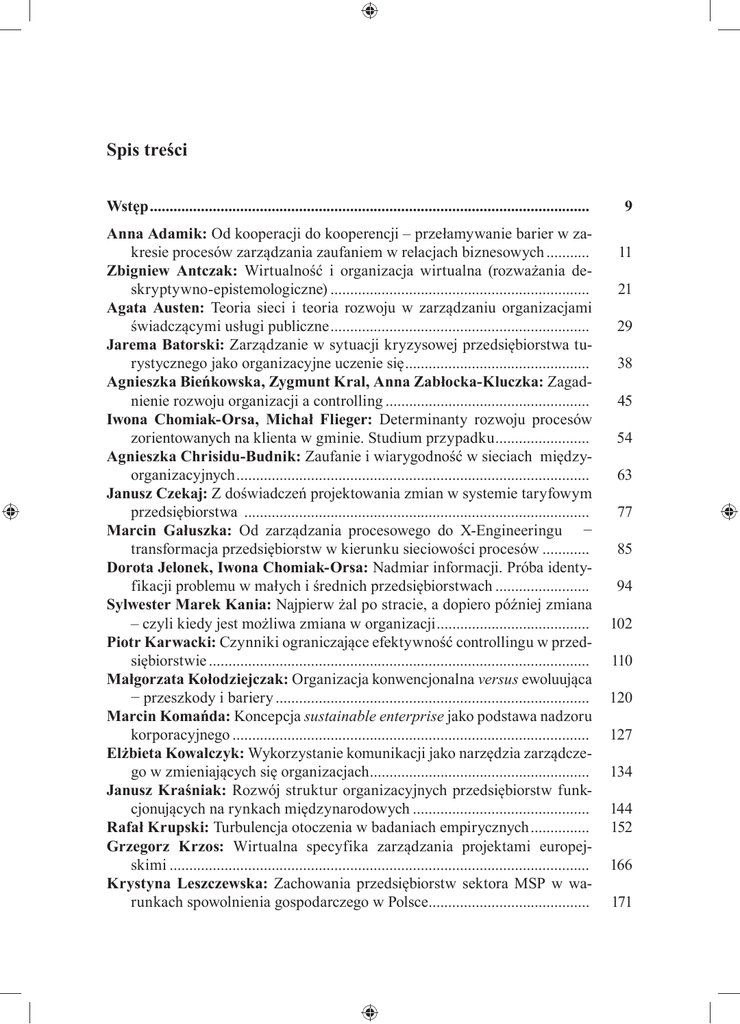 Spis treści Wstęp ................................................................................................................ Anna Adamik: Od kooperacji do kooperencji – przełamywanie barier w zakresie procesów zarządzania zaufaniem w relacjach biznesowych ........... Zbigniew Antczak: Wirtualność i organizacja wirtualna (rozważania deskryptywno-epistemologiczne) .................................................................. Agata Austen: Teoria sieci i teoria rozwoju w zarządzaniu organizacjami świadczącymi usługi publiczne .................................................................. Jarema Batorski: Zarządzanie w sytuacji kryzysowej przedsiębiorstwa turystycznego jako organizacyjne uczenie się ............................................... Agnieszka Bieńkowska, Zygmunt Kral, Anna Zabłocka-Kluczka: Zagadnienie rozwoju organizacji a controlling .................................................... Iwona Chomiak-Orsa, Michał Flieger: Determinanty rozwoju procesów zorientowanych na klienta w gminie. Studium przypadku ........................ Agnieszka Chrisidu-Budnik: Zaufanie i wiarygodność w sieciach międzyorganizacyjnych .......................................................................................... Janusz Czekaj: Z doświadczeń projektowania zmian w systemie taryfowym przedsiębiorstwa ........................................................................................ Marcin Gałuszka: Od zarządzania procesowego do X-Engineeringu − transformacja przedsiębiorstw w kierunku sieciowości procesów ............ Dorota Jelonek, Iwona Chomiak-Orsa: Nadmiar informacji. Próba identyfikacji problemu w małych i średnich przedsiębiorstwach ........................ Sylwester Marek Kania: Najpierw żal po stracie, a dopiero później zmiana – czyli kiedy jest możliwa zmiana w organizacji ....................................... Piotr Karwacki: Czynniki ograniczające efektywność controllingu w przedsiębiorstwie ................................................................................................. Małgorzata Kołodziejczak: Organizacja konwencjonalna versus ewoluująca − przeszkody i bariery ................................................................................ Marcin Komańda: Koncepcja sustainable enterprise jako podstawa nadzoru korporacyjnego ........................................................................................... Elżbieta Kowalczyk: Wykorzystanie komunikacji jako narzędzia zarządczego w zmieniających się organizacjach ........................................................ Janusz Kraśniak: Rozwój struktur organizacyjnych przedsiębiorstw funkcjonujących na rynkach międzynarodowych ............................................. Rafał Krupski: Turbulencja otoczenia w badaniach empirycznych ............... Grzegorz Krzos: Wirtualna specyfika zarządzania projektami europejskimi ........................................................................................................... Krystyna Leszczewska: Zachowania przedsiębiorstw sektora MSP w warunkach spowolnienia gospodarczego w Polsce......................................... 9 11 21 29 38 45 54 63 77 85 94 102 110 120 127 134 144 152 166 171 6 Spis treści Tomasz Małkus: Kierunki usprawniania współpracy w outsourcingu personalnym ........................................................................................................ Bogdan Nogalski, Sebastian Klisz: Ewolucja i kierunki restrukturyzacji modelu zarządzania państwowymi zasobami leśnymi o charakterze narodowym ..................................................................................................... Jacek Obrzud, Dariusz Sala: Kierunki zmian inteligentnych systemów wytwórczych .................................................................................................... Katarzyna Piwowar-Sulej: Problemy społeczne jako czynnik ryzyka w organizacji „zarządzanej przez projekty” ...................................................... Alicja Smolbik-Jęczmień: Nowy sposób myślenia o karierze zawodowej warunkiem sukcesu ......................................................................................... Janina Stankiewicz: Zespoły jako ważny element organizacji sprzyjający jej rozwojowi ................................................................................................... Katarzyna Szelągowska-Rudzka: Partycypacja pracowników jako sposób minimalizowania oporu ludzi przed zmianami organizacyjnymi – komunikat z badań ............................................................................................... Anna Wójcik-Karpacz: Międzyorganizacyjny efekt synergiczny jako kryterium oceny układu outsourcingowego........................................................ Joanna Żukowska: Kształtowanie potencjału rozwojowego pracowników przedsiębiorstw ........................................................................................... 178 186 200 210 219 228 237 246 255 Summaries Anna Adamik: From cooperation to coopetition – breaking the barriers in the processes of trust in business relationships management..................... Zbigniew Antczak: Virtuality and virtual organization (descriptive-epistemological consideration) ............................................................................. Agata Austen: Theory of networks and theory of growth in the management of public service organizations ................................................................... Jarema Batorski: Management in crisis of a tourist enterprise as organizational learning ............................................................................................. Agnieszka Bieńkowska, Zygmunt Kral, Anna Zabłocka-Kluczka: The issue of organization development and controlling .................................... Iwona Chomiak-Orsa, Michał Flieger: Determinants of client oriented processes in local governm