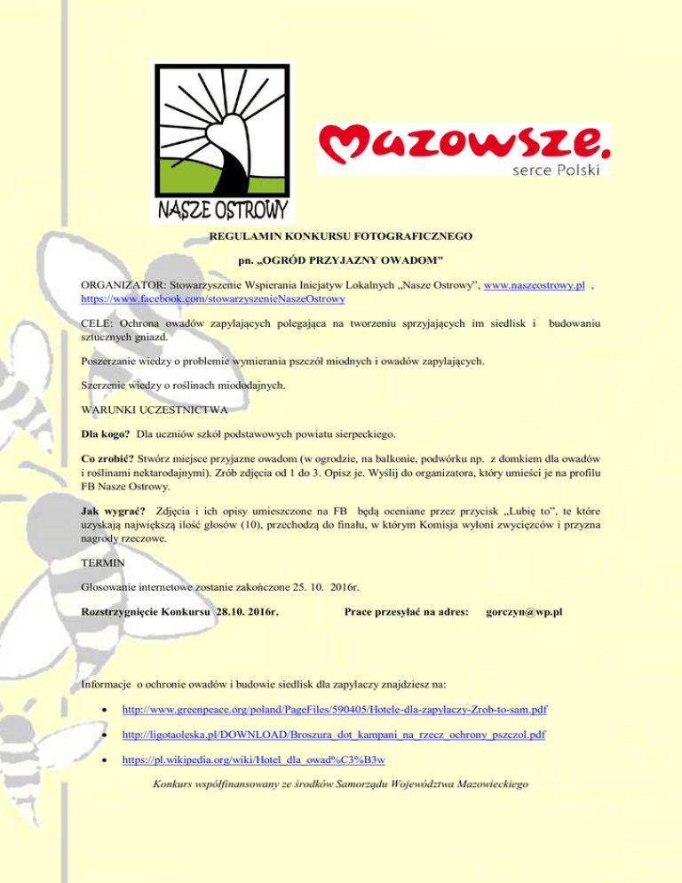 REGULAMIN KONKURSU FOTOGRAFICZNEGO pn. „OGRÓD PRZYJAZNY OWADOM” ORGANIZATOR: Stowarzyszenie Wspierania Inicjatyw Lokalnych „Nasze Ostrowy”, www.naszeostrowy.pl , https://www.facebook.com/stowarzyszenieNaszeOstrowy CELE: Ochrona owadów zapylających polegająca na tworzeniu sprzyjających im siedlisk i sztucznych gniazd. budowaniu Poszerzanie wiedzy o problemie wymierania pszczół miodnych i owadów zapylających. Szerzenie wiedzy o roślinach miododajnych. WARUNKI UCZESTNICTWA Dla kogo? Dla uczniów szkół podstawowych powiatu sierpeckiego. Co zrobić? Stwórz miejsce przyjazne owadom (w ogrodzie, na balkonie, podwórku np. z domkiem dla owadów i roślinami nektarodajnymi). Zrób zdjęcia od 1 do 3. Opisz je. Wyślij do organizatora, który umieści je na profilu FB Nasze Ostrowy. Jak wygrać? Zdjęcia i ich opisy umieszczone na FB będą oceniane przez przycisk „Lubię to”, te które uzyskają największą ilość głosów (10), przechodzą do finału, w którym Komisja wyłoni zwycięzców i przyzna nagrody rzeczowe. TERMIN Głosowanie internetowe zostanie zakończone 25. 10. 2016r. Rozstrzygnięcie Konkursu 28.10. 2016r. Prace przesyłać na adres: [email protected] Informacje o ochronie owadów i budowie siedlisk dla zapylaczy znajdziesz na: http://www.greenpeace.org/poland/PageFiles/590405/Hotele-dla-zapylaczy-Zrob-to-sam.pdf http://ligotaoleska.pl/DOWNLOAD/Broszura_dot_kampani_na_rzecz_ochrony_pszczol.pdf https://pl.wikipedia.org/wiki/Hotel_dla_owad%C3%B3w Konkurs współfinansowany ze środków Samorządu Województwa Mazowieckiego