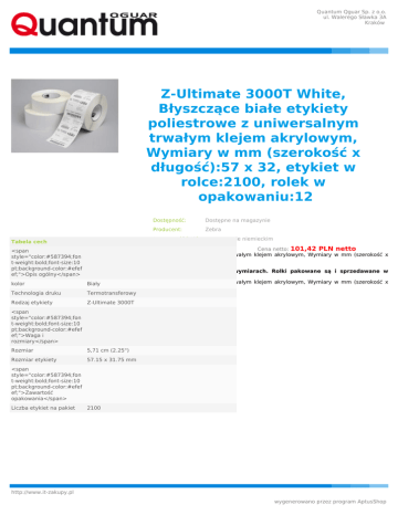 Quantum Qguar Sp. z o.o. ul. Walerego Sławka 3A Kraków Z-Ultimate 3000T White, Błyszczące białe etykiety poliestrowe z uniwersalnym trwałym klejem akrylowym, Wymiary w mm (szerokość x długość):57 x 32, etykiet w rolce:2100, rolek w opakowaniu:12 Dostępność: Dostępne na magazynie Producent: Zebra Dostępność [M2]: w magazynie niemieckim Tabela cech Cena netto: 101,42 PLN netto <span Z-Ultimate 3000T White, Błyszczące białe etykiety poliestrowe z uniwersalnym trwałym klejem akrylowym, Wymiary w mm (szerokość x style="color:#587394;fon długość):57 x 32, etykiet w rolce:2100, rolek w opakowaniu:12 t-weight:bold;font-size:10 PN: 880249-031D pt;background-color:#efef Uwaga - podana cena dotyczy jednej rolki etykiet o podanych wyżej wymiarach. Rolki pakowane są i sprzedawane w ef;">Opis ogólny</span> opakowaniach zbiorczych po 12 sztuk. Z-Ultimate 3000T White, Błyszczące białe etykiety poliestrowe z uniwersalnym trwałym klejem akrylowym, Wymiary w mm (szerokość x kolor Biały długość):57 x 32, etykiet w rolce:2100, rolek w opakowaniu:12 PN: 880249-031D Technologia druku Termotransferowy Rodzaj etykiety Z-Ultimate 3000T <span style="color:#587394;fon t-weight:bold;font-size:10 pt;background-color:#efef ef;">Waga i rozmiary</span> Rozmiar 5,71 cm (2.25") Rozmiar etykiety 57.15 x 31.75 mm <span style="color:#587394;fon t-weight:bold;font-size:10 pt;background-color:#efef ef;">Zawartość opakowania</span> Liczba etykiet na pakiet 2100 http://www.it-zakupy.pl wygenerowano przez program AptusShop
