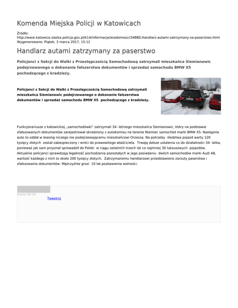 Komenda Miejska Policji w Katowicach Źródło: http://www.katowice.slaska.policja.gov.pl/k14/informacje/wiadomosci/34880,Handlarz-autami-zatrzymany-za-paserstwo.html Wygenerowano: Piątek, 3 marca 2017, 15:12 Handlarz autami zatrzymany za paserstwo Policjanci z Sekcji do Walki z Przestępczością Samochodową zatrzymali mieszkańca Siemianowic podejrzewanego o dokonanie fałszerstwa dokumentów i sprzedaż samochodu BMW X5 pochodzącego z kradzieży. Policjanci z Sekcji do Walki z Przestępczością Samochodową zatrzymali mieszkańca Siemianowic podejrzewanego o dokonanie fałszerstwa dokumentów i sprzedaż samochodu BMW X5 pochodzącego z kradzieży. Funkcjonariusze z katowickiej „samochodówki” zatrzymali 34- letniego mieszkańca Siemianowic, który na podstawie sfałszowanych dokumentów zarejestrował skradziony z autokomisu na terenie Niemiec samochód marki BMW X5. Następnie auto to oddał w leasing niczego nie podejrzewającemu mieszkańcowi Orzesza. Na potrzeby śledztwa pojazd warty 120 tysięcy złotych został zabezpieczony i wróci do prawowitego właściciela. Trwają dalsze ustalenia co do działalności 34- latka, ponieważ jak sam przyznał sprowadził do Polski w ciągu ostatnich trzech lat co najmniej 30 luksusowych pojazdów. Aktualnie policjanci sprawdzają legalność pochodzenia pozostałych w jego posiadaniu dwóch samochodów marki Audi A8, wartość każdego z nich to około 200 tysięcy złotych. Zatrzymanemu handlarzowi przedstawiono zarzuty paserstwa i sfałszowania dokumentów. Mężczyźnie grozi 10 lat pozbawienia wolności. Ocena: 0/5 (0) Tweetnij