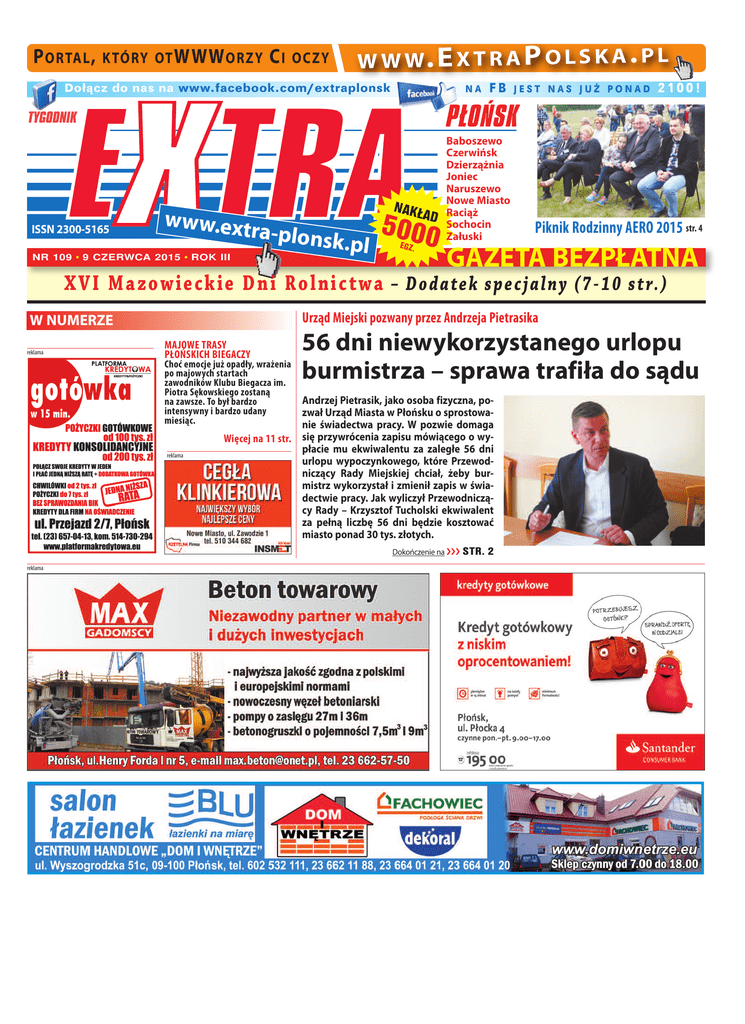 P oRTAl , KTóRy oT WWW oRzy Ci oCzy W W W. e x T R A P o l S K A . P l Dołącz do nas na www.facebook.com/extraplonsk NA FB JEST NAS JUŻ PONAD 2100! P¸O¡SK iSSn 2300-5165 NR 109 l www.ext ra-plonsk .pl 9 CZERWCA 2015 l ROK III NAKŁ AD 5000 EGZ. Baboszewo Czerwińsk Dzierzążnia Joniec naruszewo nowe Miasto Raciąż Sochocin załuski Piknik Rodzinny AERO 2015 str. 4 gAzeTA BezPłATnA X V I M a z o w i e c k i e D n i R ol n i c t wa – Dod atek specjalny (7-10 s t r.) Urząd Miejski pozwany przez Andrzeja Pietrasika W nUMeRze reklama MA jOwE tRAsy PłOńskich biEgAczy choć emocje już opadły, wrażenia po majowych startach zawodników klubu biegacza im. Piotra sękowskiego zostaną na zawsze. to był bardzo intensywny i bardzo udany miesiąc. reklama 56 dni niewykorzystanego urlopu burmistrza – sprawa trafiła do sądu Andrzej Pietrasik, jako osoba fizyczna, pozwał Urząd Miasta w Płońsku o sprostowanie świadectwa pracy. W pozwie domaga więcej na 11 str. się przywrócenia zapisu mówiącego o wypłacie mu ekwiwalentu za zaległe 56 dni urlopu wypoczynkowego, które Przewodniczący Rady Miejskiej chciał, żeby burmistrz wykorzystał i zmienił zapis w świadectwie pracy. Jak wyliczył Przewodniczący Rady – Krzysztof Tucholski ekwiwalent za pełną liczbę 56 dni będzie kosztować miasto ponad 30 tys. złotych. Dokończenie na ááá reklama STR. 2 2 na tapecie Urząd Miejski pozwany przez Andrzeja Pietrasika 56 dni niewykorzystanego urlopu burmistrza – sprawa trafiła do sądu Dokończenie ze ááá STR. 1 – Mając na uwadze budżet, zadłużenie miasta i deficyt, nie godzę się na takie wydawanie publicznych pieniędzy. (…) Wyciągnąłem do burmistrza rękę. Raz słownie, a drugi raz pisemnie prosiłem o wykorzystanie zaległego urlopu.(…) czas naglił mnie z wydaniem świadectwa pracy, więc wykreśliłem zapis o wypłacie ekwiwalentu, a zrobiłem pisemny zapis o wykorzystaniu 56 dni urlopu wypoczynkowego zgodnie z kodeksem pracy. I oto zostaliśmy wszyscy, jako miasto, mieszkańcy pozwani do sądu o przywrócenie tego zapisu o wypłacie ekwiwalentu. – tłumaczył dziennikarzom podczas konferencji prasowej w poniedziałek, 8 czerwca Przewodniczący Krzysztof Tucholski. – Uważam, że prawo zostało złamane zarówno przez burmistrza, ponieważ nie wykorzystał urlopu, jak i panią wiceburmistrz, która nadzoruje wykorzystanie urlopu przez pana burmistrza. – mówił na konferencji Tucholski. -Wiceburmistrz, jako osoba kompetentna do udzielenia urlopu powinna w myśl kodeksu pracy dokonać czynności dopełnienia udzielenia urlopu. Za jej niedopełnienie ponosi odpowiedzialność za naruszenie praw pracowniczych przewidzianą w art. 282 § 1, pkt. 2 kodeksu pracy. – cytował. 4 lata wcześniej, na początku ubiegłej kadencji ówczesna Przewodnicząca Rady Miejskiej Jolanta Mikołajewska podpisała świadectwo pracy burmistrza, na wypłatę 29 744 zł brutto ekwiwalentu za niewykorzystane 50 dni urlopu wypoczynkowego. bieg uliczny na Dzień Dziecka Biegiem, biegiem przez Płońsk! Po raz pierwszy w naszym mieście płońszczanie brali udział w biegu ulicznym organizowanym w ramach festynu rodzinnego Mama, Tata i Ja. zainteresowanie było ogromne – pobiegło niemal 140 osób! najmłodsi uczestnicy to kilkulatkowie, biegli trzymając za rękę mamę lub tatę, dzielnie pokonując 2,5 km dystans. Uczestnicy ruszyli z płyty stadionu miejskiego, do pokonania mieli odcinek do ronda Nauczycielstwa Polskiego, stamtąd powrót w ul. Kopernika, aż do ronda im. Prymasa Tysiąclecia, kardynała Stefana Wyszyńskiego i nawrotkę do stadionu, w miejsce mety. Na mecie czekał burmistrz Andrzej Pietrasik, który każdemu biegaczowi zakładał na szyję pamiątkowy medal. Nie 110 dni delegacji zagranicznych Według zestawienia z lat 2010-2014 w poprzedniej kadencji Burmistrz Miasta Płońska, 110 dni spędził na służbowych wyjazdach zagranicznych. Łącznie był w 13 krajach, w tym 12 dni w Grecji, 23 we Włoszech, 11 dni w Meksyku, 11 dni w Belgii i 11 dni w Rosji. Pozostałe delegacje były krótsze niż 10-dniowe. – W tym czasie burmistrz nie wykorzystał ani jednego dnia urlopu. To jest 22 tygodnie. (…) Niektóre podróże były z małżonką, oczywiście jest zapis, ze żona pana Burmistrza płaciła za swój pobyt. – dodał Przewodniczący Krzysztof Tucholski. Odpowiedź do sądu złożona bez wiedzy tucholskiego w jego imieniu? „Sąd zobowiązuje do przedłożenia pełnomocnictwa szczególnego było przegranych, każdy kto uczciwie ukończył bieg może czuć się zwycięzcą. Wśród uczestników biegu rozlosowano nagrody rzeczowe. Główną niespodzianką był rower. Specjalne nagrody otrzymały rodziny, które biegły w składzie co najmniej 3-osobowym. Organizatorem biegu było Gimnazjum nr 2 w Płońsku przy współpracy Urzędu Miejskiego. do postępowania w niniejszej sprawie udzielonego przez Prze wodniczącego Rady Miasta adwokatowi, Janowi Piskor skiemu i potwierdzenia czynności wniesienia odpowiedzi i zawar tego w nim stanowiska pozwanego.” – czytamy we fragmencie zapisu wezwania na rozprawę sądową Prze wodniczącego Rady Miejskiej, która ma się odbyć w Sądzie Rejonowym w Ciechanowie 28 lipca. – Po tym piśmie dopiero wyciągnąłem z Urzędu Miejskiego infor mację, że pan Pietrasik złożył pozew, a pan Piskorski został pełnomocnikiem i bez konsultacji ze mną, ani członkami Rady Miejskiej odpisał na pozew w moim imieniu. Ja o tej sprawie dowiedziałem się dopiero jak zostałem wezwanie z sądu, wtedy poprosiłem Urząd Miejski o wydanie mi dokumentów, czyli pozwu i odpowiedzi złożonej sądowi przez adwokata Jana Piskor skiego. – relacjonował Krzysztof Tucholski. W odpowiedzi adwokata Jana Piskorskiego na pozew złożony do sądu czytamy: „ W imieniu pozwanego Urzędu Miejskiego w Płońsku uznaję powództwo w całości. Strona pozwana potwierdza wszystkie twierdzenia powoda, uznając je za oczywiśc