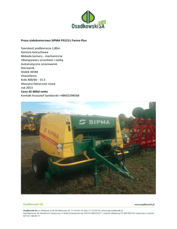 Prasa stałokomorowa SIPMA PS1211 Farma Plus Szerokość podbieracza 1,80m Komora łańcuchowa Blokada komory - mechaniczna Obwiązywacz sznurkiem i siatką Automatyczne smarowanie Sterownik Wałek WOM Oświetlenie Koła 400/60 - 15,5 Maszyna fabrycznie nowa rok 2013 Cena 45 000zł netto Kontakt Krzysztof Samborski +48602298568