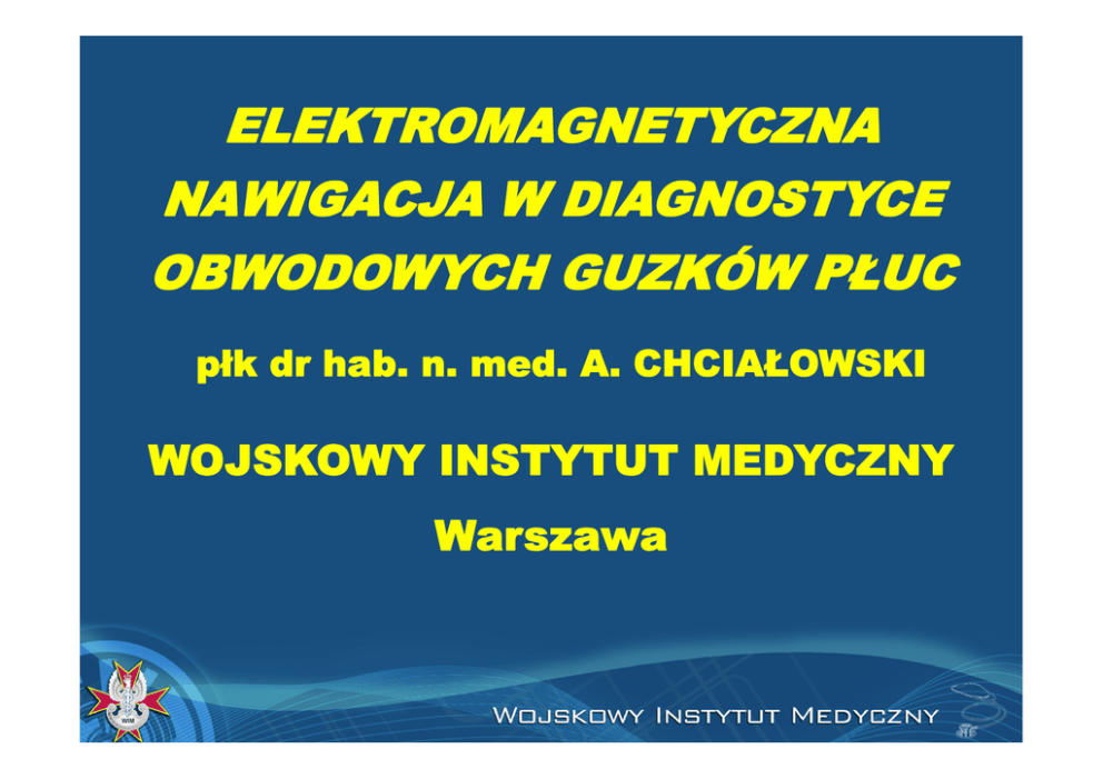 ELEKTROMAGNETYCZNA NAWIGACJA W DIAGNOSTYCE OBWODOWYCH GUZKÓW PŁUC płk dr hab. n. med. A. CHCIAŁOWSKI WOJSKOWY INSTYTUT MEDYCZNY Warszawa CIEŃ OKRĄGŁY PŁUCA Przeważnie rozpoznanie przypadkowe Powyżej 150 tyś rozpoznań każdego roku 0,09% - 0.20% badań rtg płuc – 1 x 500 Zmiana: Pojedyncza Lokalizacja pośród „zdrowego” płuca <3cm= guzki >3cm= guz Zasadnicze pytanie: Łagodna czy złośliwa? CIEŃ OKRĄGŁY PŁUCA Zmiana o średnicy do 2 -3 cm W około 40% podejrzana o tło nowotworowe – poniżej 1 cm - 15% podejrzana o tło nowotworowe – poniżej 7 mm – 0,9% podejrzana o tło nowotworowe – poniżej 5 mm - 0,2% podejrzana o tło nowotworowe - wiek CZYNNIKI RYZYKA - palenie papierosów - czynniki osobnicze -czynniki środowiskowe i -zawodowe Ost D i wsp.: The solitary pulmonary nodule. N E J M 2003;348:2535-254 CIEŃ OKRĄGŁY PŁUCA CHARAKTERYSTYKA RADIOLOGICZNA • Zmiana złośliwa – Pierwotna o nierównych brzegach – • Zmiana łagodna – lita, okrągła, gładka (90% ) – Charakterystyczne uwapnienie, – lita, okrągła gładka – Poniżej 5 mm średnicy • 20% przerzutowa – Nie lita 5‐9 mm średnicy – Grubościenna jama – Cienkościenna jama – Guzki satelitarne – Ekcentryczne uwapnienie Leef JL, and Klein JS. The solitary pulmonary nodule. Radiologic Clinics of North America 2002; 40:123-143 PODEJRZENIE ROZROSTU NOWOTWOROWEGO Wielkość Szybkość wzrostu ‐ stabilność w czasie Gęstość ‐ zmiany łagodne > 12 jH ‐ zmiany złośliwe > 40 jH Obecność wieńca promienistego Umiejscowienie w płacie górnym ALGORYTM POSTĘPOWANIA W OBWODOWYCH GUZKACH PŁUC O ŚREDNICY PONIŻEJ 8 mm Guzki obwodowe płuc < 8 mm *Ryzyko rozwoju raka Brak ryzyka rozwoju raka < 4 mm Kontrola w dowolnym czasie 4-6 mm 6-8 mm TK za 12 m-cy TK za 6, 12, 18 i 24 m-ce Brak dynamiki, kontrola w dowolnym czasie Brak dynamiki, kontrola w dowolnym czasie * ryzyko rozwoju raka – palenie, starszy wiek, nowotwór w rodzinie < 4 mm TK za 12 m-cy Brak dynamiki, kontrola w dowolnym czasie 4-6 mm 6-8 mm TK za 6, 12, 18 i 24 m-ce TK za 3, 6, 9, 12 i 24 m-ce Brak dynamiki, kontrola w dowolnym czasie ALGORYTM POSTĘPOWANIA W OBWODOWYCH GUZKACH PŁUC O ŚREDNICY 8 -30 mm Guzki obwodowe płuc 8 - 30 mm Małe prawdopodobieństwo raka < 5% TK za 6, 12, 18 i 24 m-ce Średnie prawdopodobieństwo raka > 5 -60% PET/CT BF, TBNA Kontrola w zależności od wyniku * prawdopodobieństwo raka – wiek. nowotwór w rodzinie, wielkość i lokalizacja zmiany Wysokie prawdopodobieństwo raka > 60% TORAKOSKOPIA/ TORAKOTOMIA USUNIĘCIE ZMIANY CIEŃ OKRĄGŁY PŁUCA <2cm średnicy diagnostyczny dylemat Jakie badania dodatkowe? CIEŃ OKRĄGŁY PŁUCA • Plwocina ‐ cytologia Badania genetyczne: gen p 54, DNA, metylacja Markery nowotworowe: CEA, NSE, CYFRA – 21‐1 (plwocina i surowica), czynniki angiogenezy • Bronchofiberoskopia – – – – płukanie oskrzeli, płukanie oskrzelowo ‐ pęcherzykowe biopsja szczoteczkowa przezoskrzelowa biopsja płuca ultrasonografia endoskopowa ‐ EBUS • Biopsja igłowa przez ścianę klatki piersiowej (fluoroskopia, TK) • Videotorakoskopia ‐ VATS • Torakotomia I N W A Z Y J N E BRONCHOSKOPIA WIRTUALNA - Wysokiej jakości, wtórna trójwymiarowa (3-D) rekonstrukcja obrazu dróg oddechowych, - Tworzenie projekcji – dotychczas dostępnych w badaniach endoskopowych – wnętrza narządu mającego światło. - Pozwala otrzymać porównywalne z bronchofiberoskopowymi obrazy zamknięcia, zwężenia i modelowania wnętrza dróg oddechowych, - Pozawala na stworzenie projekcji niemożliwych do uzyskania w bronchofiberoskopii, Wirtualna Bronchoskopia Asano et al, 2002 Journal of Bronchology 9:108–11 NAWIGACJA ELEKTROMAGNETYCZNA ELEKTROMAGNETYCZNA NAWIGACJA CT-Scan DICOM CD Mapowanie (planowanie) radiologiczne Rejestracja w rzeczywistym czasie Navigacja Biopsja Leczenie ELEKTROMAGNETYCZNA NAWIGACJA ELEKTROMAGNETYCZNA NAWIGACJA ELEKTROMAGNETYCZNA NAWIGACJA • 38 – SPN • Zmiana <30mm • 36/38 – (94.7%) nawigacja – zmiana zlokalizowana – Biopsja kleszczykowa 33/38 (86.8%) – Rozpoznanie 31/38 (81.6%) • Czas badania 24.9 min • 28 ‐ “zaznaczone zmiany” ‐ biopsja kleszczykowa 96.4% ‐ rozpoznanie ‐ 89.3%. Asano et al, 2006 Chest 130(2) 559 ELEKTROMAGNETYCZNA NAWIGACJA • 30 osób – 1 brak zgody – 3 brak możliwości uwidocznienia zmiany – rezygnacja z badania – 17 – rozpoznanie (65%) • • • • • 13 – pierwotny rak płuca, 1‐ hyperplazja, 1‐ zmiana przerzutowa, 1‐ sarkoidoza, 1‐ mykobakterioza Shinagawa N. Chest. 2004;125:1138-1143. ELEKTROMAGNETYCZNA NAWIGACJA Możliwości diagnostyczne ELEKTROMAGNETYCZNA NAWIGACJA KORZYŚCI • Możliwość wirtualnej 3D wizualizacji drzewa oskrzelowego do 17 generacji • Przydatność diagnostyczna 70%74%1,2 zmiany obwodowe • 100% węzły chłonne • Odma opłucnowa 2‐3%1,2 • • • • DLA LEKARZA Naturalna droga i niewielki stopień inwazyjności Możliwość dotarcia do zmian obwodowych Możliwość jednoczasowego pozyskania materiału ze zmiany obwodowej i węzłów chłonnych Krótki czas od rozpoznania do rozpoczęcia leczenia 1.Gildea, T, et al, AJRCCM 2006; 174: 982-989 2.Wilson, D., et al, JOB Oct 2007; 14(4): 227-232 Dziękuję za uwagę. CIEŃ OKRĄGŁY PŁUCA ETIOLOGIA Zmiana łagodna • niespecyficzna ziarnina (15‐25%) • hamartoma (15%) • ziarnina zapalna (15%): • • • • • Aspergilloza, Coccidioidomycoza, Cryptococcoza, Histoplazmoza, Gruźlica • naczyniowa (10%) • Urazowa (10%) Gładki, dobrze ograniczony guzek z centralną strefą uwapnienia – obraz typowy dla histoplazmozy Zmiana złośliwa • Gruczorakorak – 47% • Rak płaskonabłonkowy – 22% • Zmiany przerzutowe – 8% • Rak niedrobnokomórkowy – 7% • Rak drobnokomórkow – 4% Centrale zwapnienia z włóknistymi blaszkami Złogi wapniowe i tłuszczowe‐ obraz typowy dla hamartoma