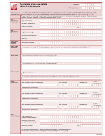 Formularz zmian na polisie aktualizacja danych Nr polisy: Nr rozliczeniowy: Generali ˚ycie T.U. S.A., ul. Post´pu 15B, 02-676 Warszawa, spó∏ka zarejestrowana w Sàdzie Rejonowym dla m. st. Warszawy XIII Wydzia∏ Gospodarczy Krajowego Rejestru Sàdowego pod numerem KRS 25952. NIP: 521-28-87-341, kapita∏ zak∏adowy 61.000.000 PLN, w pe∏ni op∏acony. Centrum Klienta tel.: 0 801 343 343, (0-22) 543 0 543 Prosz´ wype∏niç wniosek du˝ymi drukowanymi literami; ka˝da zmiana powinna zostaç potwierdzona podpisem przez Ubezpieczajàcego. Wszelkie informacje zawarte w tym wniosku traktowane sà jako poufne. Dane identyfikacyjne Ubezpieczajàcego Imi´ / Nazwa firmy Nazwisko / Nazwa firmy Nr PESEL / REGON Dane identyfikacyjne Ubezpieczonego NIP Imi´ Ubezpieczonego Nazwisko Ubezpieczonego Nr PESEL Zmiana numeru dokumentu to˝samoÊci Nr dowodu osobistego Zmiana urz´du skarbowego Adres urz´du skarbowego dla Ubezpieczajàcego w sprawach opodatkowania podatkiem dochodowym od osób fizycznych. Zmiana adresu Adres zameldowania Ubezpieczonego / Ubezpieczajàcego *** Adres korespondencyjny Ubezpieczonego / Ubezpieczajàcego *** Zmiana nazwiska Poprzednie nazwisko Nowe nazwisko (przy zmianie nazwiska koniecznoÊç do∏àczenia dokumentu potwierdzajàcego zmian´) Zmiana Uposa˝onego Imi´ i Nazwisko nowego Uposa˝onego Data urodzenia Pokrewieƒstwo % udzia∏ w Êwiadczeniu Data urodzenia Pokrewieƒstwo % udzia∏ w Êwiadczeniu Data urodzenia Pokrewieƒstwo % udzia∏ w Êwiadczeniu Adres nowego Uposa˝onego Imi´ i Nazwisko nowego Uposa˝onego Adres nowego Uposa˝onego Imi´ i Nazwisko nowego Uposa˝onego Adres nowego Uposa˝onego Zmiana Ubezpieczajàcego Imi´ / Nazwa firmy nowego Ubezpieczajàcego Nazwisko / Nazwa firmy nowego Ubezpieczajàcego Nr PESEL / REGON NIP Nie dotyczy umów zwiàzanych z prowadzeniem Indywidualniego Konta Emerytalnego IKE. W przypadku zmiany Ubezpieczajàcego konieczne jest do∏àczenie umowy cesji. 1-966-05.2008 Zmiana cz´stotliwoÊci op∏acania sk∏adki Dotychczasowa cz´stotliwoÊç Nowa cz´stotliwoÊç Powy˝sza transakcja zostanie przeprowadzona w dniu, gdy up∏ywa/rozpoczyna si´ odpowiednio kwarta∏, pó∏rocze lub rok danej polisy. Warunkiem przeprowadzenia zmiany jest op∏acenie sk∏adek regularnych do tego dnia. Zmiana wysokoÊci sk∏adki Dotychczasowa wysokoÊç sk∏adki podstawowej Dotychczasowa wysokoÊç sk∏adki reguralnej IKE Dotychczasowa wysokoÊç sk∏adki ca∏kowitej Nowa wysokoÊç sk∏adki podstawowej Nowa wysokoÊç sk∏adki reguralnej IKE Nowa wysokoÊç sk∏adki ca∏kowitej W przypadku zmiany wysokoÊci sk∏adki, ktore powoduje zwi´kszenie sumy ubezpieczenia, Ubezpieczony zobowiàzany jest wype∏niç formularz „OÊwiadczenie o stanie zdrowia” (nie dotyczy produktów IKE). Zmiana wysokoÊci sumy ubezpieczenia Dotychczasowa suma ubezpieczenia Nowa suma ubezpieczenia W przypadku zwi´kszenia wysokoÊci sumy ubezpiecznia, Ubezpieczony zobowiàzany jest wype∏niç formularz „OÊwiadczenie o stanie zdrowia”. Dokupienie/ Rezygnacja*** z umowy dodatkowej Nazwa umowy dodatkowej 1) 2) 3) OÊwiadczam, ˝e otrzyma∏em/am i zapozna∏em/am si´ z ogólnymi warunkami dodatkowych umów ubezpieczenia wymienionych powy˝ej. Nazwisko i Imi´ Ubezpieczajàcego Podpis Ubezpieczajàcego MiejscowoÊç i data W przypadku dokupienia umowy dodatkowej, Ubezpieczony zabowiàzany jest wype∏niç „OÊwiadczenie o stanie zdrowia“. Nie dotyczy umów ubezpieczenia na ˝ycie z ubezpieczeniowym funduszem kapita∏owym IKE i IKE BRE. Rezygnacja z proponowanej przez Towarzystwo indeksacji sum ubezpieczenia i sk∏adki Aktualizacja wzoru podpisu Podpisy OÊwiadczam, ˝e rezygnuj´ w bie˝àcym roku polisowym z indeksacji sumy ubezpieczenia i sk∏adki. Nazwisko i Imi´ Ubezpieczajàcego Podpis Ubezpieczajàcego MiejscowoÊç i data Wzór podpisu Ubezpieczony/Ubezpieczajàcy*** Podpisy sk∏adane przez Ubezpieczajàcego/Ubezpieczonego b´dàcego osobà fizycznà muszà byç zgodne ze wzorem podpisu z∏o˝onym na formularzu. Pole w szczególnoÊci niezb´dne do wype∏nienia przy zmianie nazwiska. *Nazwisko i Imi´ nowego Ubezpieczajàcego Podpis nowego Ubezpieczajàcego MiejscowoÊç i data **Nazwisko i imi´ dotychczasowego Ubezpieczajàcego Podpis dotychczasowego Ubezpieczajàcego MiejscowoÊç i data Nazwisko i Imi´ Ubezpieczonego Podpis Ubezpieczonego MiejscowoÊç i data PoÊrednik Ubezpieczeniowy Czytelny podpis MiejscowoÊç i data * W przypadku kiedy Ubezpieczajàcym jest firma wymagane sà piecz´ç oraz podpis osoby upowa˝nionej ** Podpis (i piecz´ç w przypadku firmy) poprzedniego Ubezpieczajàcego jest wymagana w przypadku zmiany Ubezpieczajàcego *** Niepotrzebne skreÊliç