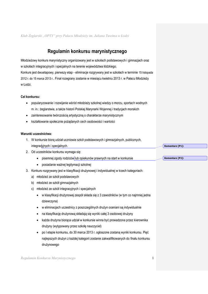 Klub Żeglarski „OPTY” przy Pałacu Młodzieży im. Juliana Tuwima w Łodzi Regulamin konkursu marynistycznego Młodzieżowy konkurs marynistyczny organizowany jest w szkołach podstawowych i gimnazjach oraz w szkołach integracyjnych i specjalnych na terenie województwa łódzkiego. Konkurs jest dwuetapowy, pierwszy etap - eliminacje rozgrywany jest w szkołach w terminie 15 listopada 2012 r. do 15 marca 2013 r.. Finał rozegrany zostanie w miesiącu kwietniu 2013 r. w Pałacu Młodzieży w Łodzi. Cel konkursu: popularyzowanie i rozwijanie wśród młodzieży szkolnej wiedzy o morzu, sportach wodnych m. in.: żeglarstwie, a także historii Polskiej Marynarki Wojennej i tradycjach morskich zainteresowanie twórczością artystyczną o charakterze marynistycznym kształtowanie społecznie pożądanych cech osobowości i wartości Warunki uczestnictwa: 1. W konkursie biorą udział uczniowie szkół podstawowych i gimnazjalnych, publicznych, integracyjnych i specjalnych. Komentarz [P1]: 2. Od uczestników konkursu wymaga się: pisemnej zgody rodziców lub opiekunów prawnych na start w konkursie posiadanie ważnej legitymacji szkolnej Komentarz [P2]: 3. Konkurs rozgrywany jest w klasyfikacji drużynowej i indywidualnej w trzech kategoriach: a) młodzież ze szkół podstawowych b) młodzież ze szkół gimnazjalnych c) młodzież ze szkół integracyjnych i specjalnych w klasyfikacji drużynowej zespół składa się z 3 zawodników (w tym co najmniej jedna dziewczyna) w eliminacjach uczestnicy z poszczególnych drużyn oceniani są indywidualnie na klasyfikację drużynową składają się wyniki całej 3 osobowej drużyny każda drużyna biorąca udział w konkursie winna być prowadzona przez kierownika drużyny (wytypowany przez szkołę nauczyciel) po I etapie konkursu, do 30 marca 2013 r. ogłoszone zostaną wyniki konkursu. Pięć najlepszych drużyn z każdej kategorii zostanie zakwalifikowanych do finału konkursu drużynowego Regulamin Konkursu Marynistycznego 1 Klub Żeglarski „OPTY” przy Pałacu Młodzieży im. Juliana Tuwima w Łodzi 10 najlepszych zawodników z każdej kategorii zostanie zakwalifikowanych do finału konkursu indywidualnego finał konkursu odbędzie się w kwietniu 2013 r. w Pałacu Młodzieży zgłoszenia do konkursu przyjmowane są do 15 lutego 2013 r. na adres: Klub Żeglarski „OPTY” przy Pałacu Młodzieży im. Juliana Tuwima, 94–050 Łódź, al. Wyszyńskiego 86, lub na adres e-mail: [email protected] w konkursie drużynowym zwycięży ta drużyna, która uzyska najlepszy wynik eliminacji + konkursu finałowego. szkoły nie posiadające dostępu do pływalń, mogą w terminie uzgodnionym z organizatorem konkursu – przeprowadzić tę konkurencję na basenie szkoły nr 198 w Łodzi. Organizacja konkursu: 1. W ramach eliminacji konkursowych rozegrane zostaną następujące konkurencje: pływanie na dystansie 50 m. stylem dowolnym rzut rzutką ratowniczą praktyczne wykonywanie węzłów żeglarskich odpowiedzi na pytania testowe z zakresu wiedzy o morzu i o żeglarstwie 2. W konkursie finałowym rozegrane zostaną następujące konkurencje: praktyczne wiązanie węzłów żeglarskich przeciąganie liny (drużynowe) odpowiedzi na pytania testowe z zakresu wiedzy o morzu i żeglarstwie 3. W ramach pomocy dydaktycznej dla uczestników konkursu do czasu rozpoczęcia konkursu finałowego istnieje możliwość prowadzenia konsultacji z: praktycznego wiązania węzłów rzutu rzutką ratowniczą z zakresu wiedzy teoretycznej o morzu i żeglarstwie przeciąganie liny Konsultacje te odbędą się w Pałacu Młodzieży w Łodzi w uzgodnionych terminach. Prowadzący kpt. Jerzy Markowski tel.: 691-794-130 4. Zalecana literatura: Encyklopedia żeglarska – J. Czajewski Ceremoniał Morski i Etykieta Jachtowa – E. Koczorowski, J. Koziarski, R. Pluta Regulamin Konkursu Marynistycznego 2 Klub Żeglarski „OPTY” przy Pałacu Młodzieży im. Juliana Tuwima w Łodzi Wielkie dni malej floty – J. Pertek Żeglarz i sternik jachtowy – A. Kolaszewski, P. Świdwiński Zasady składania protestów: 1. Kierownik drużyny ma prawo zgłaszania protestu na piśmie w terminie do 30 min. od oficjalnego ogłoszenia wyników danej konkurencji i konkursu 2. Protest może dotyczyć regulaminowego przebiegu konkurencji 3. Do rozpatrzenia składanych protestów oraz podejmowania decyzji w tej sprawie powołuje się Komisję Odwoławczą w składzie: Sędzia Główny Konkursu jako przewodniczący Przedstawiciel Organizatora Konkursu Kierownik jednej z drużyn wybrany podczas odprawy technicznej. 4. Wyniki konkurencji należy ogłosić po zakończeniu danej konkurencji i po zakończeniu konkursu, poprzez umieszczenie ich na tablicy ogłoszeń w miejscu przebywania zawodników. Nagrody 1. Drużyny, które w finale zajęły miejsce I – III otrzymują puchary oraz dyplomy, za miejsce IV – VI dyplomy (w 3 kategoriach) 2. Zawodnicy, którzy łącznie (eliminacje + finał) uzyskają miejsce I – III otrzymują puchary i dyplomy (w 3 kategoriach), a za zajęcie miejsca IV – VI dyplomy 3. Wszyscy uczestnicy Konkursu Finałowego którzy nie otrzymali dyplomów za zajęte miejsca – otrzymają dyplomy uczestnictwa 4. Na zwycięzców konkursu drużynowego i indywidualnego przewidziane są nagrody: tygodniowe rejsy po jeziorach Mazurskich i Zalewie Sulejowskim (wyżywienie własne) weekendy na Zalewie Sulejowskim, na jachcie w uzgodnionym terminie (wyżywienie własne) nagrody rzeczowe dla zwycięzców Punktacja i regulaminy konkurencji: 1. Pływanie na dystansie 50 metrów stylem dowolnym Najlepszy wynik – 60 pkt. Najsłabszy wynik – 20 pkt. Nieukończenie konkurencji – 0 pkt Regulamin Konkursu Marynistycznego 3 Klub Żeglarski „OPTY” przy Pałacu Młodzieży im. Juliana Tuwima w Łodzi Wyniki pomiędzy najlepszym a najsłabszym będą ustalane proporcjonalnie przez sędziego w trzech kategoriach: Szkół Podstawowych Gimnazjum Integracyjnych i Specjalnych 2. Węz