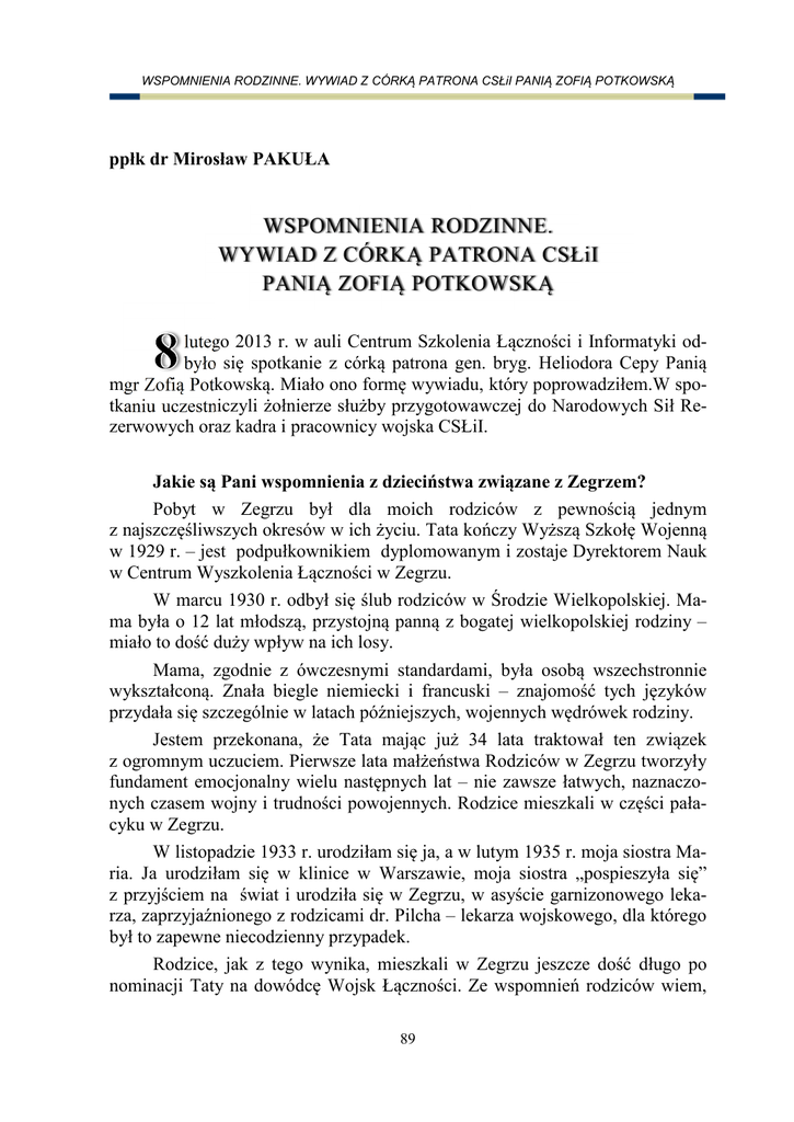 WSPOMNIENIA RODZINNE. WYWIAD Z CÓRKĄ PATRONA CSŁiI PANIĄ ZOFIĄ POTKOWSKĄ ppłk dr Mirosław PAKUŁA lutego 2013 r. w auli Centrum Szkolenia Łączności i Informatyki odbyło się spotkanie z córką patrona gen. bryg. Heliodora Cepy Panią mgr Zofią Potkowską. Miało ono formę wywiadu, który poprowadziłem.W spotkaniu uczestniczyli żołnierze służby przygotowawczej do Narodowych Sił Rezerwowych oraz kadra i pracownicy wojska CSŁiI. Jakie są Pani wspomnienia z dzieciństwa związane z Zegrzem? Pobyt w Zegrzu był dla moich rodziców z pewnością jednym z najszczęśliwszych okresów w ich życiu. Tata kończy Wyższą Szkołę Wojenną w 1929 r. – jest podpułkownikiem dyplomowanym i zostaje Dyrektorem Nauk w Centrum Wyszkolenia Łączności w Zegrzu. W marcu 1930 r. odbył się ślub rodziców w Środzie Wielkopolskiej. Mama była o 12 lat młodszą, przystojną panną z bogatej wielkopolskiej rodziny – miało to dość duży wpływ na ich losy. Mama, zgodnie z ówczesnymi standardami, była osobą wszechstronnie wykształconą. Znała biegle niemiecki i francuski – znajomość tych języków przydała się szczególnie w latach późniejszych, wojennych wędrówek rodziny. Jestem przekonana, że Tata mając już 34 lata traktował ten związek z ogromnym uczuciem. Pierwsze lata małżeństwa Rodziców w Zegrzu tworzyły fundament emocjonalny wielu następnych lat – nie zawsze łatwych, naznaczonych czasem wojny i trudności powojennych. Rodzice mieszkali w części pałacyku w Zegrzu. W listopadzie 1933 r. urodziłam się ja, a w lutym 1935 r. moja siostra Maria. Ja urodziłam się w klinice w Warszawie, moja siostra „pospieszyła się” z przyjściem na świat i urodziła się w Zegrzu, w asyście garnizonowego lekarza, zaprzyjaźnionego z rodzicami dr. Pilcha – lekarza wojskowego, dla którego był to zapewne niecodzienny przypadek. Rodzice, jak z tego wynika, mieszkali w Zegrzu jeszcze dość długo po nominacji Taty na dowódcę Wojsk Łączności. Ze wspomnień rodziców wiem, 89 WSPOMNIENIA RODZINNE. WYWIAD Z CÓRKĄ PATRONA CSŁiI PANIĄ ZOFIĄ POTKOWSKĄ że mieszkańcy Centrum tworzyli zżytą z sobą społeczność. Kwitło życie towarzyskie skupione wokół kasyna, a latem yacht- klubu. Środowisko było specyficzne. Oficerowie w większości pochodzili z różnych armii, z różnych zaborów. Również ich żony pochodziły z różnych stron, przynosiły z sobą różne zwyczaje i sposoby bycia. Fakt, że wszyscy mieszkali w Zegrzu – a Warszawa była jednak wówczas miejscem oddalonym – przyczyniał się z pewnością do powstania więzi towarzyskich i trwałych przyjacielskich. Po powrocie z Anglii do Polski w 1946 r. rodzice utrzymywali – praktycznie do końca życia – kontakty przyjacielskie z osobami z Zegrza, którzy przetrwali zawieruchę wojenną. Jedną z pierwszych naszych wypraw po powrocie była wycieczka do Zegrza promem (most był zbombardowany i nieczynny). Jeździliśmy też na krótkie pobyty do przyjaciół na Borową Górę, dawnych zegrzyniaków. Proszę opowiedzieć jak wyglądało życie Pani rodziny od 1934 gdy ojciec został dowódcą wojsk łączności? Jak już wspomniałam mieszkaliśmy jeszcze w Zegrzu co najmniej do połowy 1935 r. Potem rodzice przenieśli się do Warszawy. Zamieszkaliśmy w willi na Żoliborzu, a mieszkanie takie ułatwiły duże możliwości materialne Mamy. Dom został zniszczony w czasie powstania warszawskiego, nic z niego nie zostało. W Warszawie powiększył się krąg kontaktów Taty i rodziców. Miasto to – stolica państwa – było na mapie Polski znaczącym ośrodkiem politycznym, ale również kulturalnym. Rodzice – wiem to z ich wspomnień – uczestniczyli w życiu polityczno-towarzyskim stolicy. Byłam za mała, by zapamiętać szczegóły. W pamięci zapadły mi tylko budynek Ministerstwa Spraw Wojskowych z lwami u wejścia i siedziba Sztabu Generalnego Wojska Polskiego z pomnikiem księcia Józefa Poniatowskiego i Grobem Nieznanego Żołnierza w kolumnadzie Pałacu Saskiego. Pamiętam te budynki z wycieczek do miasta z Tatą. We wrześniu 1939 r., przed opuszczeniem Warszawy, Tata z naszego domu zabrał w pospiechu jedynie album ze zdjęciami rodzinnymi. Tylko to ocalało. Jak zapamiętała Pani wrzesień 1939 r.? W sierpniu Mama wyjechała z nami na wakacje do majątku znajomych – nazwy już dziś nie pamiętam – położonego w Tarnopolskim, niedaleko Dniestru. Przeżyliśmy tam początek wojny. W ostatniej prawie chwili udało się Tacie zorganizować nasz wyjazd. W nocy, jak pamiętam, wyjechaliśmy małym samo 90 WSPOMNIENIA RODZINNE. WYWIAD Z CÓRKĄ PATRONA CSŁiI PANIĄ ZOFIĄ POTKOWSKĄ chodem (w którym udało się umieścić jeszcze znajomą panią z dwójką dzieci), w wielkim zamieszaniu, między nalotami niemieckimi. Przekroczyliśmy w ostatnim dniu granicę rumuńska na moście w Zaleszczykach. Dotarłyśmy do Bukaresztu, gdzie pomógł nam urządzić się ówczesny polski attaché wojskowy płk Zakrzewski. Tata tymczasem został internowany w Rumunii. Udało mu się wyjechać z Rumunii; wykorzystując swoją dobrą znajomość języka niemieckiego udawał Niemca z Tyrolu – w kieszeni miał tymczasowy paszport/poświadczenie konsulatu polskiego w Bukareszcie na nazwisko Heliodor Wyszyński. Spotkaliśmy się z Tatą dopiero w pociągu do Francji. Powitałyśmy z siostrą Tatę tak żywiołowo i emocjonalnie, że nie udało się wobec innych pasażerów w przedziale kolejowym zachować, zaplanowanego przez rodziców, braku znajomości z panem, który zjawił się w naszym przedziale. Jak wyglądała droga Pani rodziny do Wielkiej Brytanii? W Paryżu przez kilka tygodni byliśmy razem. Kiedy sytuacja wojenna zaczęła się komplikować Tata umieścił nas w miejscowości nadmorskiej Sablesd’Olonne, na wybrzeżu Atlantyku. Stamtąd Mama przedostała się z nami do Bordeaux, gdzie razem z częścią polskich jednostek wojskowych i kilkoma rodzinami u