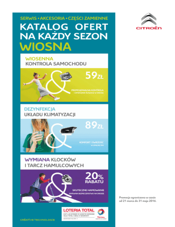 SERWIS AKCESORIA CZĘŚCI ZAMIENNE KATALOG OFERT NA KAŻDY SEZON WIOSENNA KONTROLA SAMOCHODU 59ZŁ PROFESJONALNA KONTROLA I SPOKOJNIE RUSZASZ W DROGĘ 89ZŁ KOMFORT I ŚWIEŻOŚĆ W UPALNE DNI 20 % RABATU SKUTECZNE HAMOWANIE ZAPEWNIA BEZPIECZEŃSTWO NA DRODZE Promocja ograniczona w czasie od 21 marca do 31 maja 2016. 3 20% RABATU DLA WSZYSTKICH MODELI SAMOCHODÓW MARKI CITROËN POWYŻEJ 2 LAT OCHRONA SILNIKA DZIĘKI REGULARNEJ WYMIANIE OLEJU Z FILTREM OFERTA DOTYCZY WYMIANY OLEJU SILNIKOWEGO NA OLEJ TOTAL ORAZ FILTRA NA ORYGINALNY FILTR OLEJU CITROËNA PRZYKŁADY: Do modelu / Opis NOWY CITROËN C3 WSZYSTKIE SILNIKI Rodzaj oleju TOTAL TOTAL QUARTZ 7000 10W40 OLEJ PÓŁSYNTETYCZNY TOTAL QUARTZ INEO ECS 5W30 OLEJ SYNTETYCZNY CENA PROMOCYJNA WYMIANY OLEJU WRAZ Z FILTREM 179 zł 249 zł W OFERCIE POSIADAMY TAKŻE INNE OLEJE TOTAL. CENA WYMIANY JEST WÓWCZAS INNA NIŻ PODANA W PRZYKŁADZIE. 2 3 20% RABATU DLA WSZYSTKICH MODELI SAMOCHODÓW MARKI CITROËN POWYŻEJ 2 LAT NA ROBOCIZNĘ I CZĘŚCI ZAMIENNE UŻYTE W PONIŻSZYCH USŁUGACH WARTO WIEDZIEĆ Klocki hamulcowe stanowią jeden z najważniejszych elementów w układzie hamulcowym. Układ hamulcowy jest jednym z najważniejszych układów w samochodzie. Jego sprawność bezpośrednio wpływa na bezpieczeństwo na drodze. Mocno zużyte klocki powodują zmniejszenie skuteczności działania układu hamulcowego oraz prowadzą do zniszczenia powierzchni tarcz hamulcowych. WARTO WIEDZIEĆ Ta r c z e h a m u l c o w e m a j ą d u ż y w p ł y w n a bezpieczeństwo. Ich wymiany należy dokonać gdy grubość tarczy spadnie do określonej przez producenta, jako minimalna. Wymiany należy dokonać także, kiedy tarcze są odkształcone, mają wgłębienia lub są skorodowane. Montaż nowych tarcz zawsze pociąga za sobą konieczność wymiany klocków hamulcowych. PRZYKŁADY: CENA PROMOCYJNA Nr referencyjny CZĘŚCI I ROBOCIZNY Do modelu CITROËN C4 PICASSO, CITROËN BERLINGO 3 SILNIKI 1.6i 4254 25 306 zł CITROËN C-ELYSEE 16 111 406 80 CITROËN C3 II, CITROËN C3 PICASSO, NOWY CITROËN C3 16 112 939 80 345 zł 349 zł PRZYKŁADY: Do modelu CITROËN C-ELYSEE CITROËN C4 PICASSO, CITROËN BERLINGO 3 SILNIKI 1.6i Nr referencyjny Klocki Tarcze 16 111 406 80 4249 83 765 zł 4254 25 4249 J6 773 zł 4249 83 785 zł CITROËN C3 II, CITROËN C3 PICASSO, 16 112 939 80 NOWY CITROËN C3 WARTO WIEDZIEĆ Sprzęgło jest jednym z podstawowych elementów odpowiadających za działanie samochodu. Kontroluje ono moc silnika, która przekazywana jest na koła pojazdu, napędzające całą jego masę. Usterka sprzęgła zwykle kończy się unieruchomieniem samochodu. PRZYKŁADY: Do modelu CITROËN C3 SILNIKI 1.6i WARTO WIEDZIEĆ 16 112 849 80 2052 Z1 1 193 zł 1 359 zł 1 858 zł PRZYKŁADY: Do modelu 4 CENA PROMOCYJNA Nr referencyjny CZĘŚCI I ROBOCIZNY 2053 09 CITROËN C3, CITROËN C ELYSEE SILNIKI 1.2i CITROËN C4 PICASSO, CITROËN C5 SILNIKI 1.6 HDi Układ rozrządu to jeden z najważniejszych elementów silników spalinowych we współczesnych samochodach. Podlega on regularnej wymianie, i koniecznie należy stosować się do zaleceń producenta samochodu w tej kwestii. Zerwanie paska rozrządu podczas jazdy może spowodować w silniku bardzo duże uszkodzenia. CENA PROMOCYJNA CZĘŚCI I ROBOCIZNY CITROËN C3, CITROËN BERLINGO SILNIKI 1.4i CITROËN C3 SILNIKI 1.4 HDi CITROËN C3, CITROËN C4 PICASSO, CITROËN BERLINGO, CITROËN C5 SILNIKI 1.6 HDi CENA PROMOCYJNA Nr referencyjny CZĘŚCI I ROBOCIZNY 0831 S0 501 zł 0831 T3 621 zł 0831 V4 682 zł UWAGA: CENY USŁUG ZOSTAŁY SKALKULOWANE Z UWZGLĘDNIENIEM NORM CZASOWYCH AUTOMOBILES CITROËNA ORAZ ŚREDNICH STAWEK ROBOCIZNY STOSOWANYCH W SIECI AUTORYZOWANYCH SERWISÓW CITROEN. CENY RZECZYWISTE MOGĄ NIEZNACZNIE RÓŻNIĆ SIĘ OD TYCH PODANYCH W BROSZURZE. PODANE CENY ZAWIERAJĄ CZĘŚCI ZAMIENNE, USŁUGĘ WYMIANY ORAZ PODATEK VAT I DOTYCZĄ WYBRANYCH MODELI. DOKŁADNĄ CENĘ DLA TWOJEGO SAMOCHODU SPRAWDŹ W AUTORYZOWANYM SERWISIE CITROËNA. 20% RABATU DLA WSZYSTKICH MODELI SAMOCHODÓW MARKI CITROËN POWYŻEJ 2 LAT NA ROBOCIZNĘ I CZĘŚCI ZAMIENNE UŻYTE W PONIŻSZYCH USŁUGACH WARTO WIEDZIEĆ PRZYKŁADY: Nr referencyjny Do modelu CITROËN C4 PICASSO 98 090 457 80 CITROËN C3 PICASSO, CITROËN C-ELYSEE 5087 69 lub 5087 68 CITROËN C4, CITROËN C4 PICASSO, CITROËN BERLINGO 3 16 142 811 80 Łącznik stabilizatora jest pracującym skrętnie, elastycznym elementem, który łączy ze sobą zawieszenia prawego i lewego koła jednej osi samochodu. Usterka łącznika może się objawić niepewnym i niestabilnym zachowaniem podczas manewru skręcania, tym samym powodując niebezpieczne zachowania na drodze. CENA PROMOCYJNA CZĘŚCI I ROBOCIZNY 138 zł 139 zł 170 zł WARTO WIEDZIEĆ Amortyzatory są bardzo ważnymi elementami zawieszenia samochodu wpływającymi na bezpieczeństwo. Nie tylko tłumią drgania powstające podczas jazdy, ale przed wszystkim odpowiadają za przyczepność kół do nawierzchni. Jazda z niesprawnie działającymi amortyzatorami sprawi, że koła samochodu będą odrywać się od nawierzchni. Auto przez to będzie bardziej skłonne do poślizgów. NOWOŚĆ WIZYTA W SERWISIE ON-LINE TERAZ NA WYKONANIE WIZYTY W SERWISIE MOŻESZ UMÓWIĆ SIĘ PRZEZ INTERNET W KAŻDEJ CHWILI ! SPRAWDŹ NA WWW.CITROEN.PL OD ROZWIĄZANIE ZAPEWNIAJĄCE ZUPEŁNIE NOWY STANDARD! POZWALA ZAOSZCZĘDZIĆ CI CZAS, KTÓRY MUSIAŁBYŚ POŚWIĘCIĆ NA SAMODZIELNY DOJAZD DO SERWISU I OCZEKIWANIE NA WYKONANIE ZLECONEJ USŁUGI. OBEJMUJE KAŻDĄ USŁUGĘ ZWIĄZANĄ Z TWOIM SAMOCHODEM I POLEGA NA: 30ZŁ NOWOŚĆ ODBIORZE TWOJEGO SAMOCHODU PRZEZ PRACOWNIKA ASO CITROËN ZE WSKAZANEGO PRZEZ CIEBIE MIEJSCA, WYKONANIU ZLECONEJ USŁUGI W ASO CITROËN, DOSTARCZENIU TWOJEGO SAMOCHODU PRZEZ PRACOWNIKA ASO CITROËN WE WSKAZANE PRZEZ CIEBIE MIEJSCE. KOSZT USŁUGI TRANSPORTU SAMOCHODU OD / DO KLIENTA: OD 30 ZŁ W JEDNĄ STRONĘ OD 60 ZŁ W DWIE STRONY ODBIÓR SAMOCHODU OD KLIENTA (NP. PRACA/DOM) LUB DOSTAWA DO KLIENTA PO NAPRAWIE ODBIÓR SAMOC