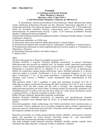 RM – WK/28/07/12 Protokół ze wspólnego posiedzenia Komisji Rady Miejskiej w Rzgowie odbytego w dniu 11 lipca 2012 r. w Sali Obrad Rady Miejskiej w Rzgowie, pl. 500-lecia 22 W posiedzeniu, któremu przewodniczył Przewodniczący Marek Bartoszewski udział wzięli członkowie połączonych Komisji wg listy obecności stanowiącej załącznik nr 1 do niniejszego protokołu, oraz zaproszeni goście wpisani listę stanowiącą zał. 2. Przewodniczący obrad po powitaniu członków Komisji, zaproszonych gości i stwierdzeniu quorum uprawniającego do podejmowania decyzji, o godz. 12.20 rozpoczął posiedzenie Komisji zgodnie z zaproponowanym porządkiem: 1.Omówienie funkcjonowania poszczególnych działów Gminnego Ośrodka Sportu, Turystyki i Rekreacji w Rzgowie. 2. Omówienie materiałów na XXIII sesję. 3. Omówienie zasad wprowadzenia opłaty adiacenckiej w Gminie Rzgów. 4. Przedstawienie opracowania systemu budowy wodociągów i kanalizacji w Gminie Rzgów. 5. Przedstawienie informacji na temat magistrali głównej wod-kan między ul. Cmentarną a ul. Pabianicką w Rzgowie. 6. Prezentacja koncepcji budowy obwodnicy Rzgowa. 7. Sprawy różne. Ad.1. Otwarcie hali sportowej w Rzgowie nastąpiło 26 marca 2012 r. Dyrektor GOSTiR w Rzgowie Wojciech Skibiński powiedział, że pomysł omówienia funkcjonowania hali powstał na ostatniej sesji. Na komisje zostali zaproszeni poszczególni kierownicy, którzy omówią funkcjonowanie swoich działów. Z otrzymanej dotacji z Urzędu Miejskiego w wysokości 900 tys. zł. zabraknie 75 ty. zł., z czego 37 tys. zł. przeznaczone byłoby na zwiększenie zakupu energii elektrycznej i gazu. Rachunki pokazały że w okresie zimowym opłaty są wysokie. Zwiększenie o 4 tys. zł. na program księgowy, 11 tys. zł na płace, zwiększenie o 7 tys. zł. ma zakup materiałów i wyposażenia. Urząd Miejski może odzyskać część kosztów z PFRON z tytułu zatrudnienia firmy ochroniarskiej na hali sportowej. Hala sportowa działa 7 dni w tygodniu, w ciągu roku szkolnego od pon-pt od 8 do 15 odbywają się zajęcia wychowania fizycznego dla szkół, natomiast od 15 do 21 oraz w soboty i niedziele 10-21 dla hala czynna jest dla osób z zewnątrz. Dla zapewnienia takiego funkcjonowania potrzeba jest trzech zmian. Na każdej zmianie jest kierownik- gospodarz sali. Zatrudnionych jest 14 osób na cały etat oraz dwie osoby na ¼ etatu. Koszt miesięczny wynosi w granicach 80 tys. zł. Rocznie wychodzi to około 1 mln zł. Radny Wiesław Gąsiorek zapytał jakie materiały są potrzebne. Dyrektor Wojciech Skibiński powiedział, że potrzebny jest specjalistyczny program księgowy, kosiarka i kosa. Brakuje także ok. 20 tys. zł. na doprowadzenie do lepszego stanu siłowni. Kierownik-gospodarz działu technicznego Jan Nykiel powiedział, które pomieszczenia są serwisowane. Umowy podpisane są na wszystkie urządzenia oprócz ścianki wspinaczkowej, ponieważ musi być użytkowana przez pół roku. Wszystkie usterki jakie wystąpiły w budynku hali mają być usunięte do końca sierpnia. Burmistrz powiedział, że została przeprowadzona analiza obiektów stanowiących własność gminy, aby sprawdzić ile wynosi poziom zużywanej energii, by móc zaoszczędzić. Pan Snelewski przygotowuje przetarg na dostawcę energii. Gdy będą dostępne środki pieniężne Dyrektor Skibiński chciałby zakupić czujniki, które automatycznie będą załączały i wyłączały światło w toaletach i szatniach. 1 Radny Marek Skalski zapytał czy został rozwiązany temat usterek, ponieważ będąc na hali widział zacieki. Kierownik-gospodarz hali Jan Nykiel powiedział, że po burzy były zacieki, ale być może powodem była dostająca się woda przez wentylatory. Firma „Pruszyński” ma zająć się tą sprawą i założyć wywiewki. Radny Marek Skalski zapytał także czy w ramach gwarancji firma wymieni płyty, aby przywrócić poprzednią estetykę. P. Jan Nykiel powiedział, że płyta zostanie wymieniona. Kierownik Inwestycji Zbigniew Snelewski powiedział, że po mocnych opadach pokazują się zacieki. Na dachu wygląda wszystko idealnie, nie ma żadnych usterek. Wykonawca twierdzi, że przestrzeń między jedną a drugą blachą jest przestrzenią niewentylowaną w związku z tym przyjęto to do naprawy. Wykonawca na swój koszt wstawi dodatkowe wywietrzniki. Radny Stanisław Gierasiński odniósł się do zużycia energii i wyjaśnił, że wybór innego operatora nie spowoduje dużego zmniejszenia kosztów. Jeżeli zmieni się operatora powrót do poprzedniego operatora spowoduje zwiększenie kosztów. Radny zapytał czy jest karta zużycia paliwa. Radny poprosił, aby tabliczka do hali sportowej na skrzyżowaniu ul. Ogrodowej i ul. Tuszyńskiej powinna być bardziej wyeksponowana. Teren od strony południowej hali powinien być zagrodzony. Dyrektor W. Skibiński powiedział, że wykonanie ogrodzenia pociągnie za sobą duże koszty. Została zamieniona kamera tak, aby był widoczny cały teren za halą. Jeżeli kamera nie pomoże to hala zostanie ogrodzona. Firma ma reagować na wszelkiego rodzaju zachowania, którą mogą prowadzić do strat i uszkodzeń. Dyrektor także jest za zmianą znaków kierujących do hali, ponieważ są one za małe. Co kwartał jest robione spotkanie wszystkich pracowników, obchód hali i z takiego posiedzenia sporządzony jest protokół, który jest do wglądu. Kierownik-gospodarz działu sportowego Robert Świerczyński jest odpowiedzialny za nawierzchnie sali, sprzęt, kontakty z firmą ochroniarską oraz szkołami. Do dnia 30 czerwca odnotowano ponad 10 tys. wejść na halę. Dyrektor W. Skibiński powiedział, że przepisy nie pozwalają na prowadzenie sekcji sportowych, ponieważ hala nie posiada odpowiednich środków a także nie może pobierać za to pieniędzy. P. Robert Świerczyński stwierdził, że ponieważ korzystanie z zajęć na hali sportowej jest bezpłatne, jest bardzo duże zainteresowanie squszem. Zost