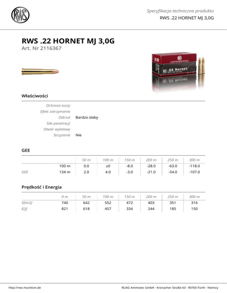 Specyfikacja techniczna produktu RWS .22 HORNET MJ 3,0G RWS .22 HORNET MJ 3,0G Art. Nr 2116367 Właściwości Ochrona tuszy Efekt zatrzymania Odrzut Bardzo słaby Siła penetracji Otwór wylotowy Strzyżenie Nie GEE 50 m 100 m 150 m 200 m 250 m 300 m 100 m 0.0 ±0 -8.0 -28.0 -63.0 -118.0 134 m 2.0 4.0 -3.0 -21.0 -54.0 -107.0 0m 50 m 100 m 150 m 200 m 250 m 300 m V[m/s] 740 642 552 472 403 351 316 E[J] 821 618 457 334 244 185 150 GEE Prędkość i Energia http://rws-munition.de RUAG Ammotec GmbH · Kronacher Straße 63 · 90765 Fürth · Niemcy Specyfikacja techniczna produktu RWS .22 HORNET MJ 3,0G .22 Hornet Ursprung des Kalibers Das Kaliber RWS .22 Hornet ist ideal für die Fuchs- und Hasenjagd, da es besonders balg- und wildbretschonend ist. Daher wird es häufig auch für die Jagd auf den Auerhahn oder Birkhahn eingesetzt. Die ideale Schussentfernung liegt knapp unter 100 m, da dieses kleine Kaliber etwas windempfindlich ist. Wegen seines geringen Rückstoßes ist das kleine Kaliber bei Jägerinnen und Jägern sehr beliebt. Aus modernen Waffen zeigt das .22 Hornet eine hervorragende Präzision. Dieses Kaliber ist zudem perfekt für Einsteckläufe in kombinierten Waffen geeignet, da es den Verschluss nicht so stark belastet. Für ältere Drillinge stellt es häufig das Maximalkaliber für Einsteckläufe dar. Jagdlich wird es oft in präzisen Repetierern genutzt. ACHTUNG: Diese Patrone ist nicht für den jagdlichen Einsatz empfohlen. Pocisk Match Jagd Ten pocisk nie nadaje się do polowania! Pociski przeznaczone dla myśliwych biorących udział w zawodach sportowych oraz młodych myśliwych szykujących się do strzeleckiego egzaminu myśliwskiego. Platerowany tombakiem płaszcz zapewnia niskie tarcie w przewodzie lufy i ogrnicza jej zużycie. Niewielkie lecz ważne modyfikacje szczegółów konstrukcji pocisku pozwoliły podnieść celność kosztem balistyki końcowej. Z racji wymogu zachowania energii powyżej 1000 J na odległości 100 m zapisanego w prawie myśliwskim, naboje RWS .222 Rem MJ 3,4 g nadają się znakomicie do treningu dla myśliwych przed egzaminami i do strzelania samego egzaminu. http://rws-munition.de RUAG Ammotec GmbH · Kronacher Straße 63 · 90765 Fürth · Niemcy Specyfikacja techniczna produktu RWS .22 HORNET MJ 3,0G Budowa pocisku Match Jagd 1. Rdzeń ołowiany zapewnia stabilność 2. Szczyt pocisku z wybraniem wierzchołkowym 3. Stalowy płaszcz platerowany tombakiem 4. Wklęsły czepiec denny http://rws-munition.de RUAG Ammotec GmbH · Kronacher Straße 63 · 90765 Fürth · Niemcy