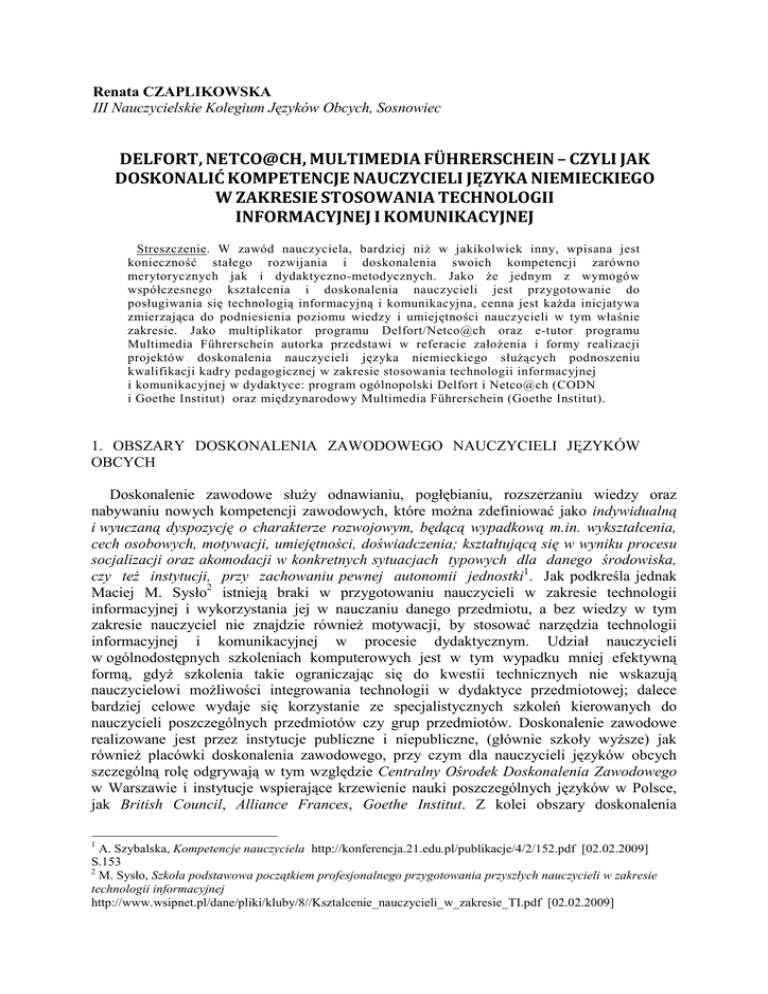 Renata CZAPLIKOWSKA III Nauczycielskie Kolegium Języków Obcych, Sosnowiec DELFORT, NETCO@CH, MULTIMEDIA FÜHRERSCHEIN – CZYLI JAK DOSKONALIĆ KOMPETENCJE NAUCZYCIELI JĘZYKA NIEMIECKIEGO W ZAKRESIE STOSOWANIA TECHNOLOGII INFORMACYJNEJ I KOMUNIKACYJNEJ Streszczenie. W zawód nauczyciela, bardziej niŜ w jakikolwiek inny, wpisana jest konieczność stałego rozwijania i doskonalenia swoich kompetencji zarówno merytorycznych jak i dydaktyczno-metodycznych. Jako Ŝe jednym z wymogów współczesnego kształcenia i doskonalenia nauczycieli jest przygotowanie do posługiwania się technologią informacyjną i komunikacyjna, cenna jest kaŜda inicjatywa zmierzająca do podniesienia poziomu wiedzy i umiejętności nauczycieli w tym właśnie zakresie. Jako multiplikator programu Delfort/Netco@ch oraz e-tutor programu Multimedia Führerschein autorka przedstawi w referacie załoŜenia i formy realizacji projektów doskonalenia nauczycieli języka niemieckiego słuŜących podnoszeniu kwalifikacji kadry pedagogicznej w zakresie stosowania technologii informacyjnej i komunikacyjnej w dydaktyce: program ogólnopolski Delfort i Netco@ch (CODN i Goethe Institut) oraz międzynarodowy Multimedia Führerschein (Goethe Institut). 1. OBSZARY DOSKONALENIA ZAWODOWEGO NAUCZYCIELI JĘZYKÓW OBCYCH Doskonalenie zawodowe słuŜy odnawianiu, pogłębianiu, rozszerzaniu wiedzy oraz nabywaniu nowych kompetencji zawodowych, które moŜna zdefiniować jako indywidualną i wyuczaną dyspozycję o charakterze rozwojowym, będącą wypadkową m.in. wykształcenia, cech osobowych, motywacji, umiejętności, doświadczenia; kształtującą się w wyniku procesu socjalizacji oraz akomodacji w konkretnych sytuacjach typowych dla danego środowiska, czy teŜ instytucji, przy zachowaniu pewnej autonomii jednostki1. Jak podkreśla jednak Maciej M. Sysło2 istnieją braki w przygotowaniu nauczycieli w zakresie technologii informacyjnej i wykorzystania jej w nauczaniu danego przedmiotu, a bez wiedzy w tym zakresie nauczyciel nie znajdzie równieŜ motywacji, by stosować narzędzia technologii informacyjnej i komunikacyjnej w procesie dydaktycznym. Udział nauczycieli w ogólnodostępnych szkoleniach komputerowych jest w tym wypadku mniej efektywną formą, gdyŜ szkolenia takie ograniczając się do kwestii technicznych nie wskazują nauczycielowi moŜliwości integrowania technologii w dydaktyce przedmiotowej; dalece bardziej celowe wydaje się korzystanie ze specjalistycznych szkoleń kierowanych do nauczycieli poszczególnych przedmiotów czy grup przedmiotów. Doskonalenie zawodowe realizowane jest przez instytucje publiczne i niepubliczne, (głównie szkoły wyŜsze) jak równieŜ placówki doskonalenia zawodowego, przy czym dla nauczycieli języków obcych szczególną rolę odgrywają w tym względzie Centralny Ośrodek Doskonalenia Zawodowego w Warszawie i instytucje wspierające krzewienie nauki poszczególnych języków w Polsce, jak British Council, Alliance Frances, Goethe Institut. Z kolei obszary doskonalenia 1 A. Szybalska, Kompetencje nauczyciela http://konferencja.21.edu.pl/publikacje/4/2/152.pdf [02.02.2009] S.153 2 M. Sysło, Szkoła podstawowa początkiem profesjonalnego przygotowania przyszłych nauczycieli w zakresie technologii informacyjnej http://www.wsipnet.pl/dane/pliki/kluby/8//Ksztalcenie_nauczycieli_w_zakresie_TI.pdf [02.02.2009] „Języki obce w kontekście współczesnych wyzwań i perspektyw” zawodowego nauczycieli języków obcych mogą dotyczyć kaŜdej w wyróŜnionych przez W. Pfeiffera kompetencji3: − kompetencji językowej – poprzez doskonalenie znajomości języka docelowego, − kompetencji realioznawczej – poprzez uzupełnianie i aktualizację wiedzy kulturoi realioznawczej, w tym zwłaszcza znajomości realiów dnia codziennego − kompetencji metodycznej – poprzez poznawanie trendów w zakresie dydaktyki i metodyki nauczania danego języka obcego. W szczególności poprzez poznawanie nowych metod i technik pracy w klasie, przykładów dobrej praktyki szkolnej. W tym równieŜ rozwijanie kompetencji medialnej, umiejętności wykorzystania nowych technologii zarówno w przygotowaniu zajęć dydaktycznych jak i w bezpośrednim prowadzeniu procesu glottodydaktycznego. 2. KURS ONLINE DLA NAUCZYCIELI JĘZYKA NIEMIECKIEGO Koncepcję dokształcającego kursu zdalnego pod nazwą Multimedia-Führerschein D (Multimedialne Prawo Jazdy)4 stworzyła Almuth Meyer-Zollitsch, kierownik działu kształcenia językowego w Instytucie Goethego w Mediolanie. Instytut Goethego jest stowarzyszeniem wyŜszej uŜyteczności publicznej, powołanym w celu krzewienia języka niemieckiego i wspierania międzynarodowej współpracy kulturalnej. Posiada on 127 placówek w 78 krajach w tym 2 w Polsce (w Warszawie i Krakowie) oraz 16 placówek w Niemczech. W pierwszej edycji kursu, w roku 2001 uczestniczyło ponad 90 nauczycieli języka niemieckiego, a kaŜda kolejna edycja obejmowała coraz więcej krajów i większą liczbę nauczycieli chcących rozwijać i doskonalić swoje umiejętności w zakresie stosowania technologii informacyjnej i komunikacyjnej w nauczaniu języka niemieckiego. W roku 2005 w kursie po raz pierwszy wzięli udział takŜe nauczyciele z Polski. Dotychczas kurs ukończyło łącznie blisko 2800 nauczycieli języka niemieckiego, a w ostatniej edycji certyfikaty rozesłano do uczestników z 30 krajów5. Kurs Multimedia-Führerschein D realizowany jest corocznie w dwóch czteromiesięcznych edycjach (X-I oraz II-V). W trakcie kursu uczestnicy poprzez platformę moodle zapoznają się z treściami kursu ujętymi w trzech modułach tematycznych, z których kaŜdy zawiera część informacyjną, dodatkowe linki oraz zestaw ćwiczeń do samodzielnego opracowania. Opis i treści kursu są w całości udostępnione uczestnikom na platformie w momencie jego rozpoczęcia, co pozwala dobrze rozplanować czas potrzebny na ich wykonanie 3 W. Pfeiffer Nauka języków obcych. Od praktyki do pr