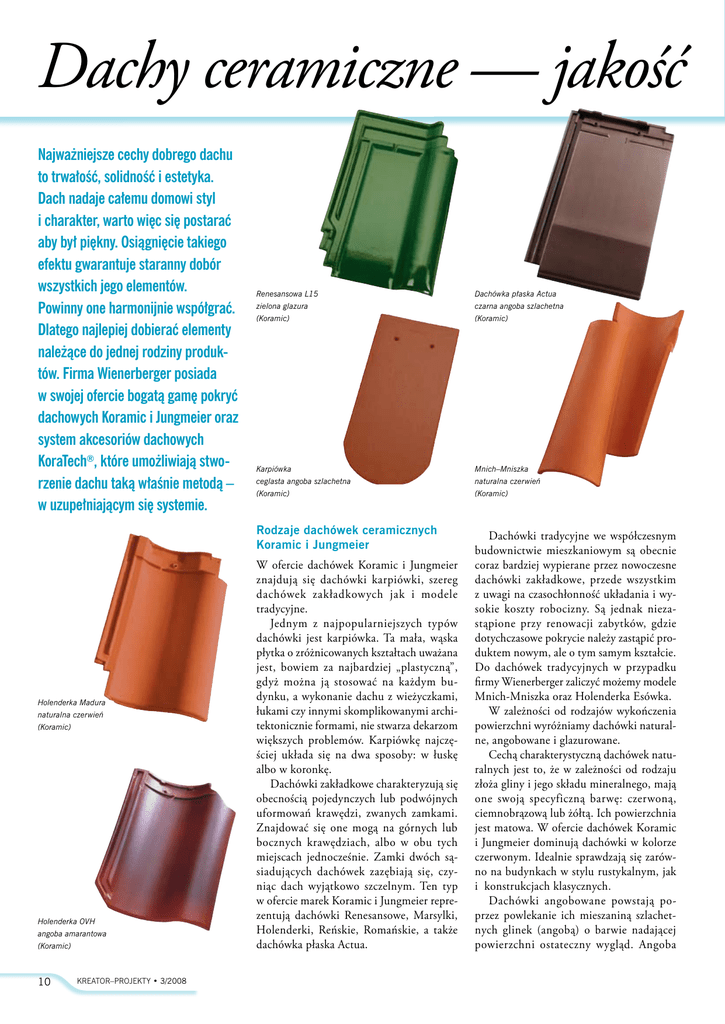 Dachy ceramiczne — jakość Najważniejsze cechy dobrego dachu to trwałość, solidność i estetyka. Dach nadaje całemu domowi styl i charakter, warto więc się postarać aby był piękny. Osiągnięcie takiego efektu gwarantuje staranny dobór wszystkich jego elementów. Powinny one harmonijnie współgrać. Dlatego najlepiej dobierać elementy należące do jednej rodziny produktów. Firma Wienerberger posiada w swojej ofercie bogatą gamę pokryć dachowych Koramic i Jungmeier oraz system akcesoriów dachowych KoraTech®, które umożliwiają stworzenie dachu taką właśnie metodą – w uzupełniającym się systemie. Renesansowa L15 Dachówka płaska Actua zielona glazura czarna angoba szlachetna (Koramic) (Koramic) Karpiówka Mnich–Mniszka ceglasta angoba szlachetna naturalna czerwień (Koramic) (Koramic) Rodzaje dachówek ceramicznych Koramic i Jungmeier Holenderka Madura naturalna czerwień (Koramic) Holenderka OVH angoba amarantowa (Koramic) 10 KREATOR–PROJEKTY • 3/2008 W ofercie dachówek Koramic i Jungmeier znajdują się dachówki karpiówki, szereg dachówek zakładkowych jak i modele tradycyjne. Jednym z najpopularniejszych typów dachówki jest karpiówka. Ta mała, wąska płytka o zróżnicowanych kształtach uważana jest, bowiem za najbardziej „plastyczną”, gdyż można ją stosować na każdym budynku, a wykonanie dachu z wieżyczkami, łukami czy innymi skomplikowanymi architektonicznie formami, nie stwarza dekarzom większych problemów. Karpiówkę najczęściej układa się na dwa sposoby: w łuskę albo w koronkę. Dachówki zakładkowe charakteryzują się obecnością pojedynczych lub podwójnych uformowań krawędzi, zwanych zamkami. Znajdować się one mogą na górnych lub bocznych krawędziach, albo w obu tych miejscach jednocześnie. Zamki dwóch sąsiadujących dachówek zazębiają się, czyniąc dach wyjątkowo szczelnym. Ten typ w ofercie marek Koramic i Jungmeier reprezentują dachówki Renesansowe, Marsylki, Holenderki, Reńskie, Romańskie, a także dachówka płaska Actua. Dachówki tradycyjne we współczesnym budownictwie mieszkaniowym są obecnie coraz bardziej wypierane przez nowoczesne dachówki zakładkowe, przede wszystkim z uwagi na czasochłonność układania i wysokie koszty robocizny. Są jednak niezastąpione przy renowacji zabytków, gdzie dotychczasowe pokrycie należy zastąpić produktem nowym, ale o tym samym kształcie. Do dachówek tradycyjnych w przypadku firmy Wienerberger zaliczyć możemy modele Mnich-Mniszka oraz Holenderka Esówka. W zależności od rodzajów wykończenia powierzchni wyróżniamy dachówki naturalne, angobowane i glazurowane. Cechą charakterystyczną dachówek naturalnych jest to, że w zależności od rodzaju złoża gliny i jego składu mineralnego, mają one swoją specyficzną barwę: czerwoną, ciemnobrązową lub żółtą. Ich powierzchnia jest matowa. W ofercie dachówek Koramic i Jungmeier dominują dachówki w kolorze czerwonym. Idealnie sprawdzają się zarówno na budynkach w stylu rustykalnym, jak i konstrukcjach klasycznych. Dachówki angobowane powstają poprzez powlekanie ich mieszaniną szlachetnych glinek (angobą) o barwie nadającej powierzchni ostateczny wygląd. Angoba i charakter ekspert radzi © wienerberger nierozerwalnie łączy się z naturalnym podłożem dachówek i nadaje im wykończeni półmatowe. Dachówki powleczone angobą szlachetną są natomiast bardziej błyszczące. Dachówki angobowane cechuje większa od naturalnych odporność na zabrudzenia oraz porastanie glonami czy mchem. Dachówki glazurowane powstają dzięki nałożeniu specjalnego szkliwa, które w procesie wypalania topi się, nadając płytce gładką, błyszcząca powierzchnię, która z efekcie jest najbardziej odporna na porastanie i wszelkie zabrudzenia. Błyszczące dachówki wspaniale korespondują z eleganckimi budowlami, o nowoczesnym, awangardowym charakterze. Zalety dachówek ceramicznych Dachówki Koramic i Jungmeier to produkty całkowicie naturalne. Dzięki tej właściwości ceramiczne pokrycie dachowe tworzy bardzo korzystny mikroklimat domu. Dachówki potrafią również dobrze akumulować ciepło. Sprawia to, że poddasze latem się nie przegrzewa, pozytywnie wpływając na komfort zamieszkiwania. Dzięki starannemu doborowi surowca, optymalizacji składników, najnowocześniejszym technologiom produkcji i tradycji wyrobu ceramiki, dachówki Koramic i Jungmeier są szczególnie odporne na działanie mrozu, co potwierdza 30-letnia gwarancja oferowana przez producenta. Niezwykle bogaty asortyment różnorodnych kolorów dachówek Koramic i Jungmeier, faktur oraz kształtów stwarza możliwość wykonania dachu o estetyce nieporównywalnej z żadnym innym rodzajem pokrycia dachowego. Trwałe i szczelne pokrycia dachowe Wybór modelu dachówki nie zależy jednak wyłącznie od względów estetycznych, ale także od kształtu i kąta nachylenia połaci dachowej. Im, bowiem dach jest bardziej stromy, tym woda spływa z niego szybciej, a tym samym pozwala to na zastosowanie pokrycia o mniejszej szczelności. W przypadku dachu o mniejszym kącie nachylenia producent zaleca zastosowanie szczelnego dachu spodniego jako poszycia z desek lub płyt, a następnie pokrycie ich membraną KoraTech®. Dzięki takiemu rozwiązaniu woda, która przedostanie się przez pokrycie ceramiczne zostanie odprowadzona po warstwie spodniej. Dachówka powinna mieć również możliwość szybkiego wysychania. Jej brak powoduje, bowiem z jednej strony zjawisko zielenienia się dachów, drugiej wpływa na trwałość dachu i jego stabilność. Aby uniknąć ryzyka uszkodzenia konstrukcji dachu, zachować parametry termiczne izolacji oraz właściwości estetyczne dachówek należy pamiętać o zapewnieniu pokryciom właściwej wentylacji. Wentylacja dachu polega, bowiem na stworzeniu możliwości nawiewu i wywiewu w dachu. Nawiew najczęściej jest realizowany przez szczelinę w strefie okapu, a wywie
