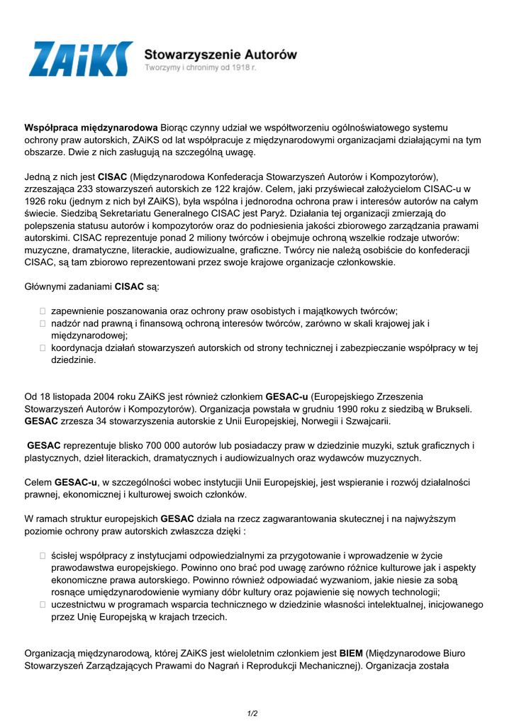 Współpraca międzynarodowa Biorąc czynny udział we współtworzeniu ogólnoświatowego systemu ochrony praw autorskich, ZAiKS od lat współpracuje z międzynarodowymi organizacjami działającymi na tym obszarze. Dwie z nich zasługują na szczególną uwagę. Jedną z nich jest CISAC (Międzynarodowa Konfederacja Stowarzyszeń Autorów i Kompozytorów), zrzeszająca 233 stowarzyszeń autorskich ze 122 krajów. Celem, jaki przyświecał założycielom CISAC-u w 1926 roku (jednym z nich był ZAiKS), była wspólna i jednorodna ochrona praw i interesów autorów na całym świecie. Siedzibą Sekretariatu Generalnego CISAC jest Paryż. Działania tej organizacji zmierzają do polepszenia statusu autorów i kompozytorów oraz do podniesienia jakości zbiorowego zarządzania prawami autorskimi. CISAC reprezentuje ponad 2 miliony twórców i obejmuje ochroną wszelkie rodzaje utworów: muzyczne, dramatyczne, literackie, audiowizualne, graficzne. Twórcy nie należą osobiście do konfederacji CISAC, są tam zbiorowo reprezentowani przez swoje krajowe organizacje członkowskie. Głównymi zadaniami CISAC są: zapewnienie poszanowania oraz ochrony praw osobistych i majątkowych twórców; nadzór nad prawną i finansową ochroną interesów twórców, zarówno w skali krajowej jak i międzynarodowej; koordynacja działań stowarzyszeń autorskich od strony technicznej i zabezpieczanie współpracy w tej dziedzinie. Od 18 listopada 2004 roku ZAiKS jest również członkiem GESAC-u (Europejskiego Zrzeszenia Stowarzyszeń Autorów i Kompozytorów). Organizacja powstała w grudniu 1990 roku z siedzibą w Brukseli. GESAC zrzesza 34 stowarzyszenia autorskie z Unii Europejskiej, Norwegii i Szwajcarii. GESAC reprezentuje blisko 700 000 autorów lub posiadaczy praw w dziedzinie muzyki, sztuk graficznych i plastycznych, dzieł literackich, dramatycznych i audiowizualnych oraz wydawców muzycznych. Celem GESAC-u, w szczególności wobec instytucjii Unii Europejskiej, jest wspieranie i rozwój działalności prawnej, ekonomicznej i kulturowej swoich członków. W ramach struktur europejskich GESAC działa na rzecz zagwarantowania skutecznej i na najwyższym poziomie ochrony praw autorskich zwłaszcza dzięki : ścisłej współpracy z instytucjami odpowiedzialnymi za przygotowanie i wprowadzenie w życie prawodawstwa europejskiego. Powinno ono brać pod uwagę zarówno różnice kulturowe jak i aspekty ekonomiczne prawa autorskiego. Powinno również odpowiadać wyzwaniom, jakie niesie za sobą rosnące umiędzynarodowienie wymiany dóbr kultury oraz pojawienie się nowych technologii; uczestnictwu w programach wsparcia technicznego w dziedzinie własności intelektualnej, inicjowanego przez Unię Europejską w krajach trzecich. Organizacją międzynarodową, której ZAiKS jest wieloletnim członkiem jest BIEM (Międzynarodowe Biuro Stowarzyszeń Zarządzających Prawami do Nagrań i Reprodukcji Mechanicznej). Organizacja została 1/2 założona w 1929 roku przez Alfonsa Tourniera, a jej działania zmierzają do doskonalenia zarządzania prawami w zakresie nagrań i reprodukcji mechanicznej. BIEM ma swą siedzibę w miejscowości Neuilly-sur-Seine we Francji. Obecnie zrzesza ona 41 stowarzyszeń z 38 krajów. Głównymi zadaniami BIEM-u są: doskonalenie ochrony w zakresie praw mechanicznych; ujednolicanie treści umów o wzajemnej lub jednostronnej reprezentacji w dziedzinie praw mechanicznych, które stowarzyszenia podpisują między sobą; negocjowanie i ujednolicanie umów licencyjnych lub ogólnych warunków korzystania z praw autorskich, z Międzynarodową Federacją Przemysłu Fonograficznego - IFPI; podejmowanie kroków w celu ochrony i zarządzania repertuarem na terytoriach, które nie są objęte zarządem żadnego stowarzyszenia; zabezpieczanie od strony technicznej współpracy pomiędzy stowarzyszeniami oraz pomoc w rozwiązywaniu trudności, które napotykają członkowie BIEM-u. Wszelkie prawa zastrzeżone 2017 ZAiKS / data wygenerowania strony 03.03.2017 15:17:29 PDF ze strony: http://www.zaiks.org.pl/270,163,wspolpraca_miedzynarodowa 2/2