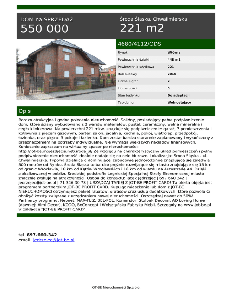 DOM na SPRZEDAŻ 550 000 Środa Śląska, Chwalimierska 221 m2 4680/4112/ODS Rynek Wtórny Powierzchnia działki 448 m2 Powierzchnia użytkowa 221 Rok budowy 2010 Liczba pięter 2 Liczba pokoi 5 Stan budynku Do adaptacji Typ domu Wolnostojący Opis Bardzo atrakcyjna i godna polecenia nieruchomość. Solidny, posiadający pełne podpiwniczenie dom, które ściany wybudowano z 3 warstw materiałów: pustak ceramiczny, wełna mineralna i cegła klinkierowa. Na powierzchni 221 mkw. znajduje się podpiwniczenie: garaż, 3 pomieszczenia i kotłownia z piecem gazowym, parter: salon, jadalnia, kuchnia, pokój, wiatrołap, przedpokój, łazienka, oraz piętro: 3 pokoje i łazienka. Dom został bardzo starannie zaplanowany i wykończony z przeznaczeniem na potrzeby indywidualne. Nie wymaga większych nakładów finansowych. Koniecznie zapraszam na wirtualny spacer po nieruchomości: http://jot-be.mojezdjecia.net/sroda_sl/ Ze względu na charakterystyczny układ pomieszczeń i pełne podpiwniczenie nieruchomość idealnie nadaje się na cele biurowe. Lokalizacja: Środa Śląska - ul. Chwalimierska. Typowa dzielnica o dominującej zabudowie jednorodzinne znajdująca się zaledwie 500 metrów od Rynku. Środa Śląska to bardzo prężnie rozwijające się miasto znajdujące się 15 km od granic Wrocławia, 18 km od Kątów Wrocławskich i 16 km od wjazdu na Autostradę A4. Dzięki zlokalizowanej w pobliżu Średzkiej podstrefie Legnickiej Specjalnej Strefy Ekonomicznej miasto znacznie zyskuje na atrakcyjności. Osoba do kontaktu: Jacek Jędrzejec | 697 660 342 | [email protected] | 71 346 30 78 | URZĄDZAJ TANIEJ Z JOT-BE PROFIT CARD! Ta oferta objęta jest programem partnerskim JOT-BE PROFIT CARD. Kupując mieszkanie lub dom z JOT-BE NIERUCHOMOŚCI otrzymujesz pakiet rabatów, gratisów oraz usług dodatkowych, które pozwolą Ci obniżyć koszty związane z urządzaniem nowej nieruchomości. Oszczędzaj nawet do 50%! Partnerzy programu: Neonet, MAX-FLIZ, BEL-POL, Komandor, Stolbuk Decoral, AD Loving Home (dawniej: Almi Decor), KODO, BoConcept i Wolsztyńska Fabryka Mebli. Szczegóły na www.jot-be.pl w zakładce "JOT-BE PROFIT CARD". tel. 697-660-342 email: [email protected] JOT-BE Nieruchomości Sp.z o.o. Powered by TCPDF (www.tcpdf.org)