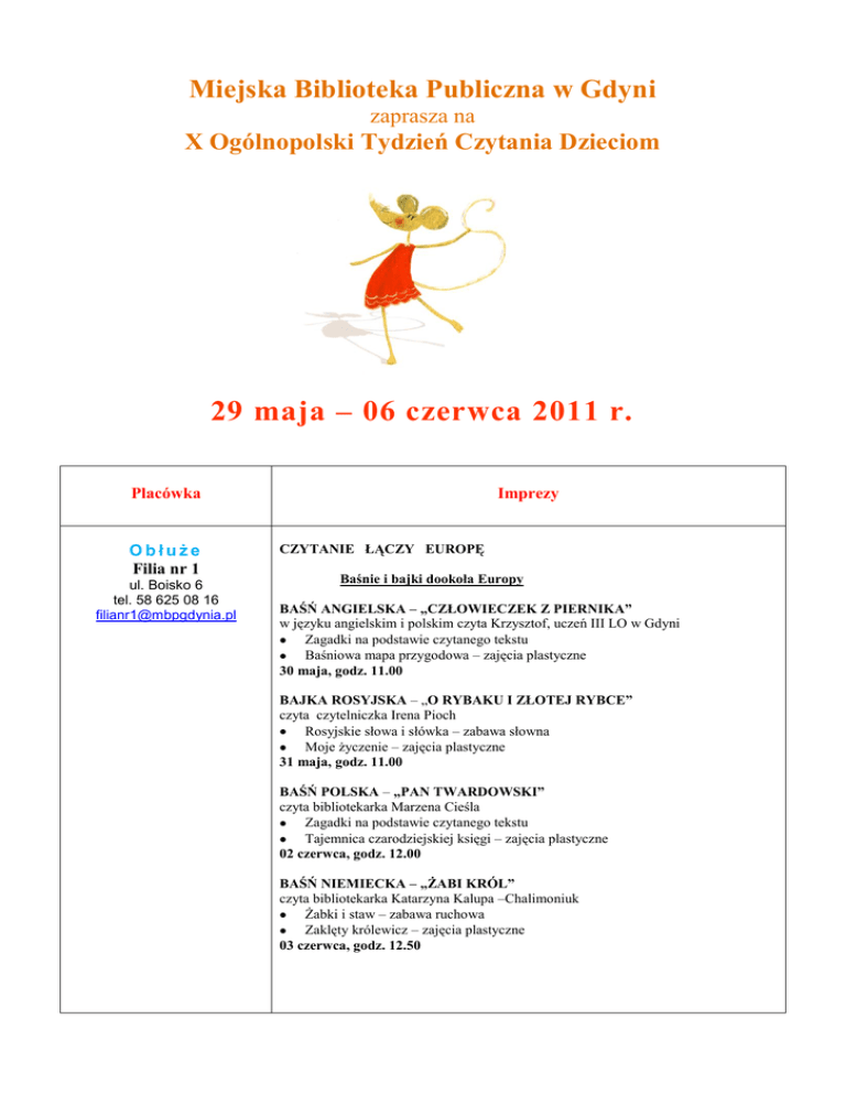 Miejska Biblioteka Publiczna w Gdyni zaprasza na X Ogólnopolski Tydzień Czytania Dzieciom 29 maja – 06 czerwca 2011 r. Placówka Obłuże Filia nr 1 ul. Boisko 6 tel. 58 625 08 16 [email protected] Imprezy CZYTANIE ŁĄCZY EUROPĘ Baśnie i bajki dookoła Europy BAŚŃ ANGIELSKA – „CZŁOWIECZEK Z PIERNIKA” w języku angielskim i polskim czyta Krzysztof, uczeń III LO w Gdyni Zagadki na podstawie czytanego tekstu Baśniowa mapa przygodowa – zajęcia plastyczne 30 maja, godz. 11.00 BAJKA ROSYJSKA – „O RYBAKU I ZŁOTEJ RYBCE” czyta czytelniczka Irena Pioch Rosyjskie słowa i słówka – zabawa słowna Moje życzenie – zajęcia plastyczne 31 maja, godz. 11.00 BAŚŃ POLSKA – „PAN TWARDOWSKI” czyta bibliotekarka Marzena Cieśla Zagadki na podstawie czytanego tekstu Tajemnica czarodziejskiej księgi – zajęcia plastyczne 02 czerwca, godz. 12.00 BAŚŃ NIEMIECKA – „ŻABI KRÓL” czyta bibliotekarka Katarzyna Kalupa –Chalimoniuk Żabki i staw – zabawa ruchowa Zaklęty królewicz – zajęcia plastyczne 03 czerwca, godz. 12.50 Oksywie Filia nr 13 ul. Podchorążych 10a tel. 58 625 48 24 [email protected] Grabówek Filia nr 3 ul. Morska 113 tel. 58 627 09 59 [email protected] CZYTANIE ŁĄCZY EUROPĘ głośne czytanie baśni różnych krajów, m.in. "Baśnie dookoła świata" B. Turskiej, "Południowa łąka" A. Lindgren i "Bajki słowackie - rzemiosło dostatek przyniosło" K. Habovstiakova przez seniorów, którzy podróżują po świecie i chcą się z innymi podzielić się swoimi wrażeniami Dla chętnych dzieci 30, 31 maja, godz. 10.30 i 12.00 CAŁA POLSKA CZYTA DZIECIOM „26 Bajek z Afryki” – czyta Danuta Wołukanis z „Domu Książki” Dla chętnych dzieci 30 maja, godz. 10.30 „Opowiadania dla dzieci” Isaaca Singera – czyta Zenon Roda Dla dzieci z SP nr 17 31 maja, godz. 10.30 Baśń japońską „ O chłopcu który rysował koty” – czyta wiceprzewodnicząca Rady Dzielnicy Edyta Sieracka-Zięba Dla chętnych dzieci 02 czerwca, godz. 10.30 Baśń "Mały Kadi" ze zbioru "Najpiękniejszych baśni z 1001 nocy" – czyta polonistka Teresa Dyszlewicz Dla chętnych dzieci 02 czerwca, godz. 17.00 „Bajkę o złotym koguciku” Aleksandra Puszkina – czyta bibliotekarka Dorota Gawin Dla dzieci z Przedszkola nr 36 03 czerwca, godz. 17.00 Chylonia Filia nr 12 ul. Opata Hackiego 33 tel. 58 623 00 11 [email protected] „CZYTANIE ŁĄCZY EUROPĘ” PONIEDZIAŁEK 30 maja – DZIEŃ SZWEDZKI 10.30 – 11.30 „Baśnie kaszubskie” w wykonaniu aktorów z Teatru Niewielkiego z Gdańska 15.30 – 16.00 Głośne czytanie bajki Ulfa Starka „ Jak tata pokazał mi wszechświat” WTOREK 31maja – DZIEŃ POLSKI 10.30 – 11.30 „Zaczarowane historie” Marii Ewy Letki czyta zaproszony gość - ksiądz dr Jacek Socha, proboszcz parafii św. Mikołaja CZWARTEK 02 czerwca – DZIEŃ SZWEDZKI 10.00 – 10.30 Książkę „Kamyki Astona” Lotty Geffenblad czyta zaproszony gość – Marek Dąbkowski, przewodniczący Rady Dzielnicy Chylonia, Dyrektor SP nr 10 15.00 – 15.30 „Billy i tajemniczy kot” Birgitty Stenberg czyta zaproszony gość pani Teresa – pielęgniarka PIĄTEK 03 czerwca – DZIEŃ ANGIELSKI 10.30 – 11.00 „Paddington zwiedza miasto” Michaela Bonda czyta zaproszony gość – przedstawiciel Straży Miejskiej 17.00 - 17.30 Dzieciom uczęszczającym do Czytelni czyta gość - Szymon Pałubicki, Radny Dzielnicy Chylonia SOBOTA 04 czerwca – DZIEŃ HOLENDERSKI 12.00 – 12.30 Głośne czytanie bajki „Wielki bal dla Tygryska” Janoscha Chylonia Filia nr 18 ul. Kartuska 20 tel. 58 623 39 71 [email protected] Wzgórze św. Maksymiliana Filia nr 10 ul. Biskupa Dominika 3 tel. 58 622 18 51 [email protected] TYDZIEŃ GŁOŚNEGO CZYTANIA zapraszamy wszystkie chętne dzieci oraz ich mamy na seanse głośnego czytania. Spotkacie ciekawe osoby, które poczytają Wam swoje ulubione bajki 03, 06 i 07 czerwca, godz. 16.30 FESTYN Z OKAZJI DNIA DZIECKA Miejski Ośrodek Pomocy Społecznej w Gdyni oraz Miejska Biblioteka Publiczna w Gdyni zapraszają dzieci oraz ich rodziców do udziału w świętowaniu Dnia Dziecka. Głośne czytanie, malowanie buziek i maski, przedstawienie teatrzyku dziecięcego oraz konkurs karaoke, muzyka na żywo i zabawy ruchowe, konkursy czytelnicze z nagrodami niespodziankami i wiele innych radosnych zabaw. 04 czerwca, godz. 11.00 – 13.00 CAŁA POLSKA CZYTA DZIECIOM CZYTANIE ŁĄCZY EUROPĘ Dla dzieci w wieku 5-8 lat Głośne czytanie książek połączone z zabawą pacynkami: 02 czerwca, godz. 16.00 – bajki czeskie 03 czerwca, godz. 16.00 – bajki francuskie 04 czerwca, godz. 12.00 – bajki angielskie 07 czerwca, godz. 16.00 – bajki fińskie SPOTKANIA AUTORSKIE Z AGATĄ PÓŁTORAK z autorką książek dla dzieci m. in. „Szmatki z tęczowej szufladki”, „Mała wiedźma Jagodzia” Dla dzieci w wieku 5-8 lat 03 czerwca, godz. 10.30 NIE-ŚPIĄCA KRÓLEWNA Przedstawienie teatralne dla dzieci promujące zasady bezpieczeństwa na drodze Dla wszystkich chętnych 06 czerwca, godz. 13.00 Bohaterowie moich ulubionych książek – konkurs plastyczny Dla dzieci w wieku 7-12 lat 02-09 czerwca, godz. 17.00 Karwiny Filia nr 14 ul. Brzechwy 3/5 tel. 58 629 16 25 [email protected] CZYTANIE ŁĄCZY EUROPĘ głośne czytanie książki „Gdzie Portugalczyk wygrzewa stopy, czyli Podróże w głąb Europy” Ł. Dębskiego Dla dzieci w wieku 4 – 7 lat 30 i 31 maja, godz. 11.00 PODRÓŻ DO KRAINY ZABAWY głośne czytanie fragmentów książki E. Pałasz „Potwór Dyzio i Kraina Zabawy” z wykorzystaniem elementów pedagogiki zabawy Dla dzieci w wieku 4 - 6 lat 02 i 03 czerwca, godz. 11.00 Śródmieście Filia nr 2 ul. Żeromskiego 36 tel. 58 661-66-48 CZYTANIE ŁĄCZY EUROPĘ PODRÓŻE PO LITERATURZE głośne czytanie bajek z różnych krajów oraz pogadanka na temat ciekawostek dotyczących poszczególnych państw Dla chętnych dzieci [email protected] Jaś i Małgosia opowiadają o naszych sąsiadach z Niemiec 30 maja, go